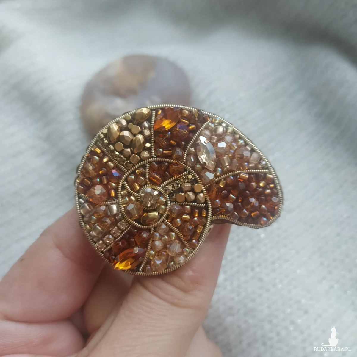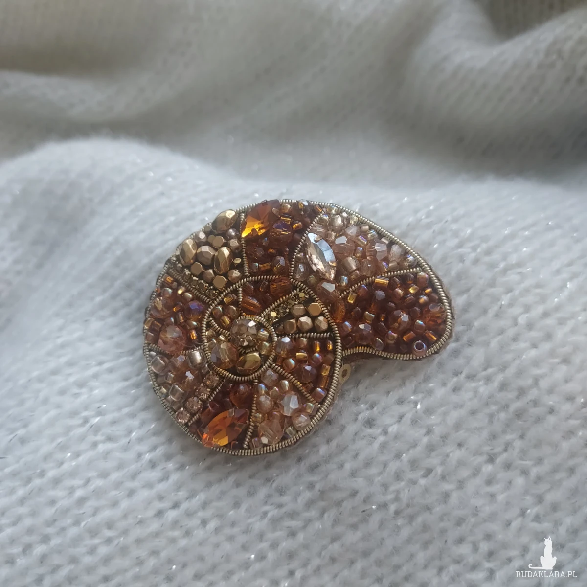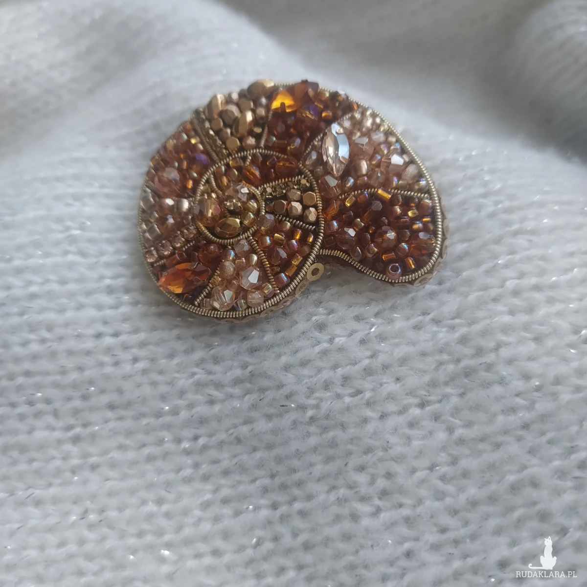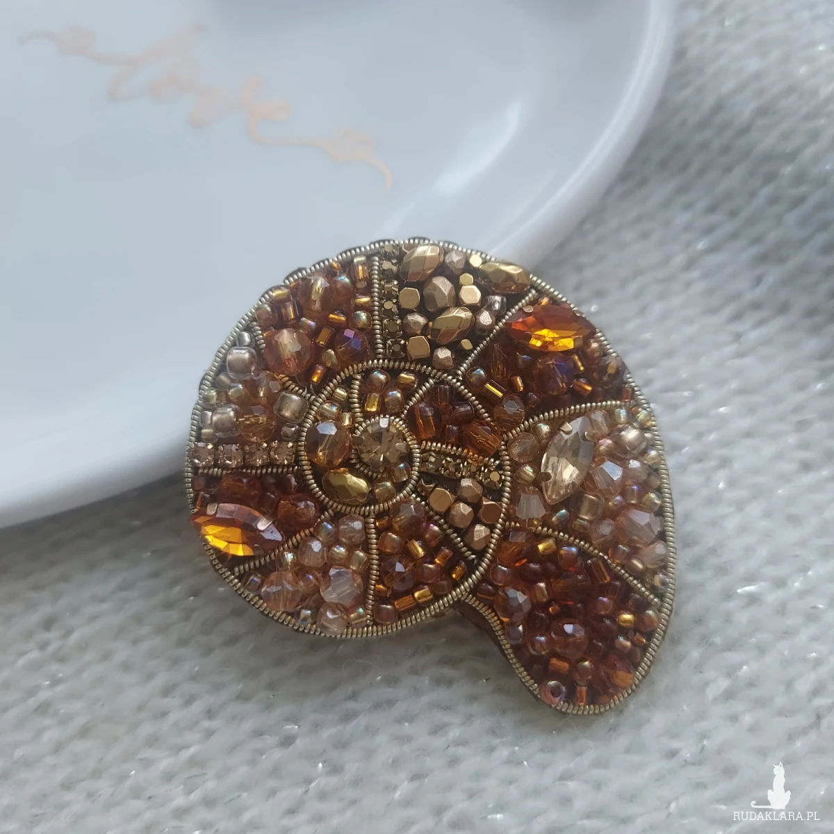 Broszka MUSZLA orginalna, niepowtarzalna urocza - w kolorze bursztynu, szampana i złota.