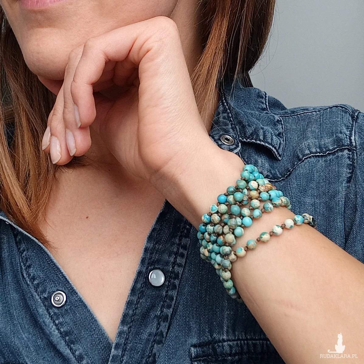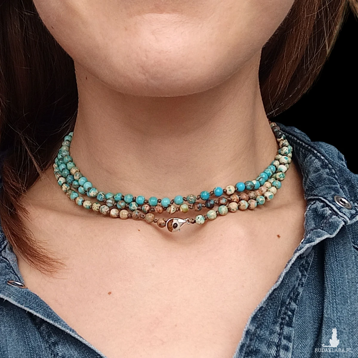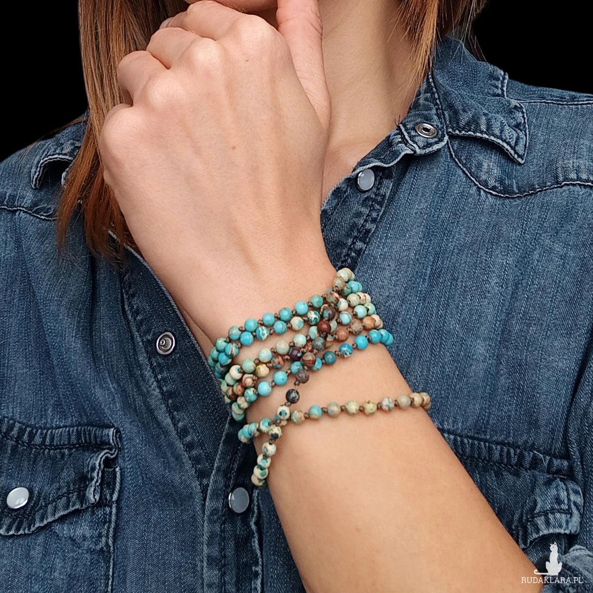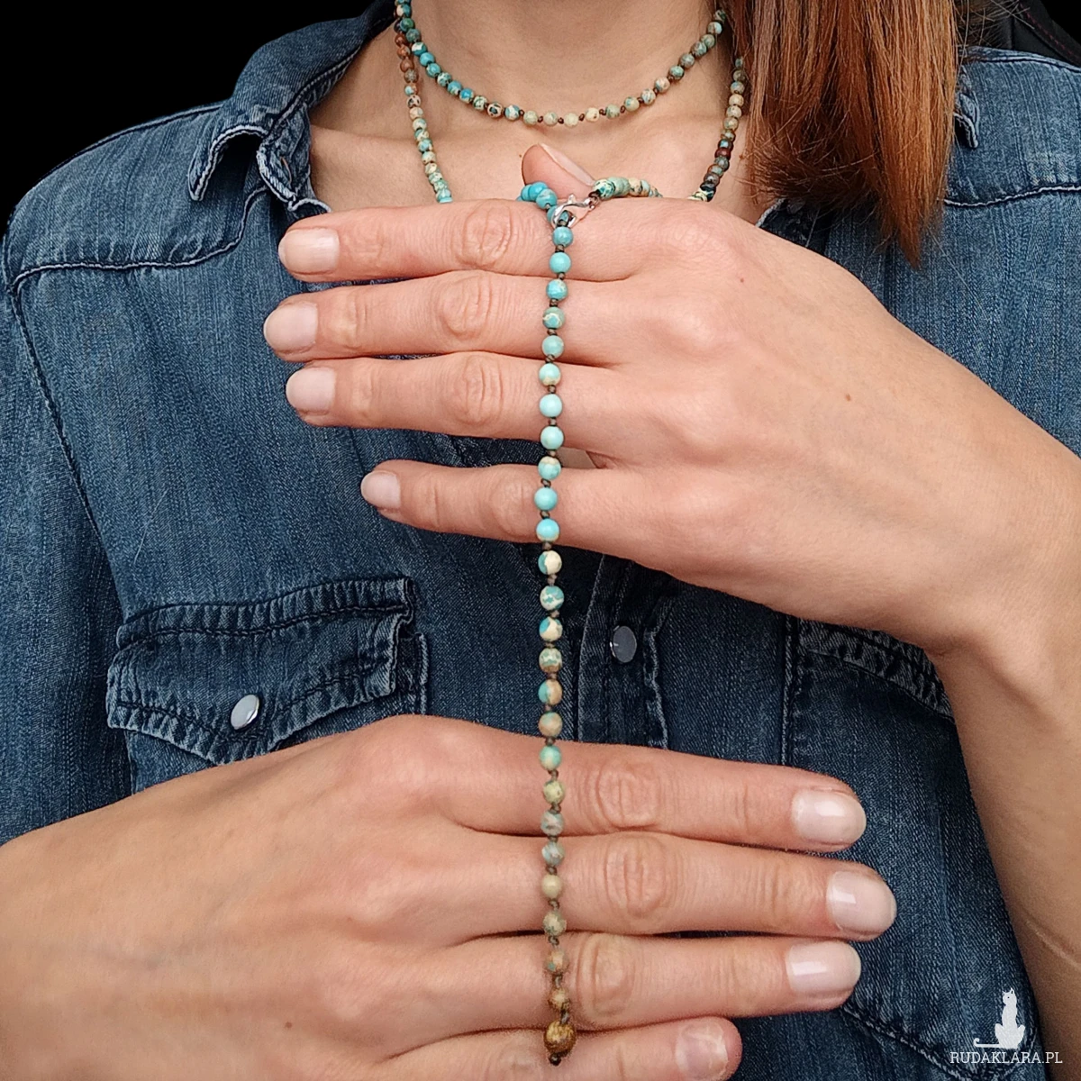 Jest zrobiony z maleńkich jaspisów połączonych sznurkiem.