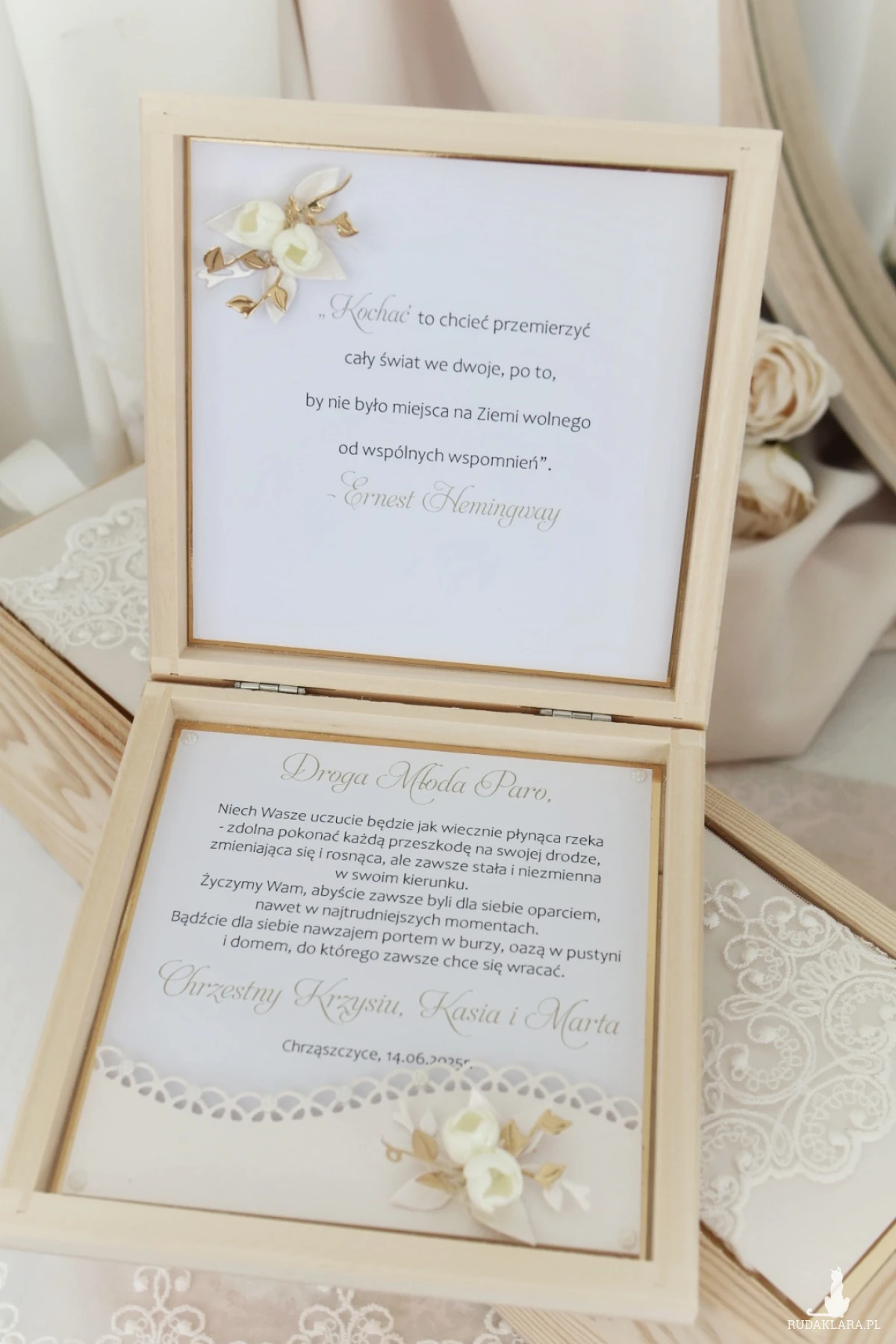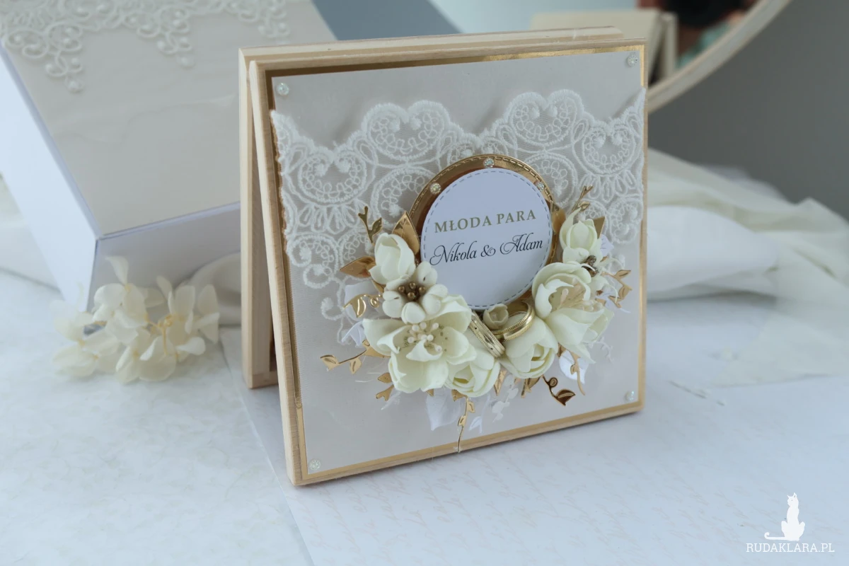 Wpiszę imiona, datę, życzenia i cytat, a całość utrzymana jest w kremowo-złotej elegancji z delikatną koronką.