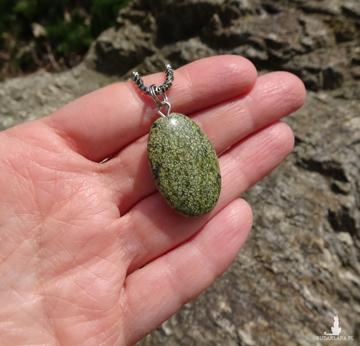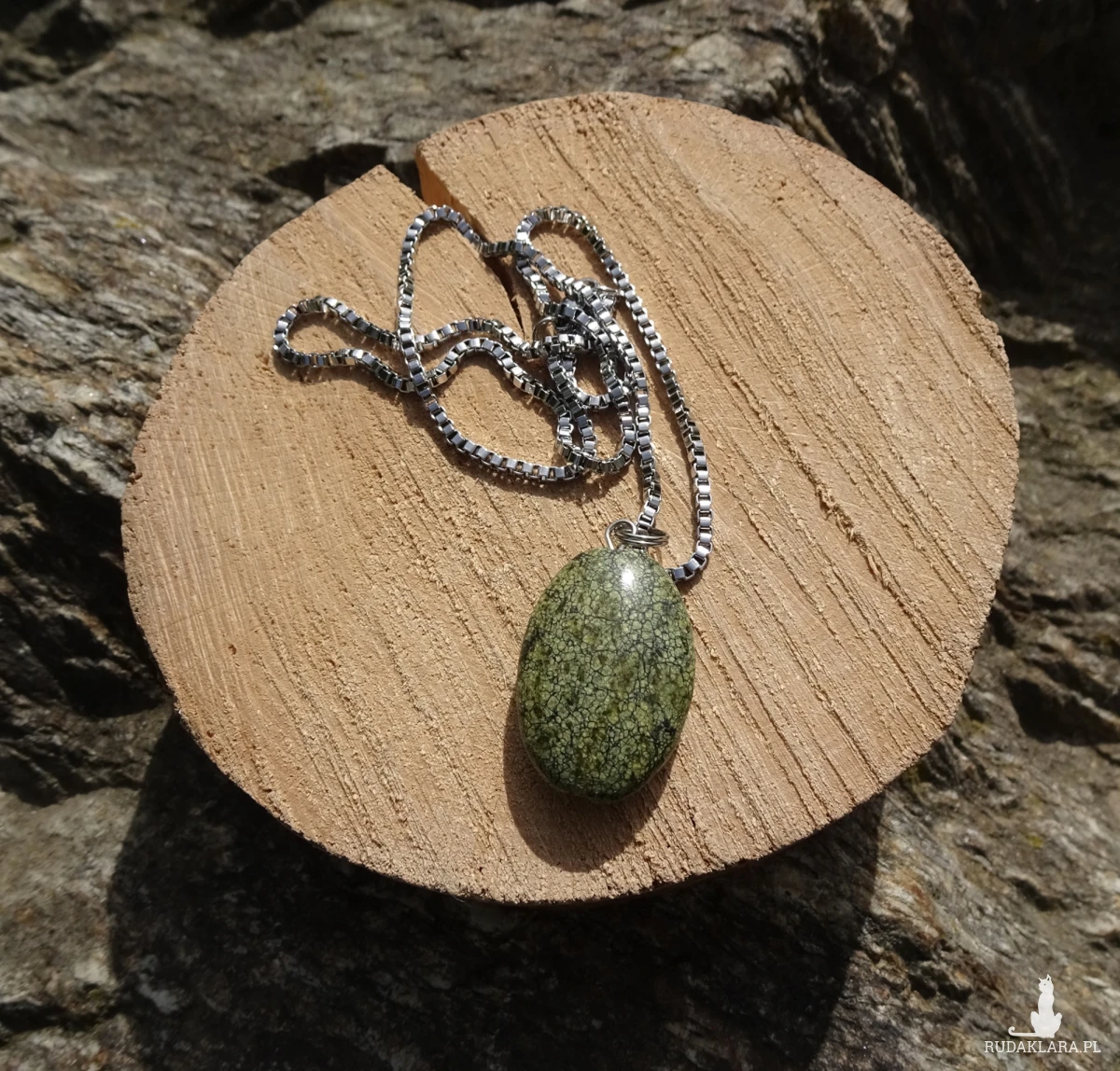Wisiorek z łańcuszka ze stali chirurgicznej i zawieszki z zielonego jaspisu w kształcie łezki o wymiarach ok. 3,7x1,9cm. Długość z zapięciem 45cm.