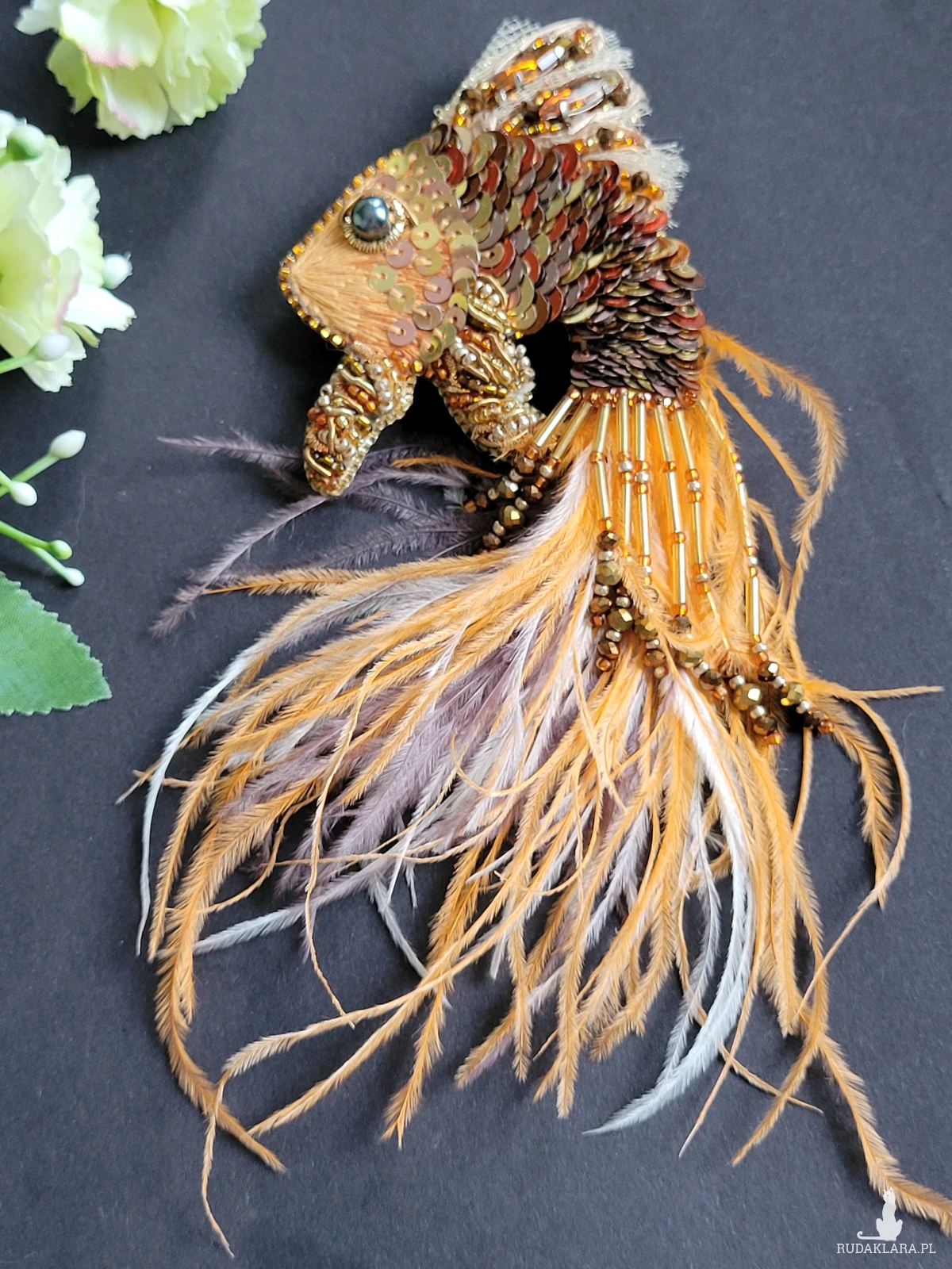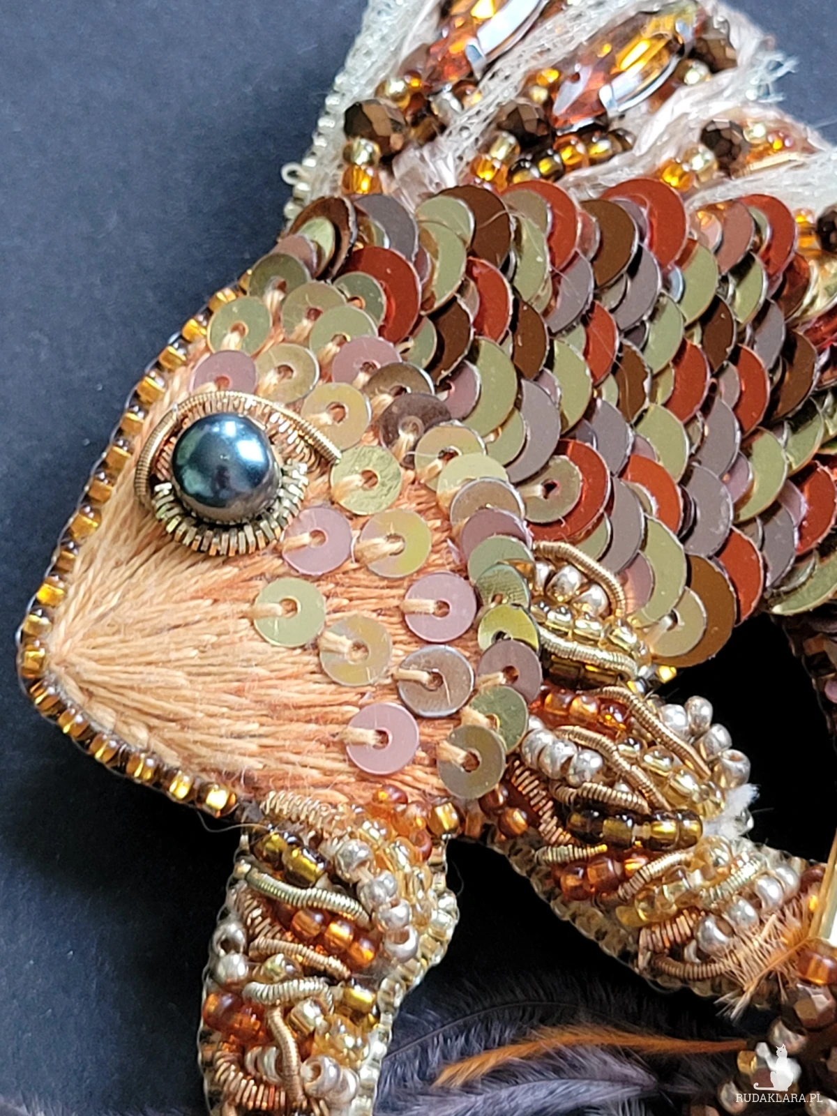 Unikatowa, ręcznie haftowana broszka w kształcie niezwykłej ryby. Połączenie lśniących cekinów, koralików, kryształków i piór sprawia, że ten dodatek jest prawdziwym dziełem sztuki!