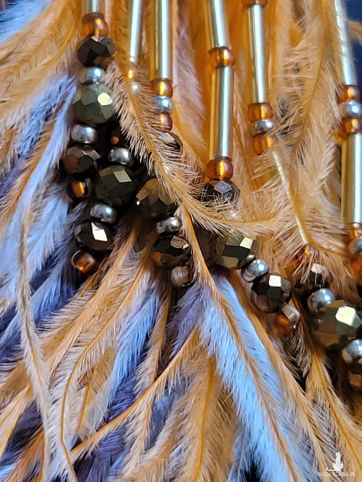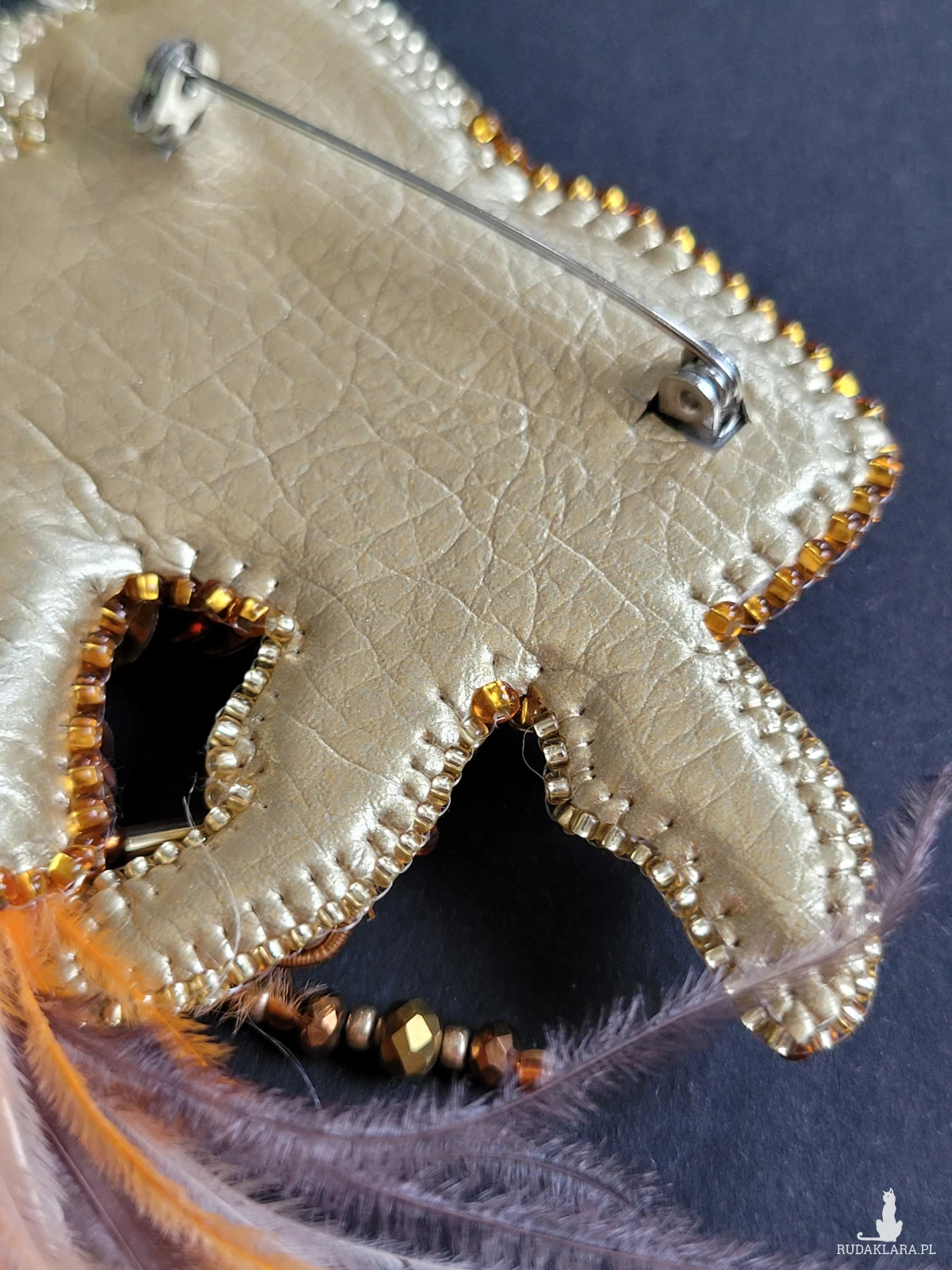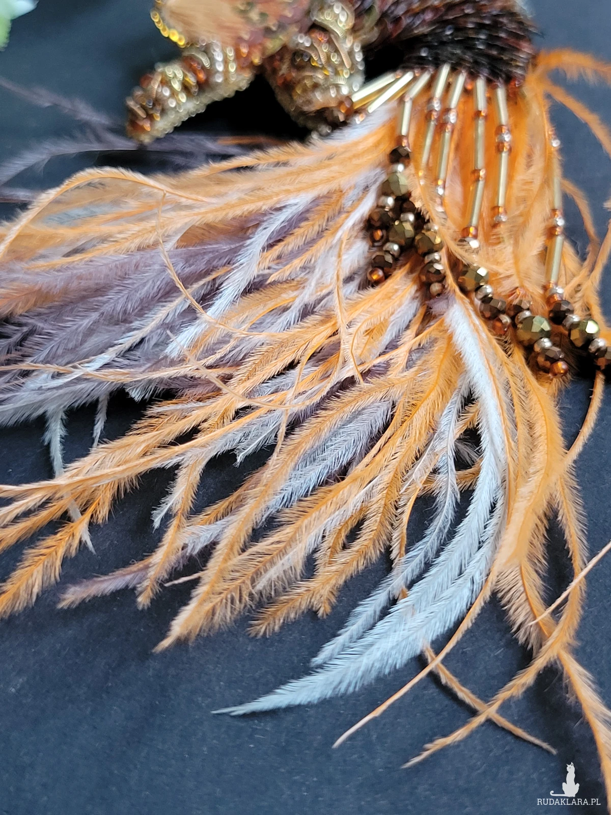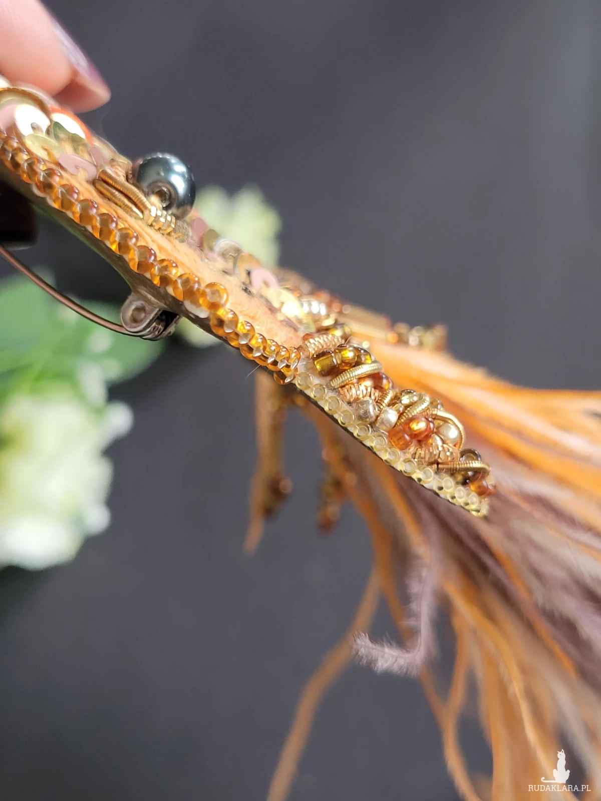 🧡💛🤎 Odcienie ecru, złota, beżu i pomaranci nadają broszce elegancji i magicznego uroku. Pióra subtelnie poruszają się przy każdym ruchu i nadają lekkości.