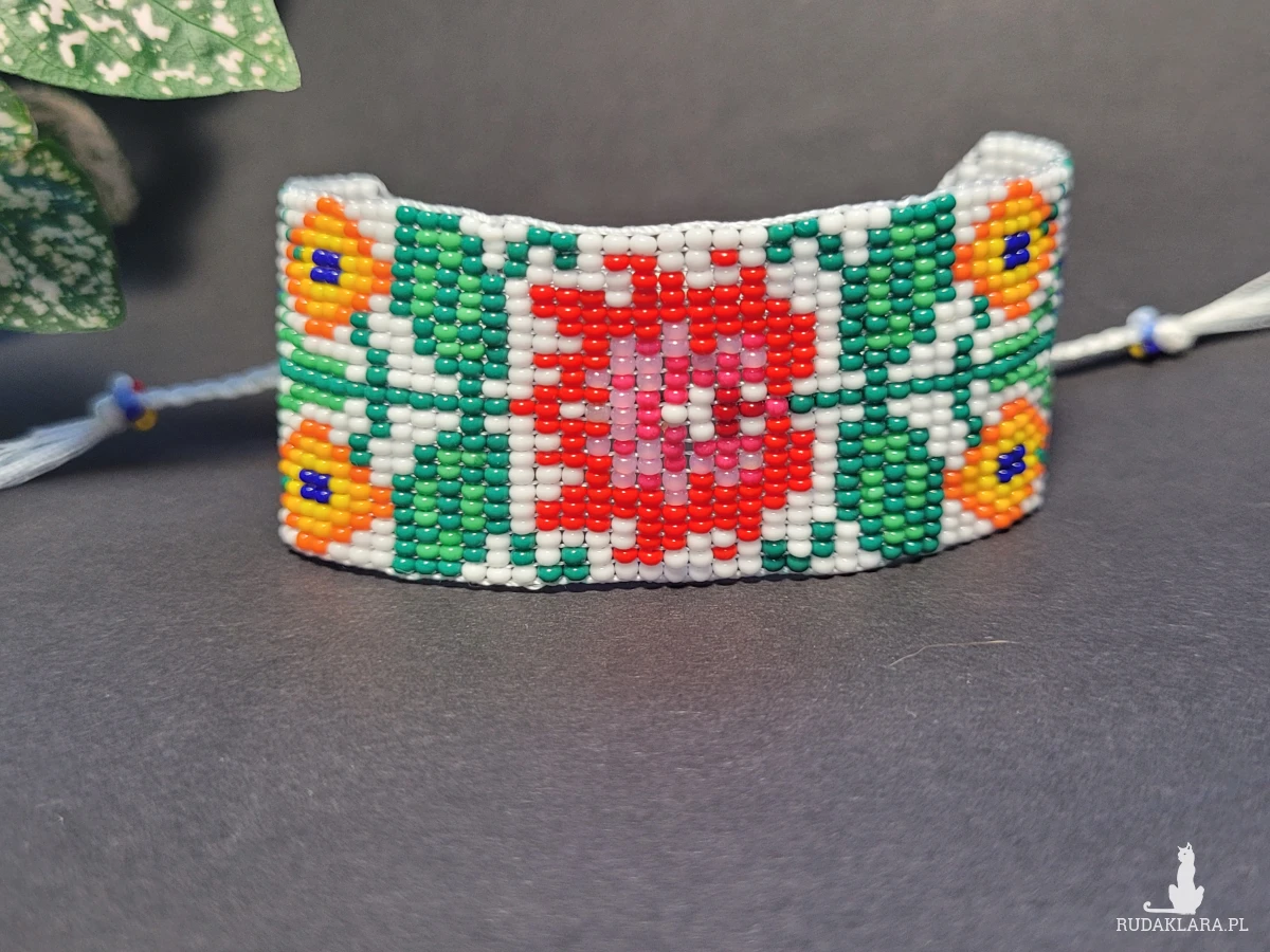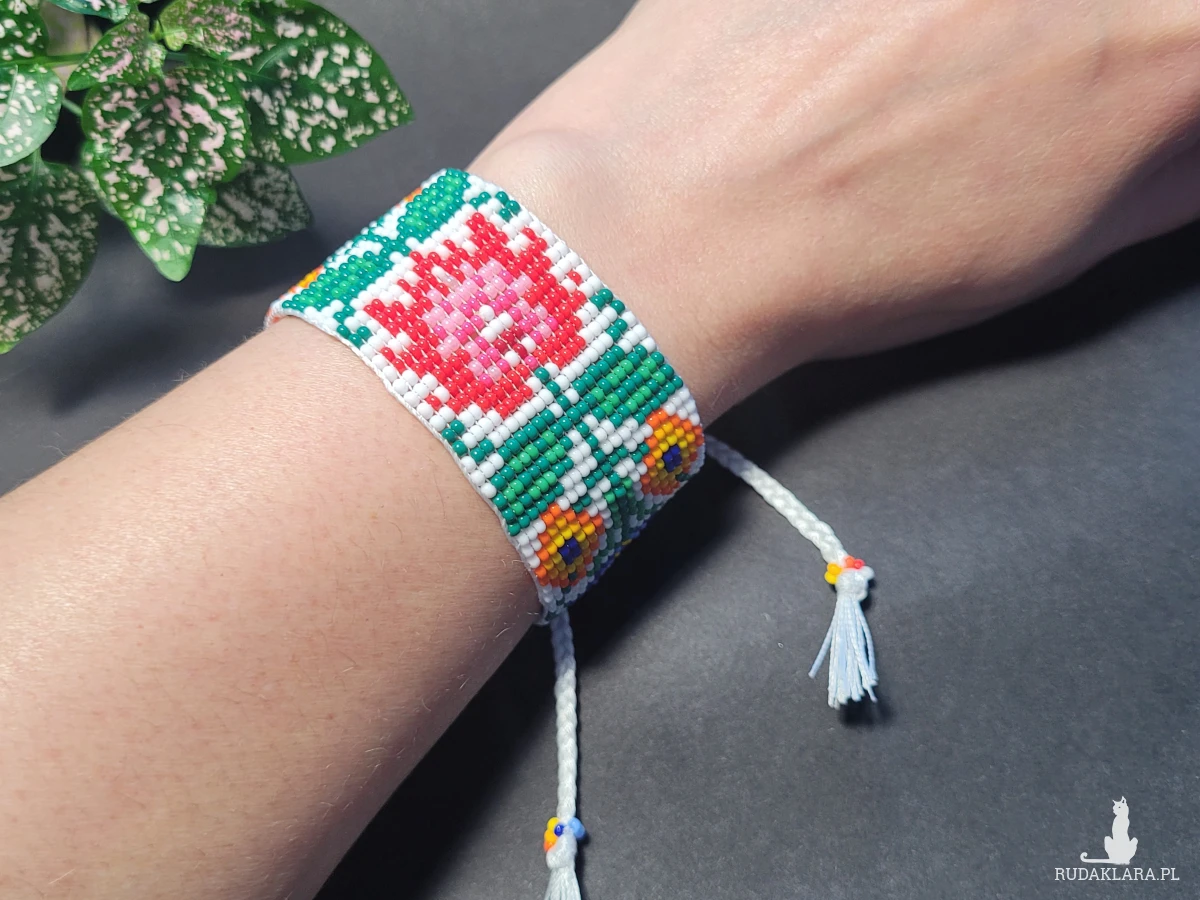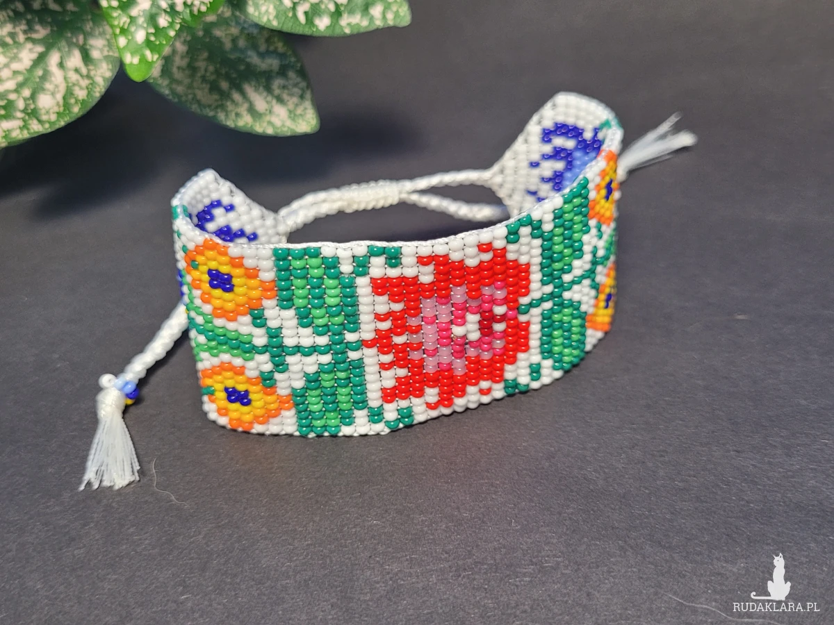 Bransoletka z wielobarwnymi kwiatami na białym tle, inspirowana tradycyjnym polskim motywem etnicznym wytkana na krosnie z koralików czeskich Preciosa.