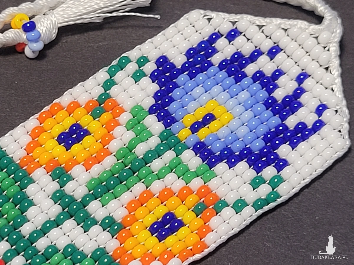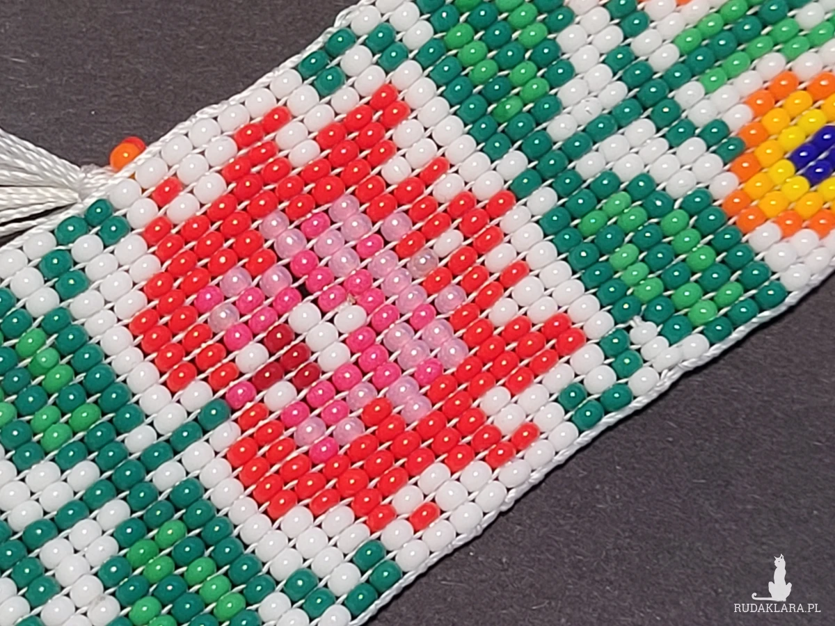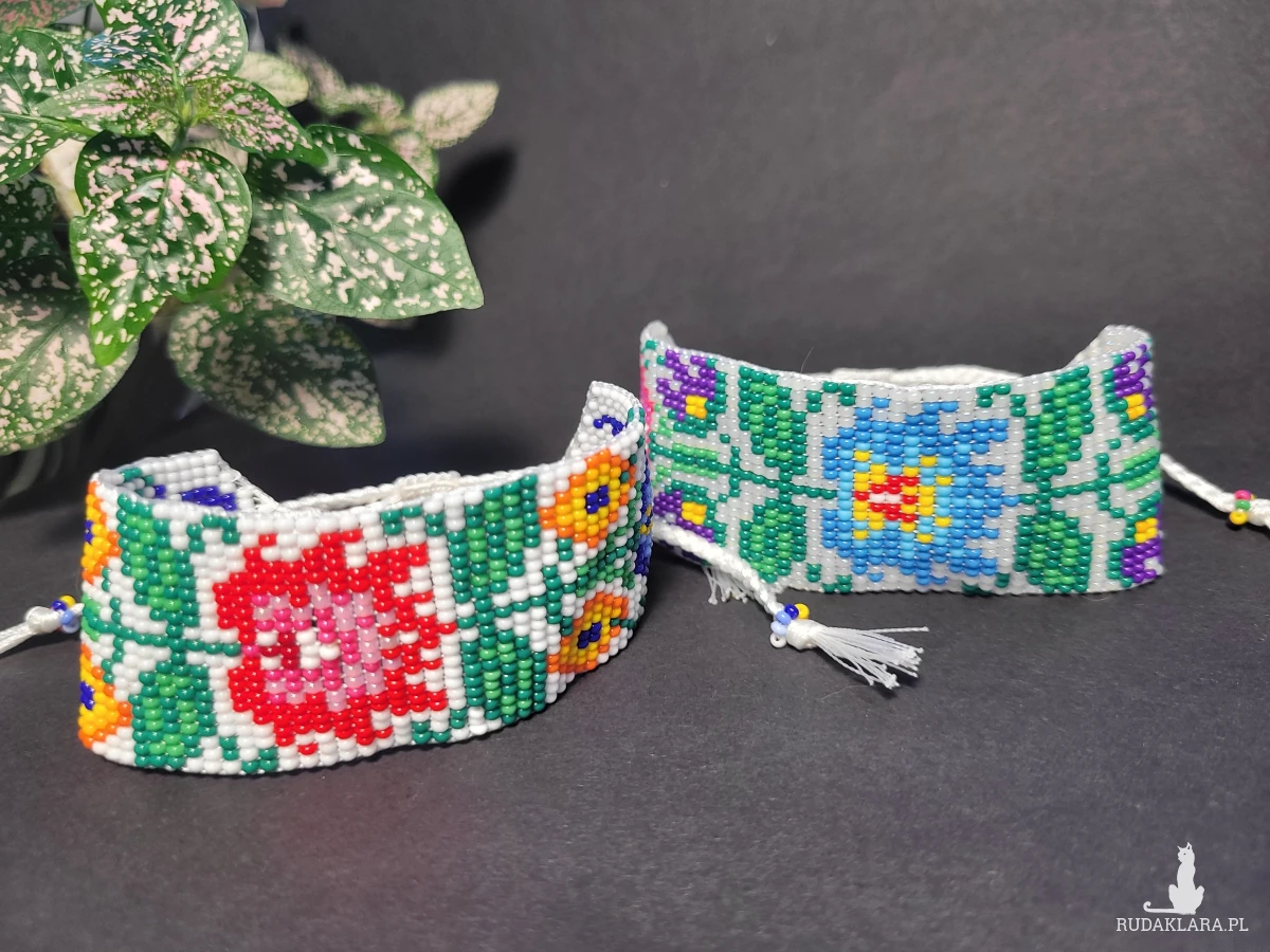 Bransoletka z wielobarwnymi kwiatami na białym tle, inspirowana tradycyjnym polskim motywem etnicznym wytkana na krosnie z koralików czeskich Preciosa.