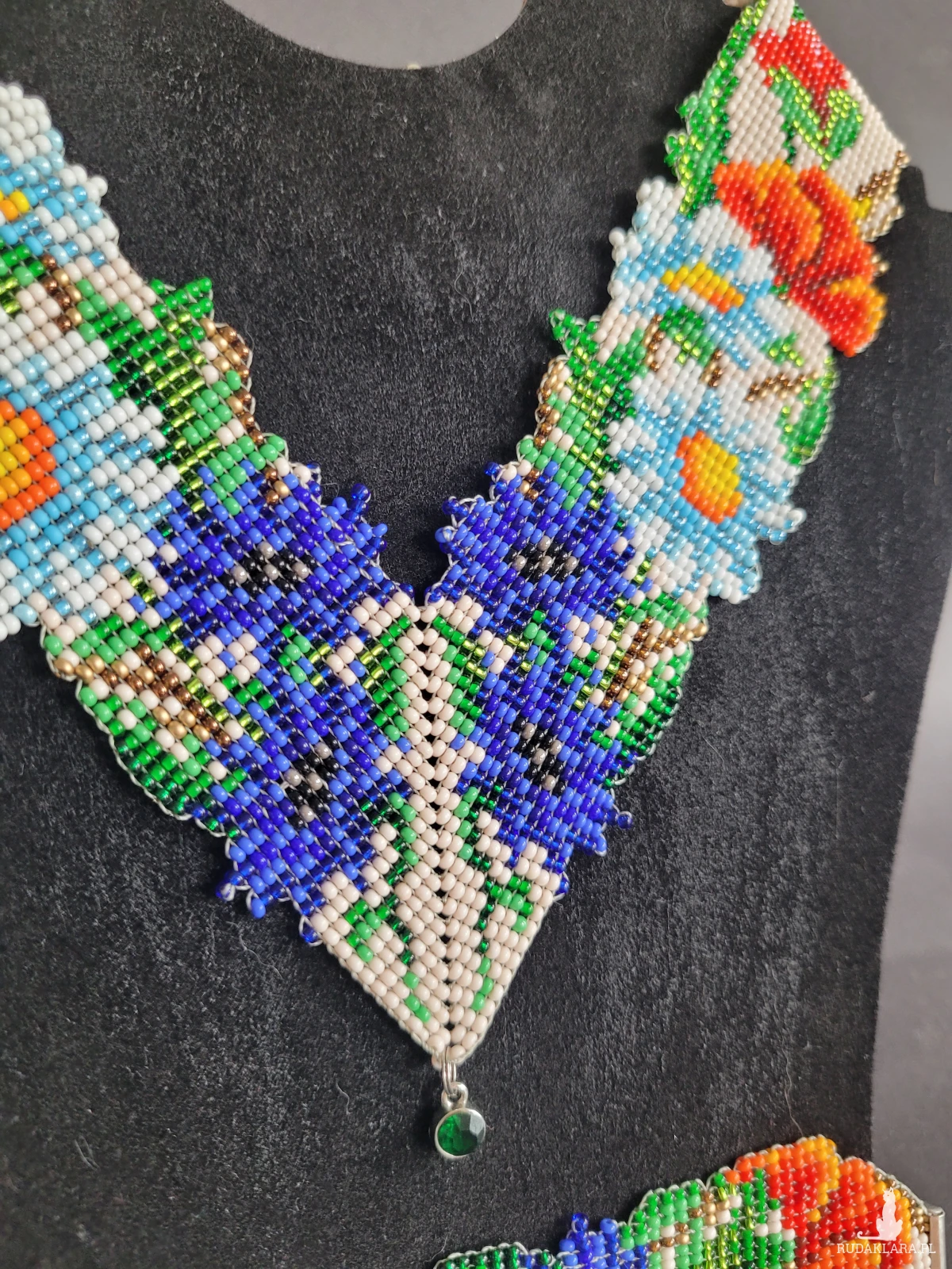Unikatowy komplet biżuterii wykonany ręcznie metodą tkania koralikami. Wzór inspirowany naturą – piękne kwiaty w intensywnych barwach (niebieskie, żółte, białe i zielone) tworzą niezwykle efektowną i elegancką kompozycję.