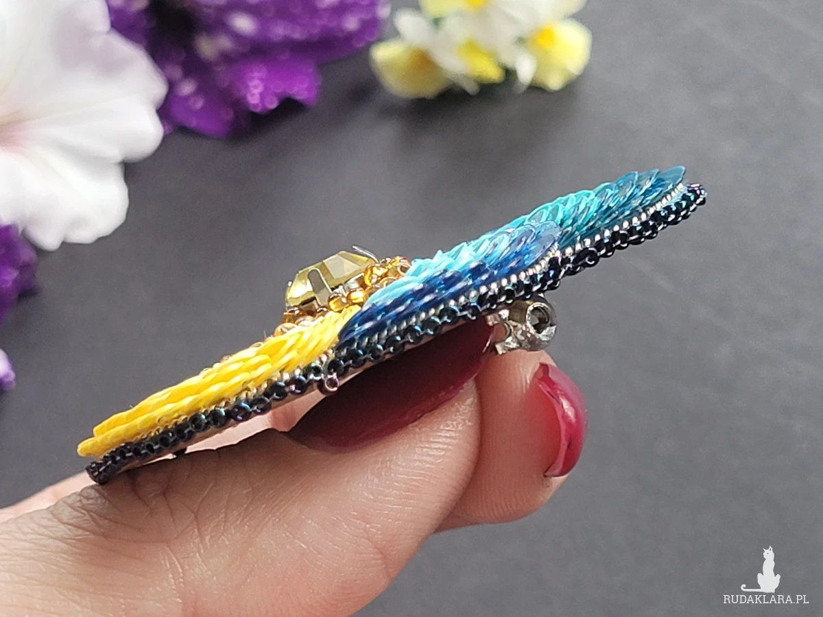Urocza, ręcznie haftowana broszka przedstawiająca kwiat bratka.