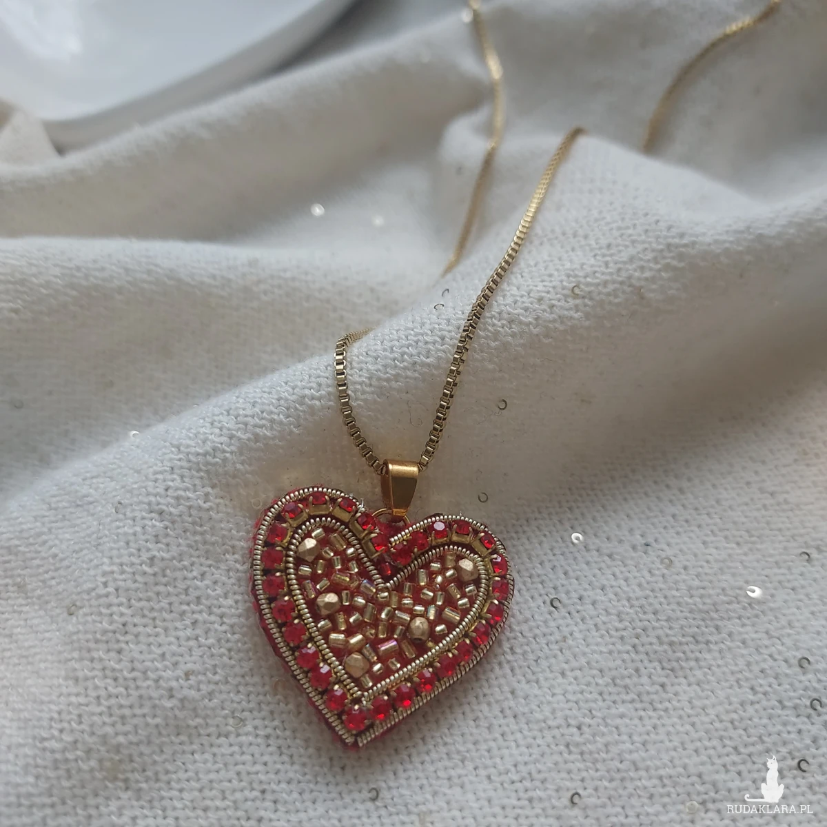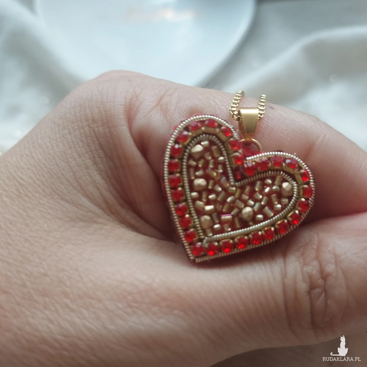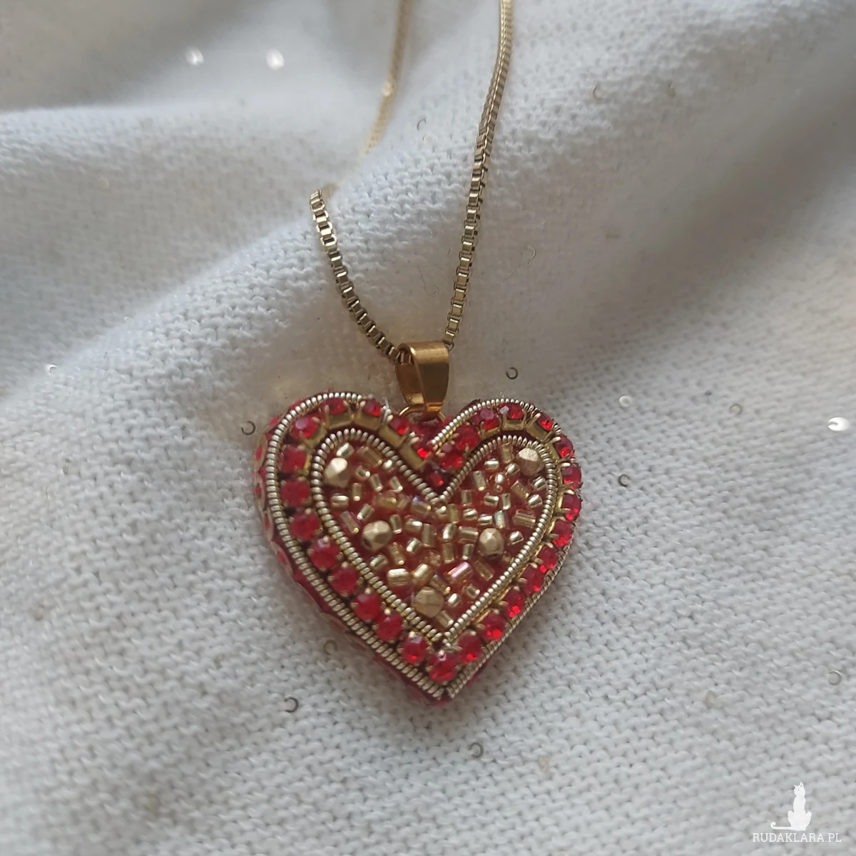 Czeewono-złote serce- uroczy, pełen blasku, niepowtarzalny powstał techniką haftu koralikowego.