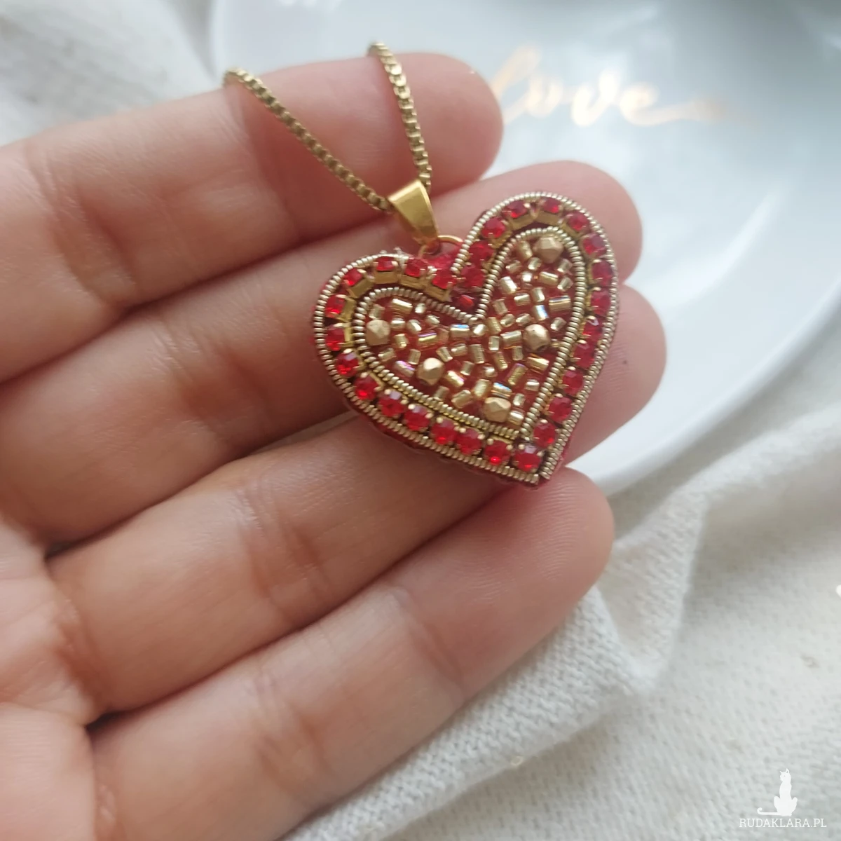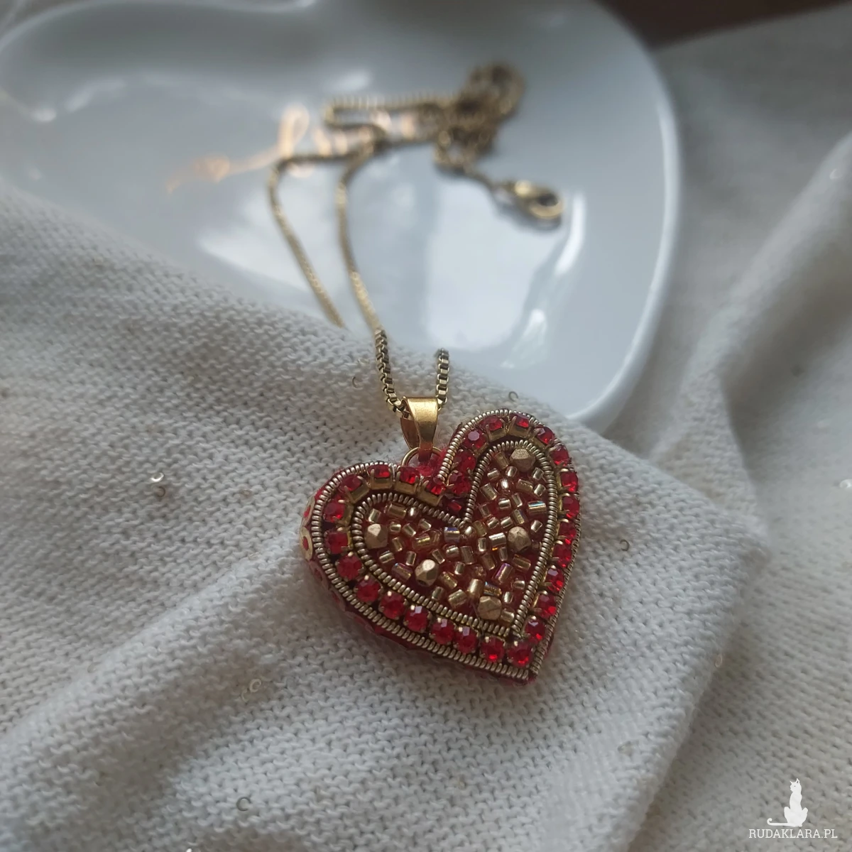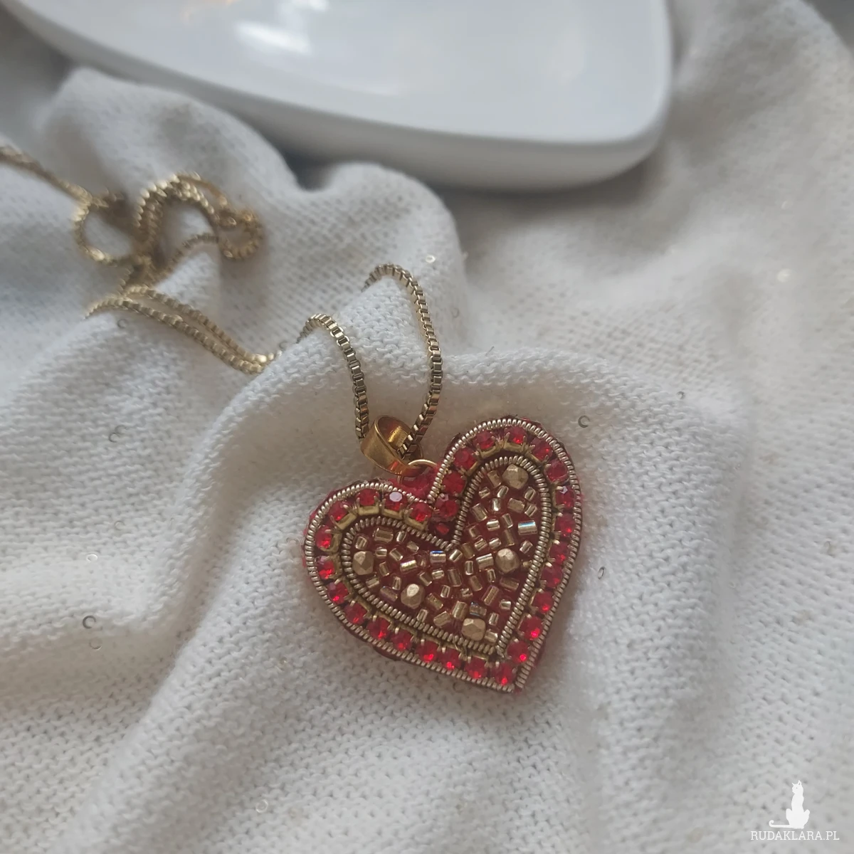 Czeewono-złote serce- uroczy, pełen blasku, niepowtarzalny powstał techniką haftu koralikowego.