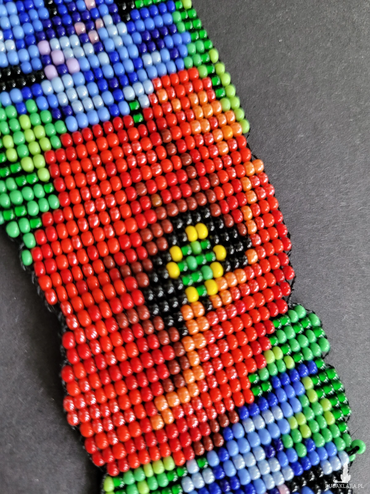 Unikatowy komplet biżuterii wykonany ręcznie metodą tkania koralikami. Wzór inspirowany naturą – piękne kwiaty w intensywnych barwach (niebieskie, żółte, białe i zielone) tworzą niezwykle efektowną i elegancką kompozycję.