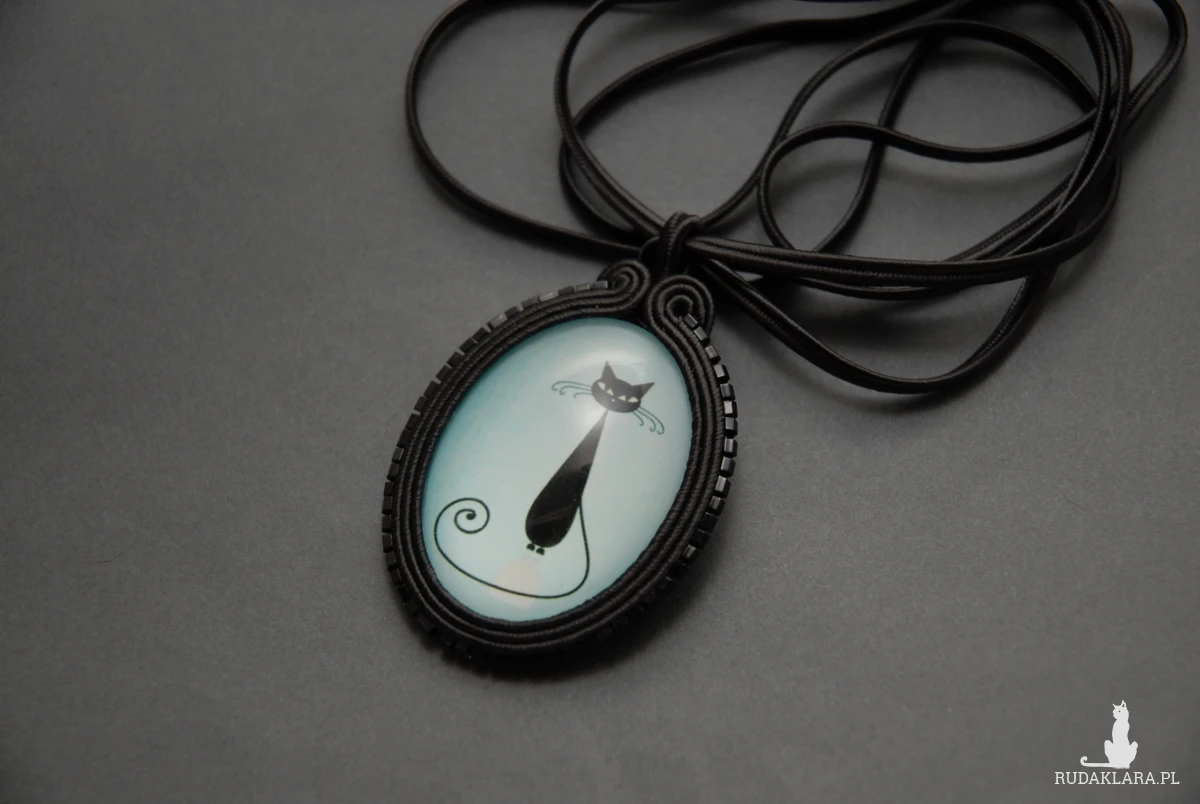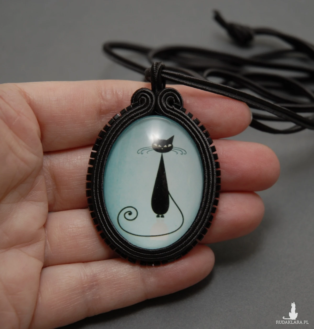 oferuję wisiorek zrobiony techniką sutasz, ozdobiony kaboszonem z kotem i koralikami