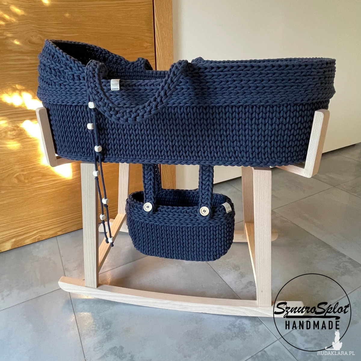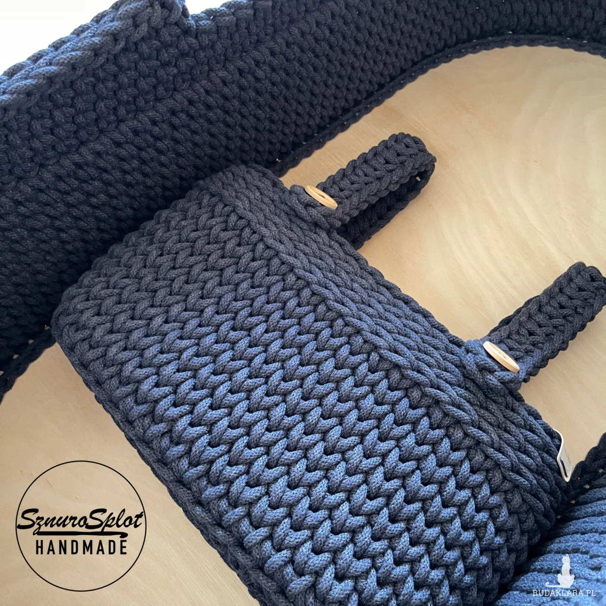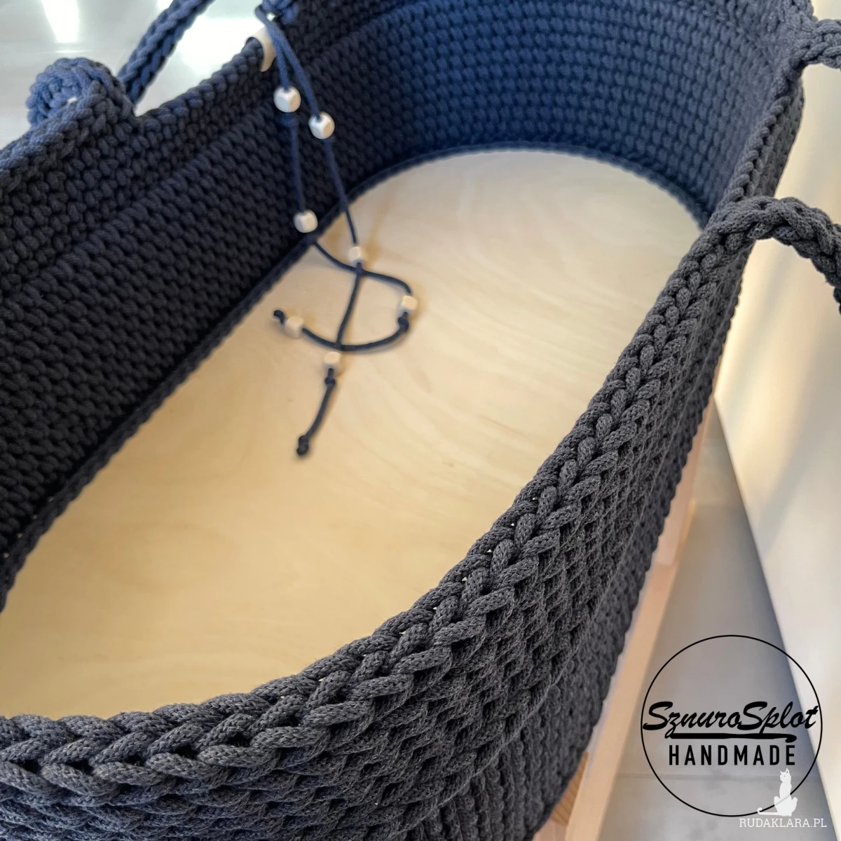 Kosz na bazie grubej sklejki, wykonany szydełkiem ze sznurka bawełnianego - odpowiedni dla noworodka. Gdy z niego wyrośnie może służyć jako kosz na zabawki. Jest miły w dotyku. Wzór wykonany w kolorze 47 ze wzornika. Wydziergany jest bardzo ściśle - nie ma prześwitów i śladów łączeń kolejnych rzędów. Cena dotyczy kosza.