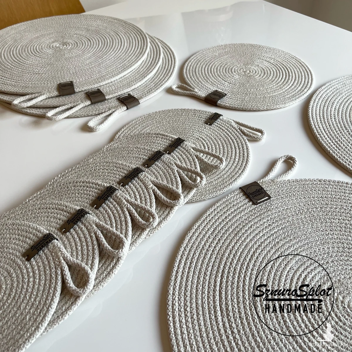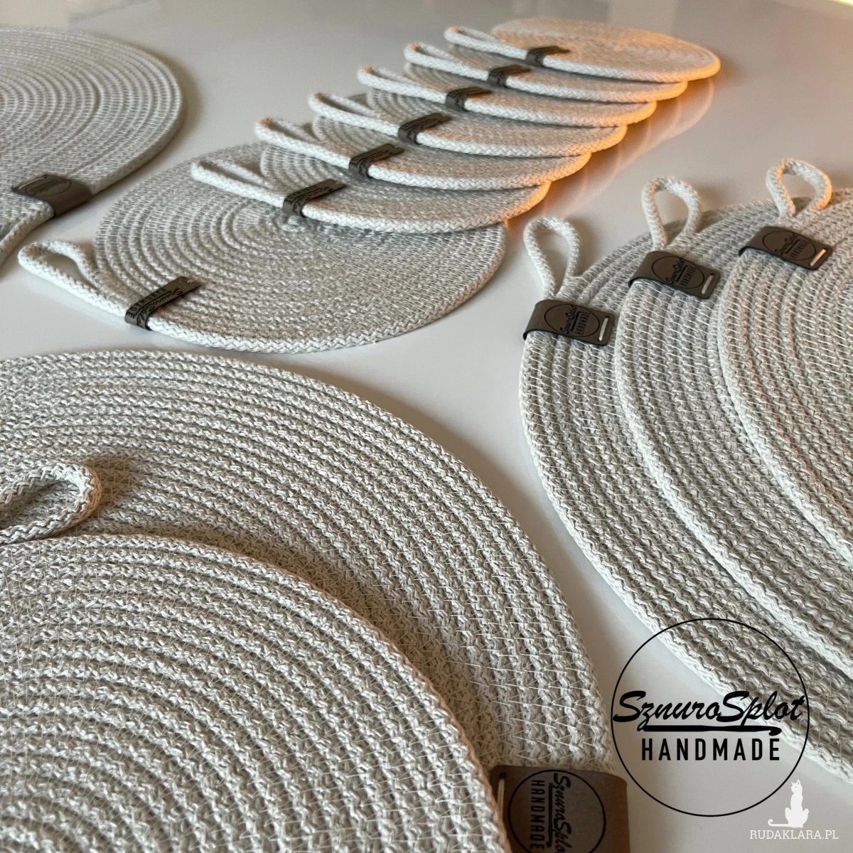 Komplet dziesięciu podkładek uszytych ze sznurka bawełnianego.