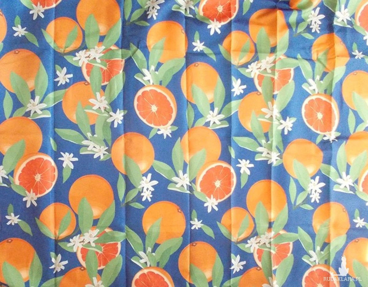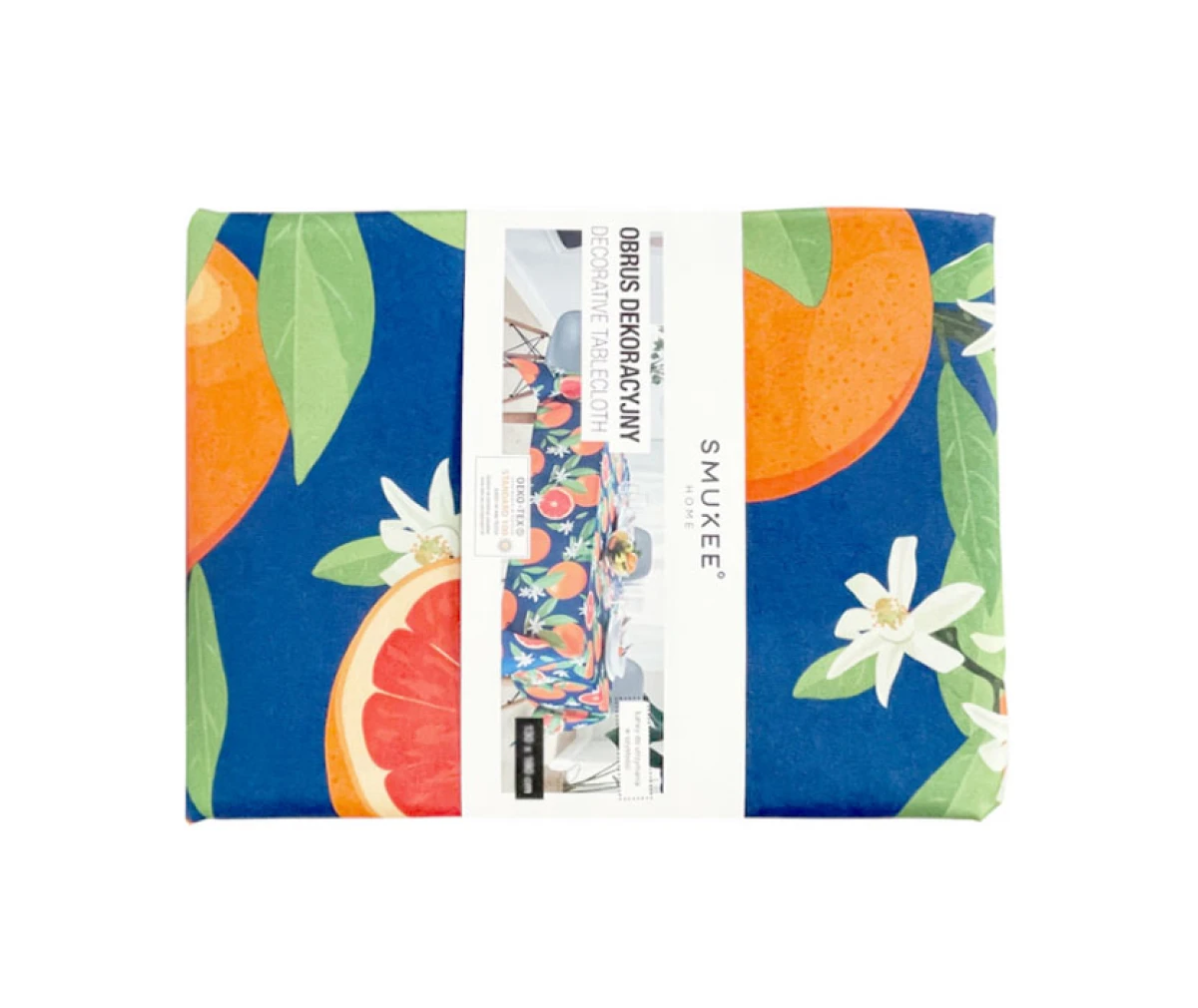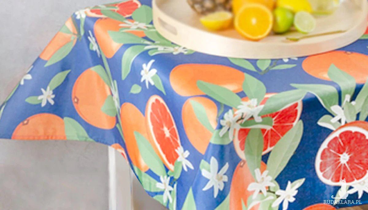 Nowy obrus z wzorem w owoce. Rozmiar: 110 x 160 cm, materiał poliester 100 %, plamoodporny. Prać w 30 stopniach, certyfikat "OEKO-TEX Standard 100". Dekoracyjny obrus na stół do salonu, jadalni, kuchni, restauracji, kawiarni itp.