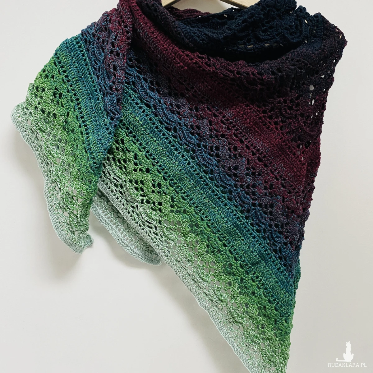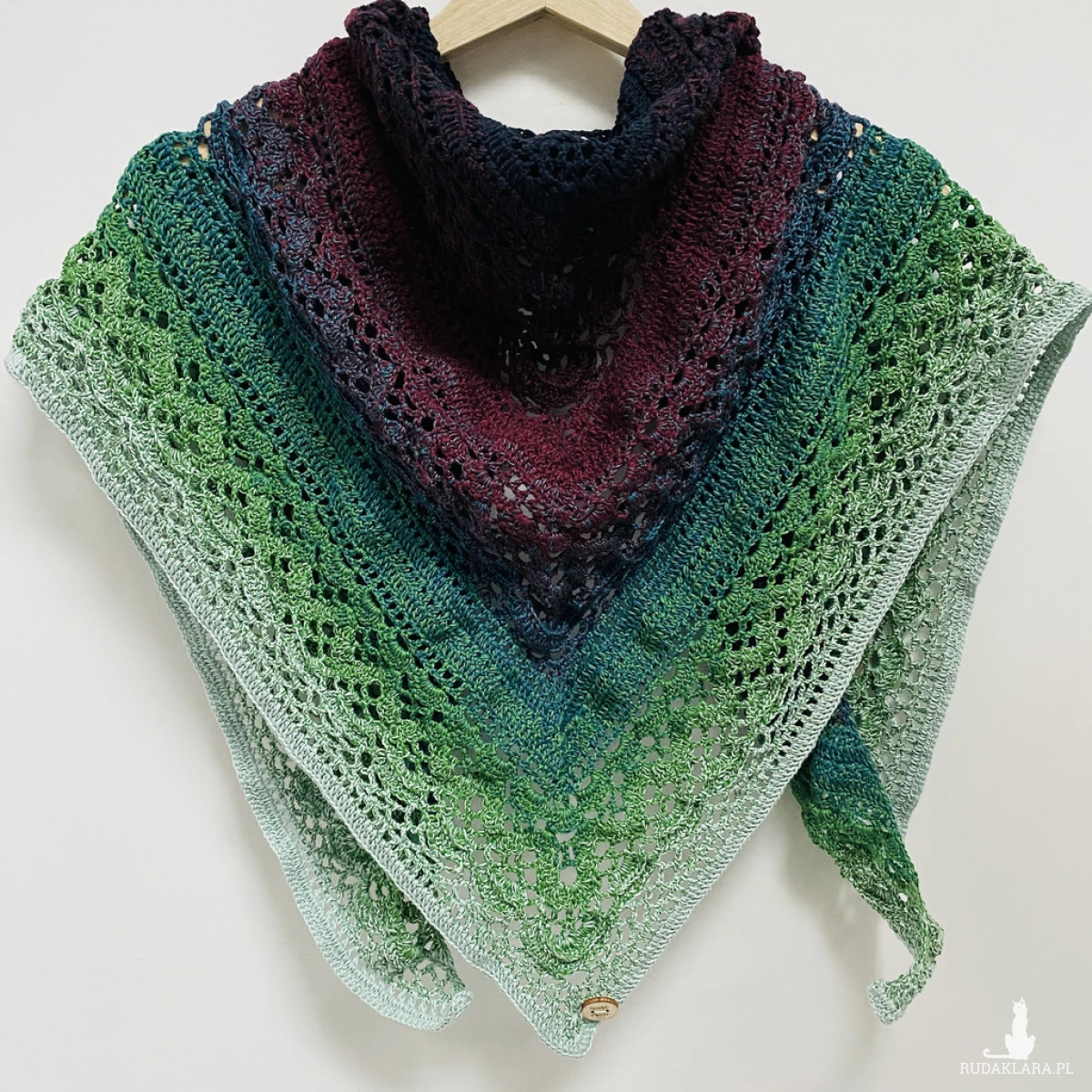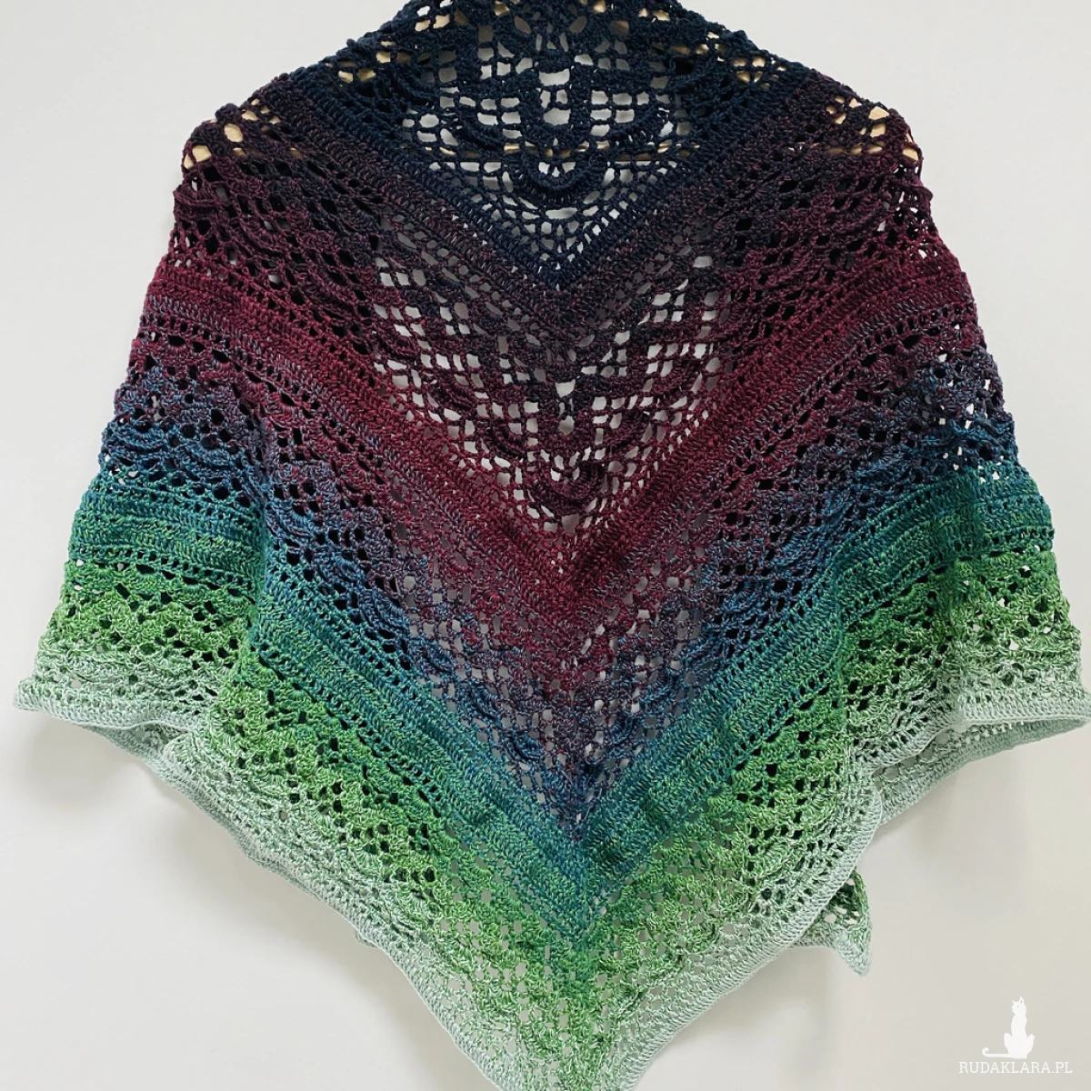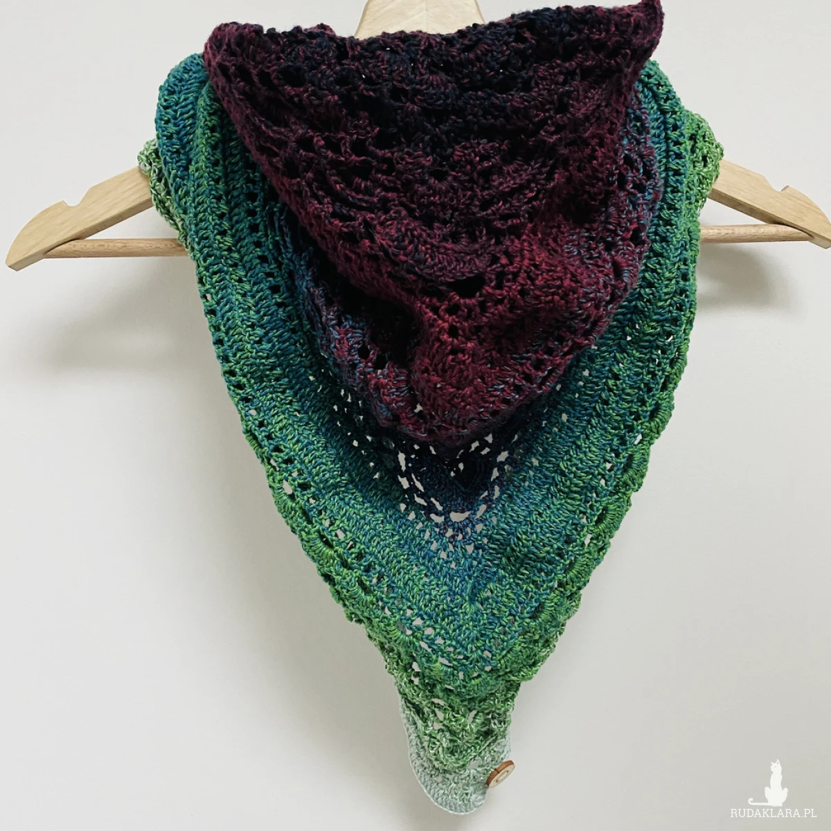 Chustę Klaziena wykonałam na szydełku z wysokiej jakości włóczki ombre Yarn Art Flowers, 250 g, która zachwyca intensywnością koloru i delikatnością. Przędza bawełniano-akrylowa charakteryzuje się trwałością, sprężystością i miękkością.