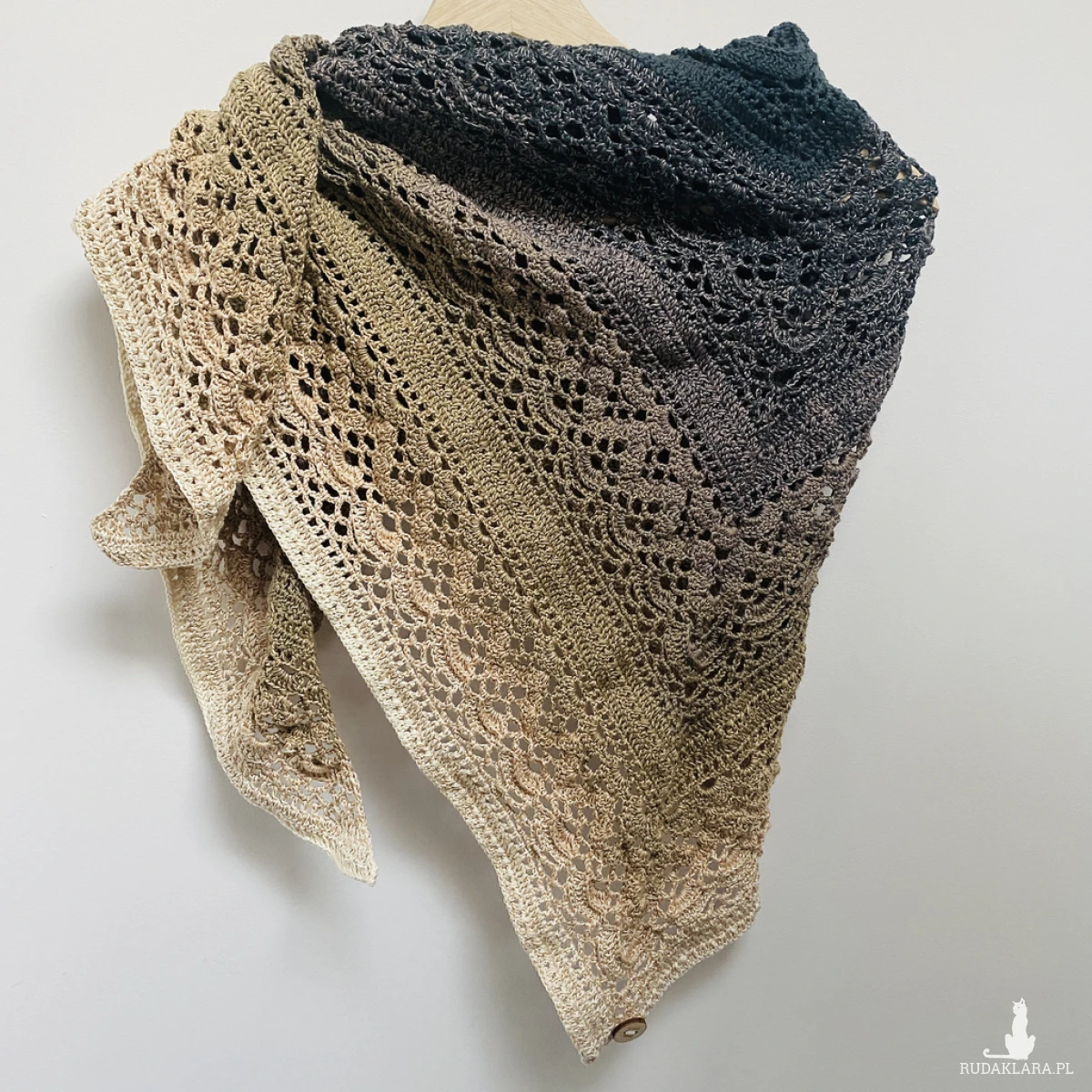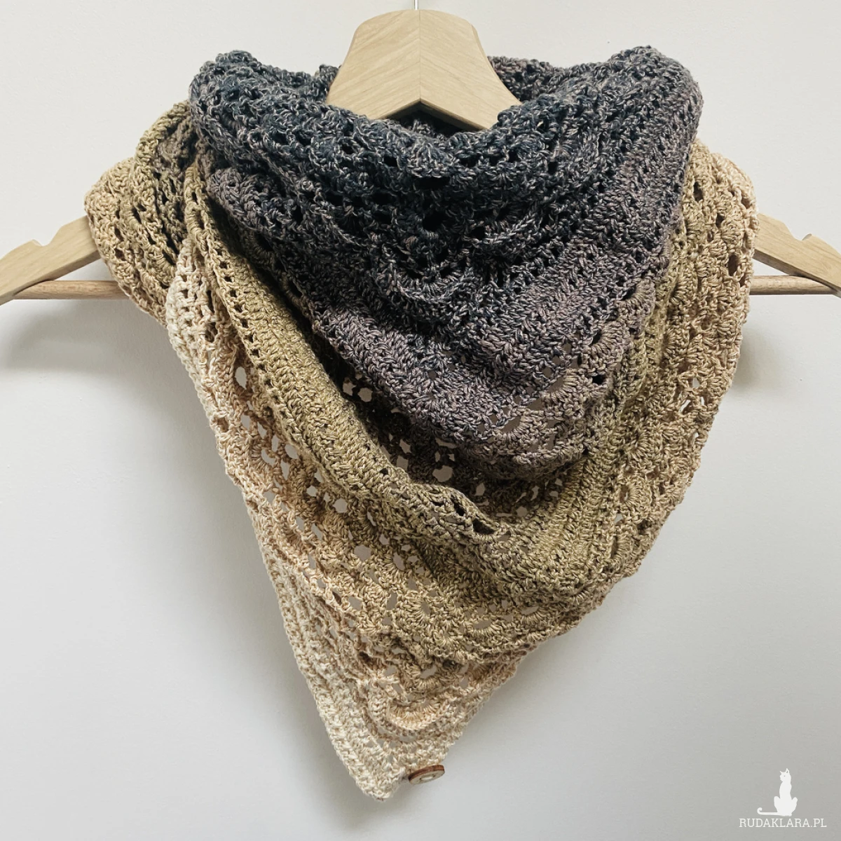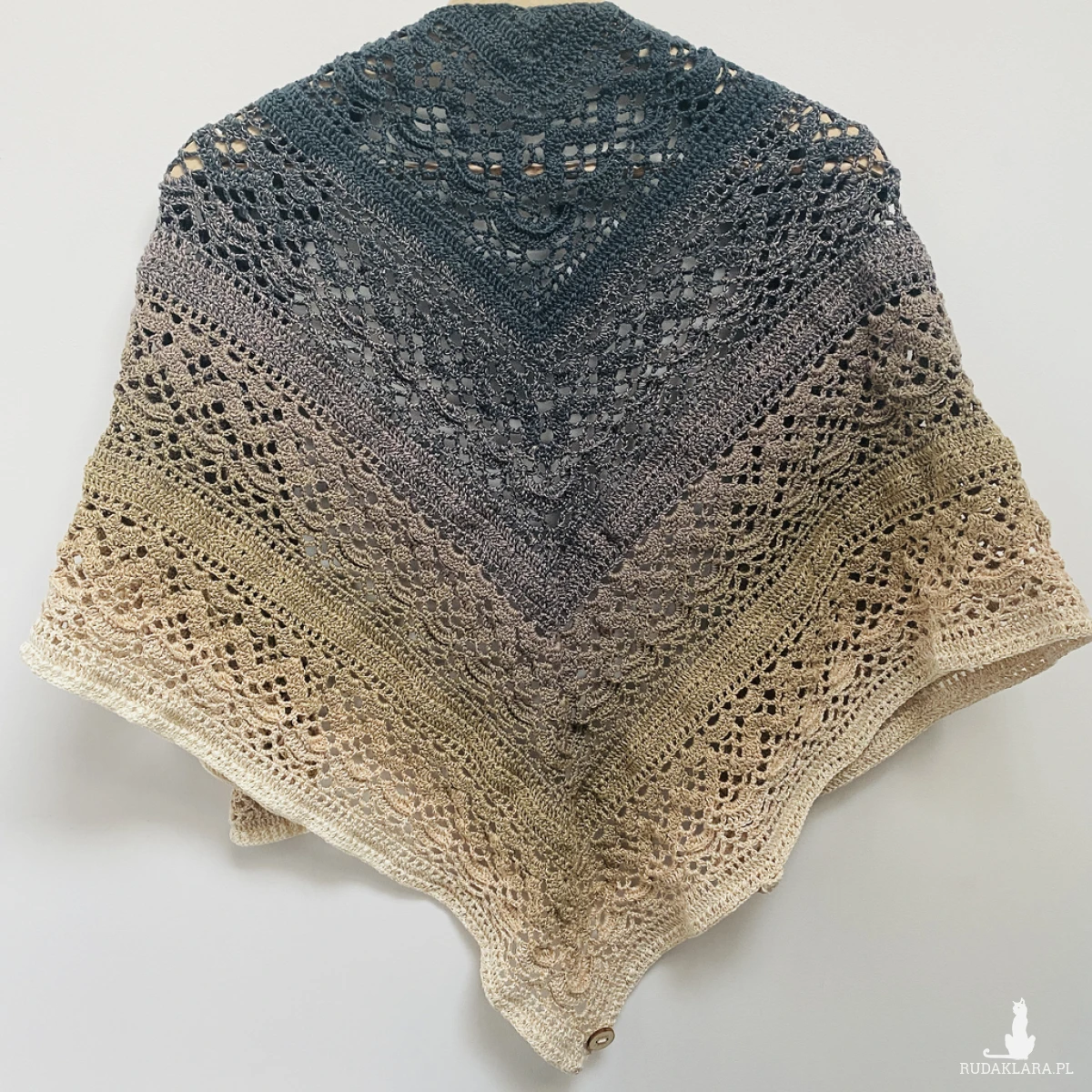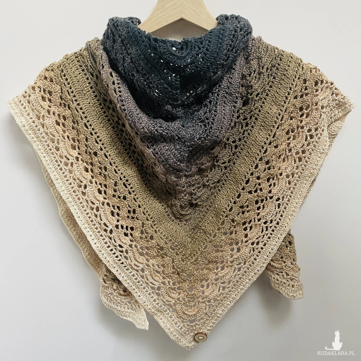 Chustę Klaziena wykonałam na szydełku z wysokiej jakości włóczki ombre Yarn Art Flowers, 250 g, która zachwyca intensywnością koloru i delikatnością. Przędza bawełniano-akrylowa charakteryzuje się trwałością, sprężystością i miękkością.