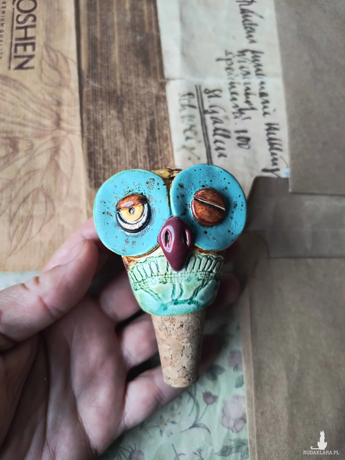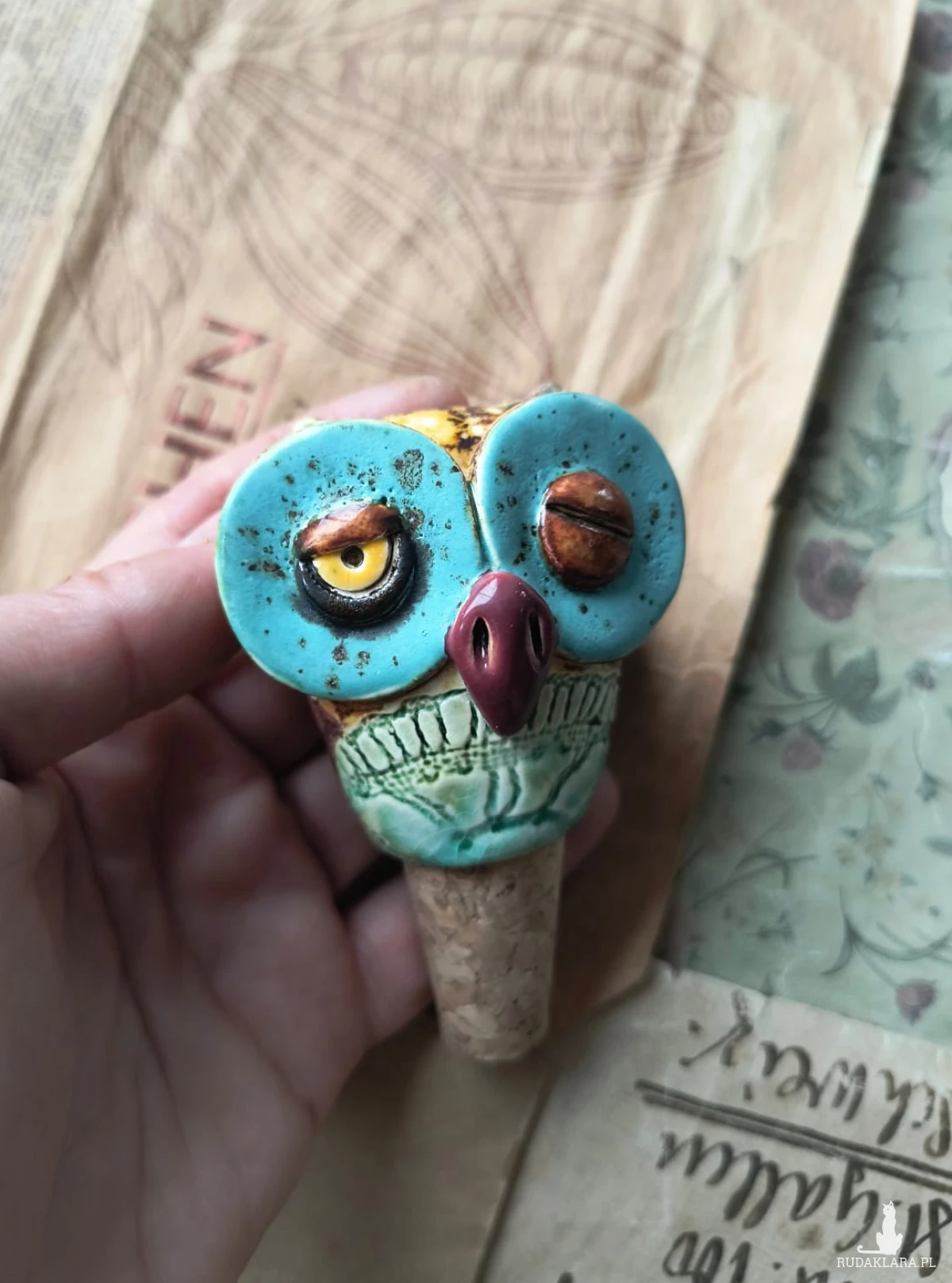 Korek do wina z nasadką z ceramiki w postaci sowy. W stylu vintage. Wymiary ok 5 x 7,5 cm. Serdecznie polecam jako miły upominek dla bliskiej sercu osoby. Układ kolorów może nieznacznie się różnić od tego na zdjęciu.