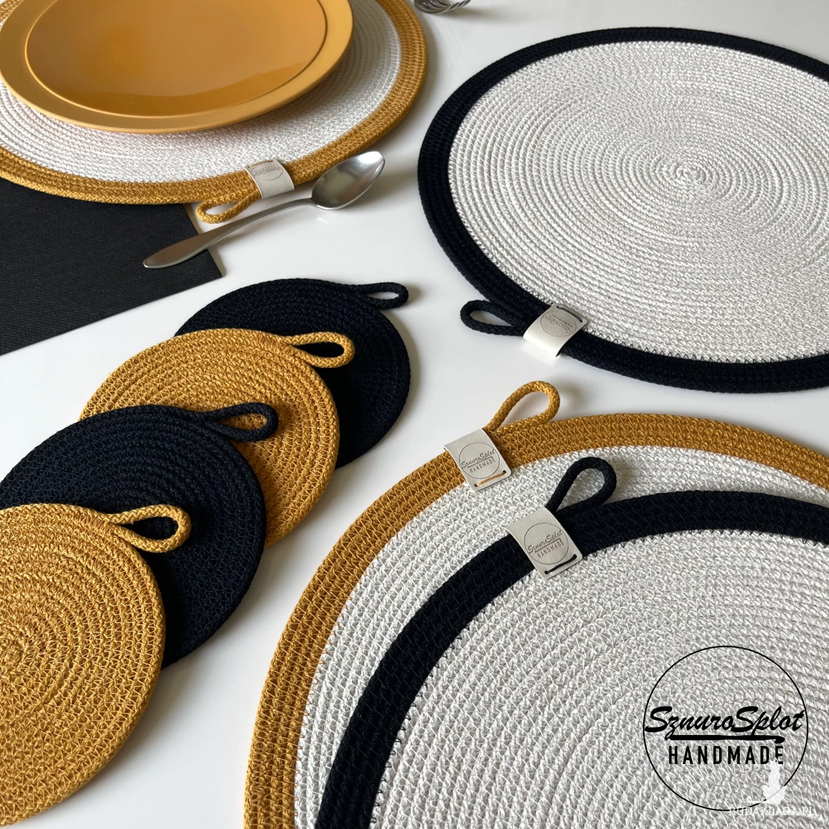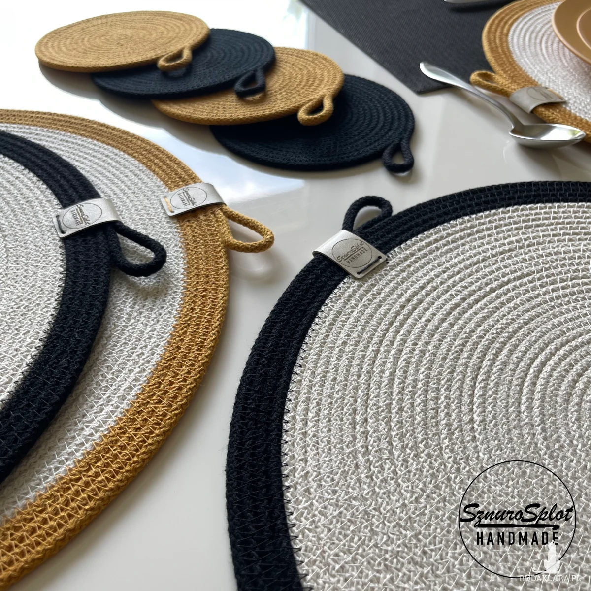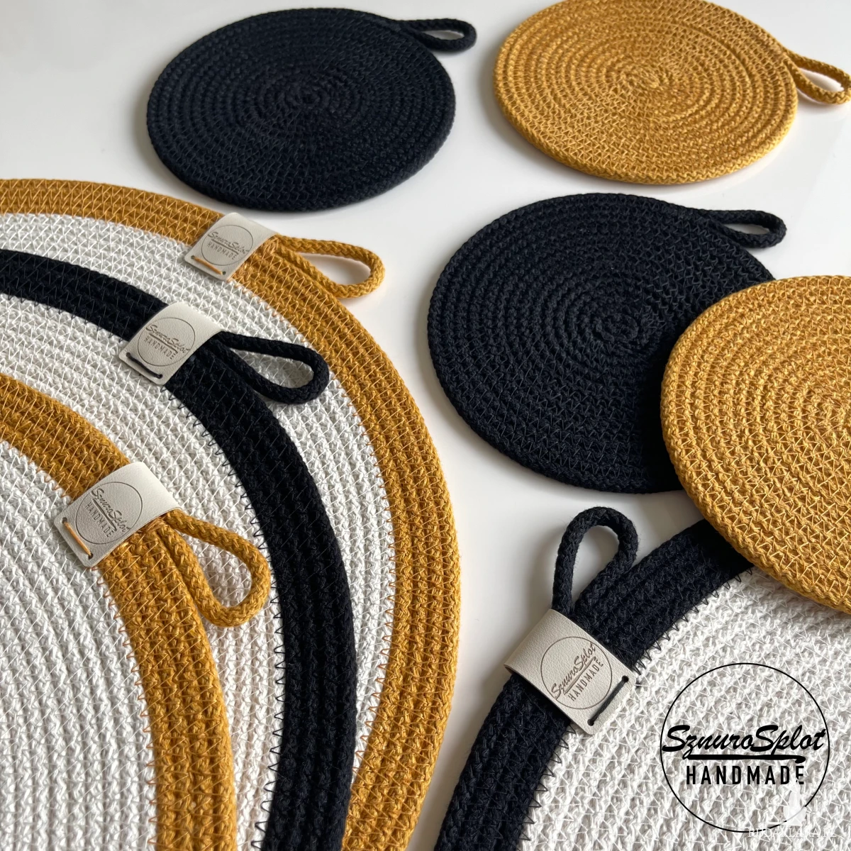 Komplet ośmiu podkładek uszytych ze sznurka bawełnianego.