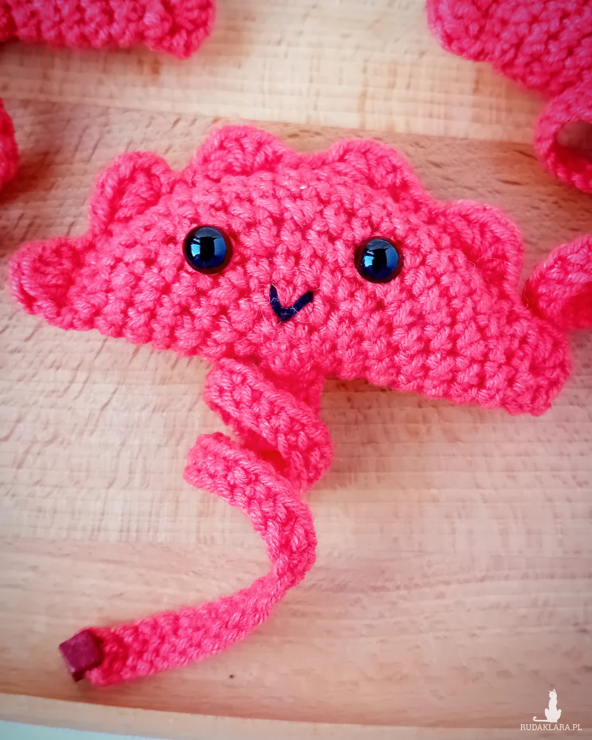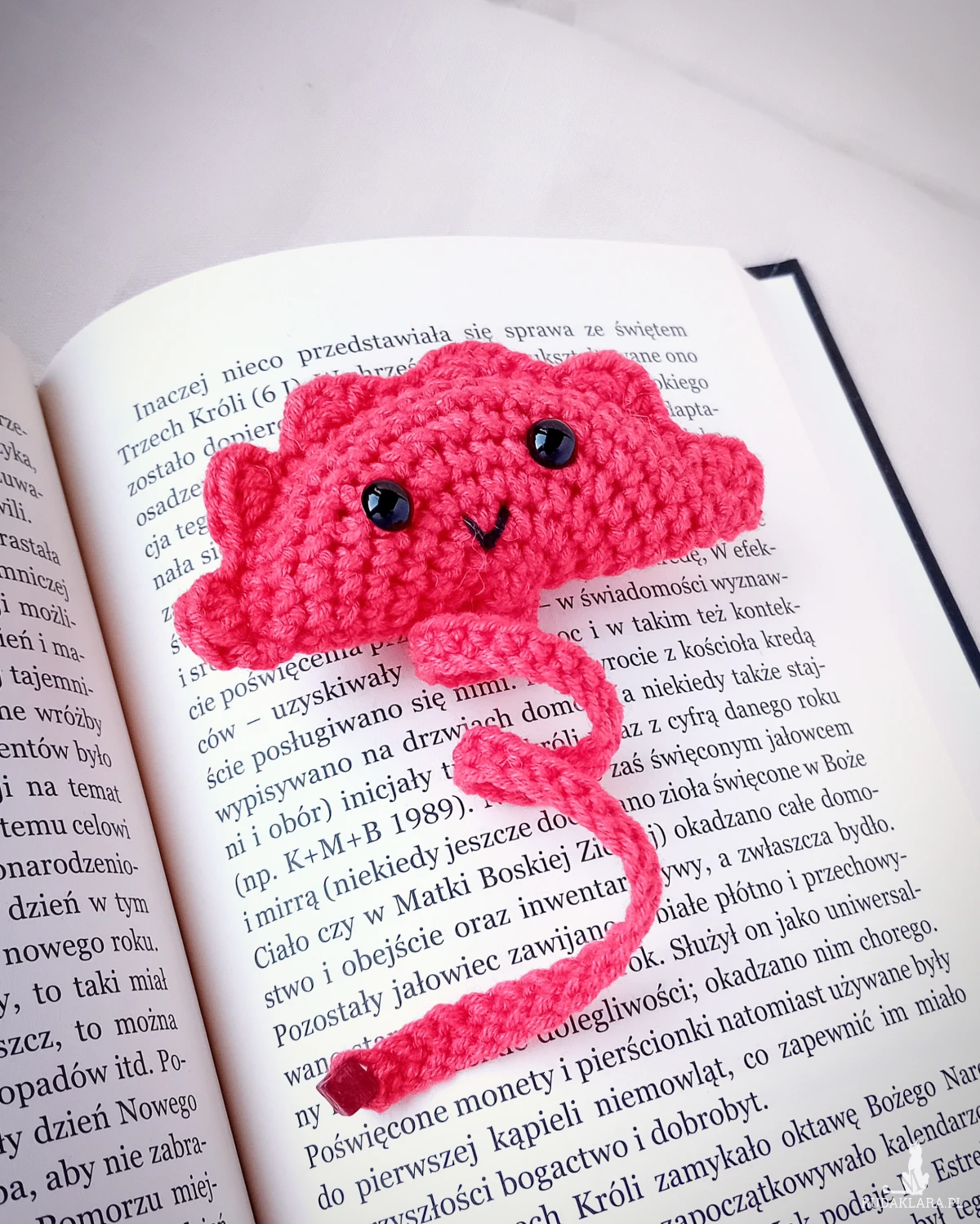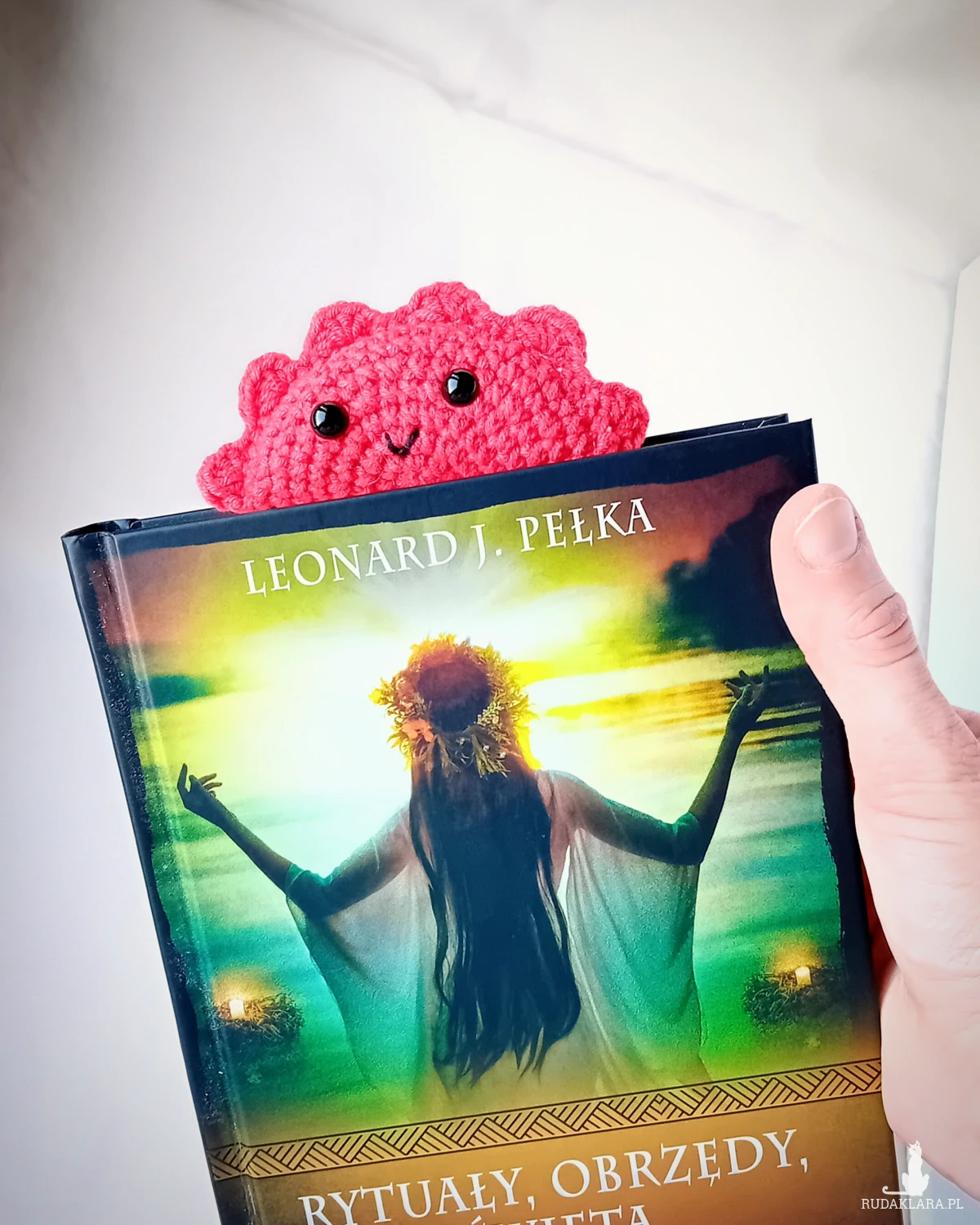 Pierożki wykonałam na szydełku, buźka jest przyszyta, a plastikowe oczka są zabezpieczone w środku przed wypadnięciem. Sznureczek przechodzący przez książkę jest dość elastyczny i rozciąga się od 22 do 28 cm, więc dopasuje się do różnych rozmiarów książek. Sznureczek jest zakończony kolorowym koralikiem.