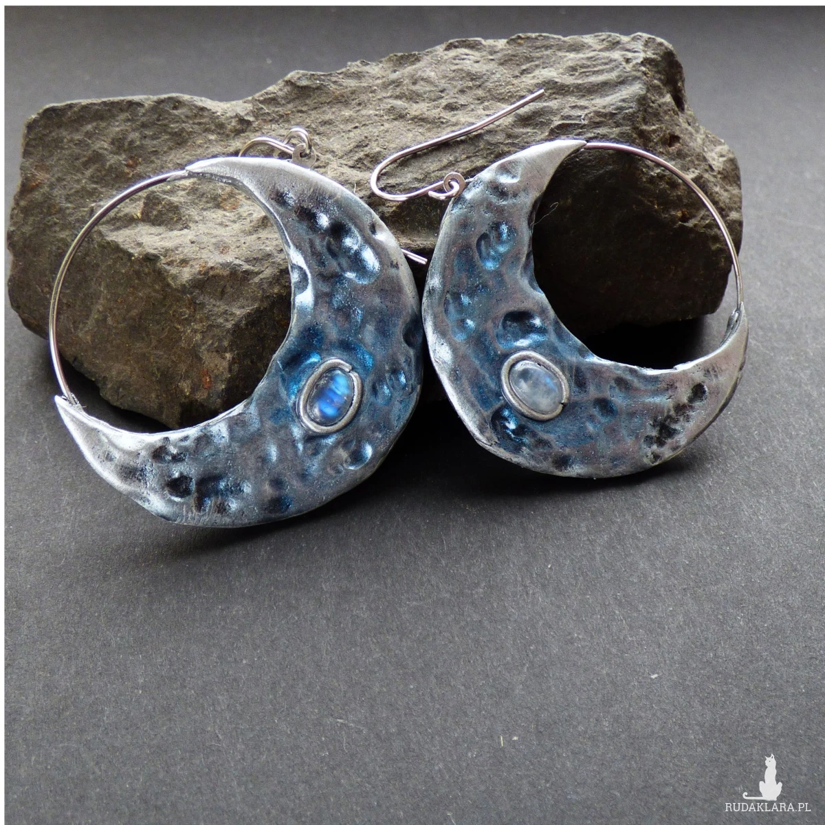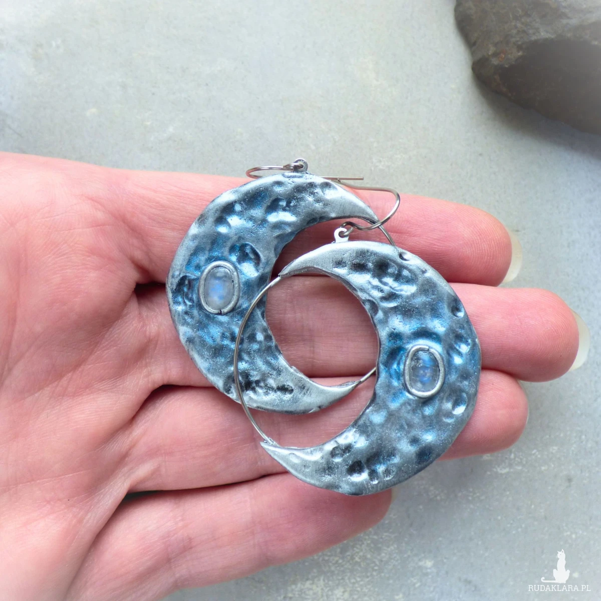 Kolczyki inspirowane tajemniczym pięknem nocnego nieba. Wykonane ręcznie z glinki polimerowej, formowanej i fakturowanej tak, by oddać wygląd powierzchni Księżyca - z delikatnymi kraterami i nieregularną strukturą. Pokryte metalicznym błękitem i srebrem, subtelnie połyskują w świetle.