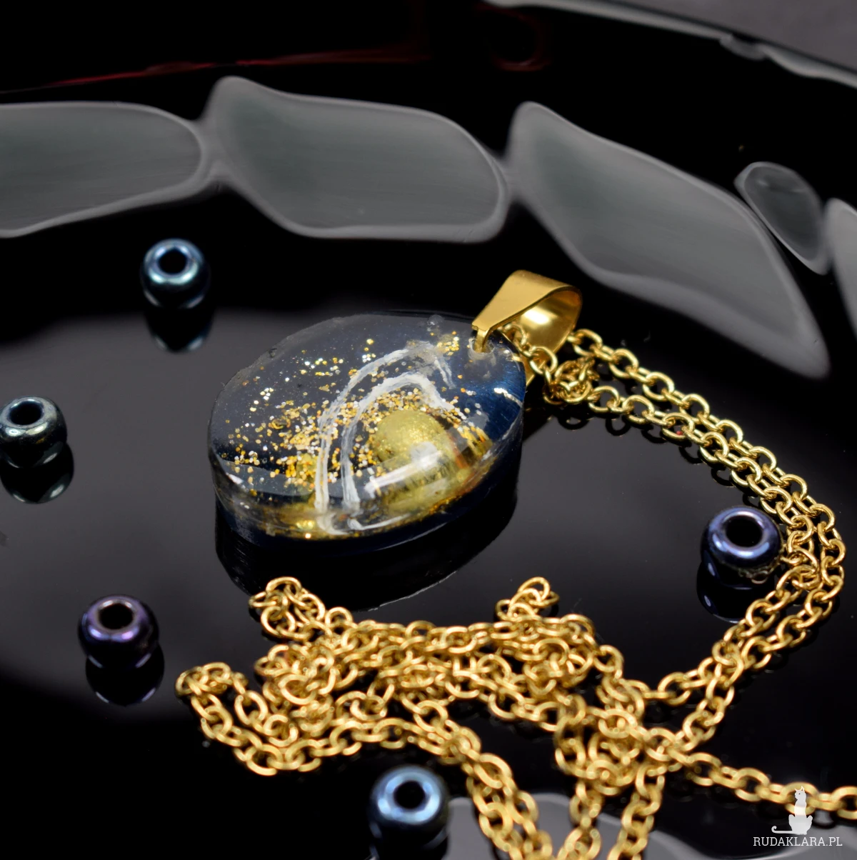 Owalny wisiorek wykonany ręcznie z transparentnej żywicy, z