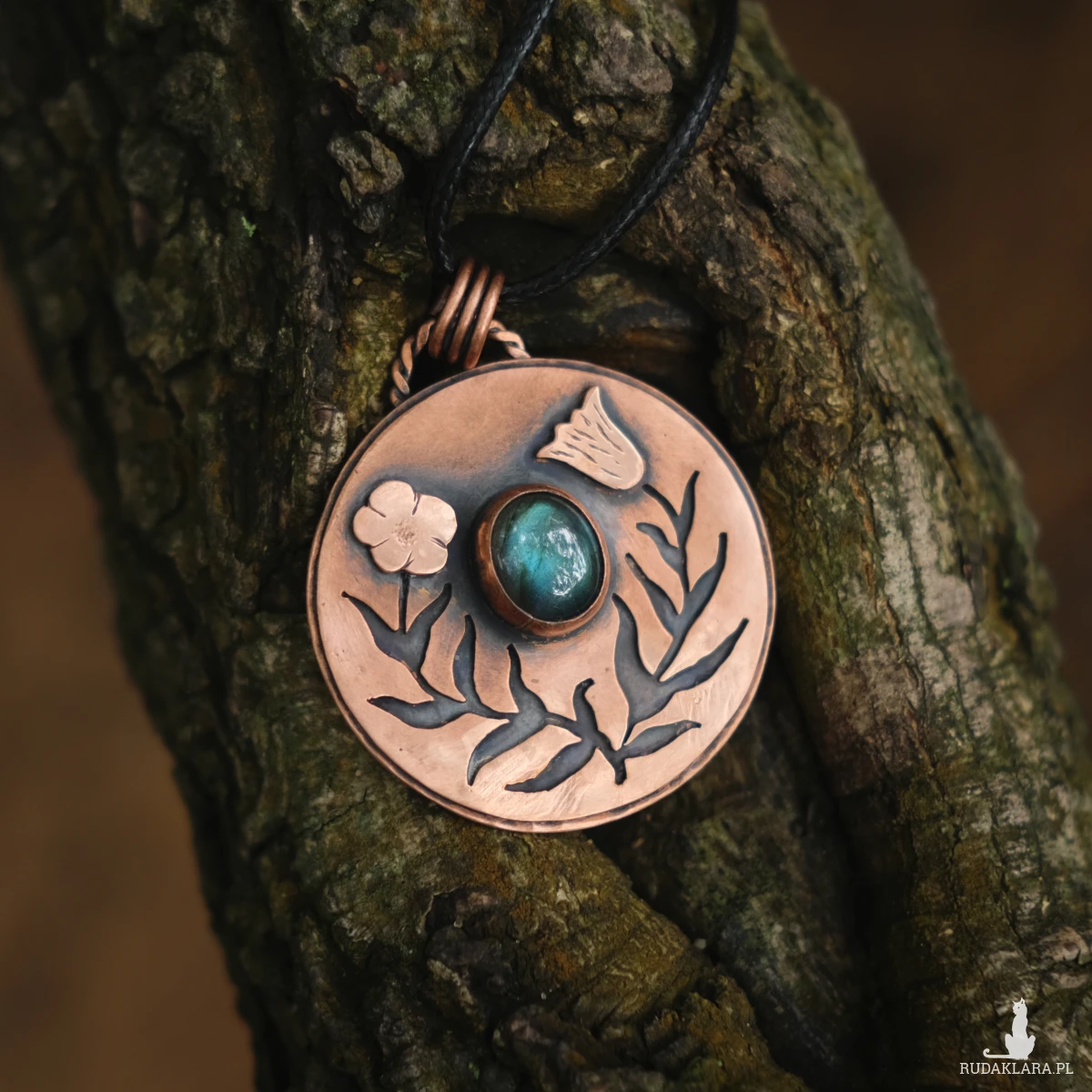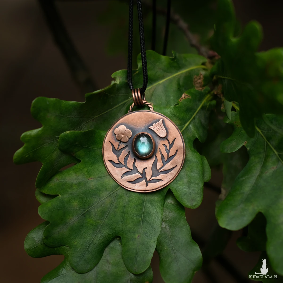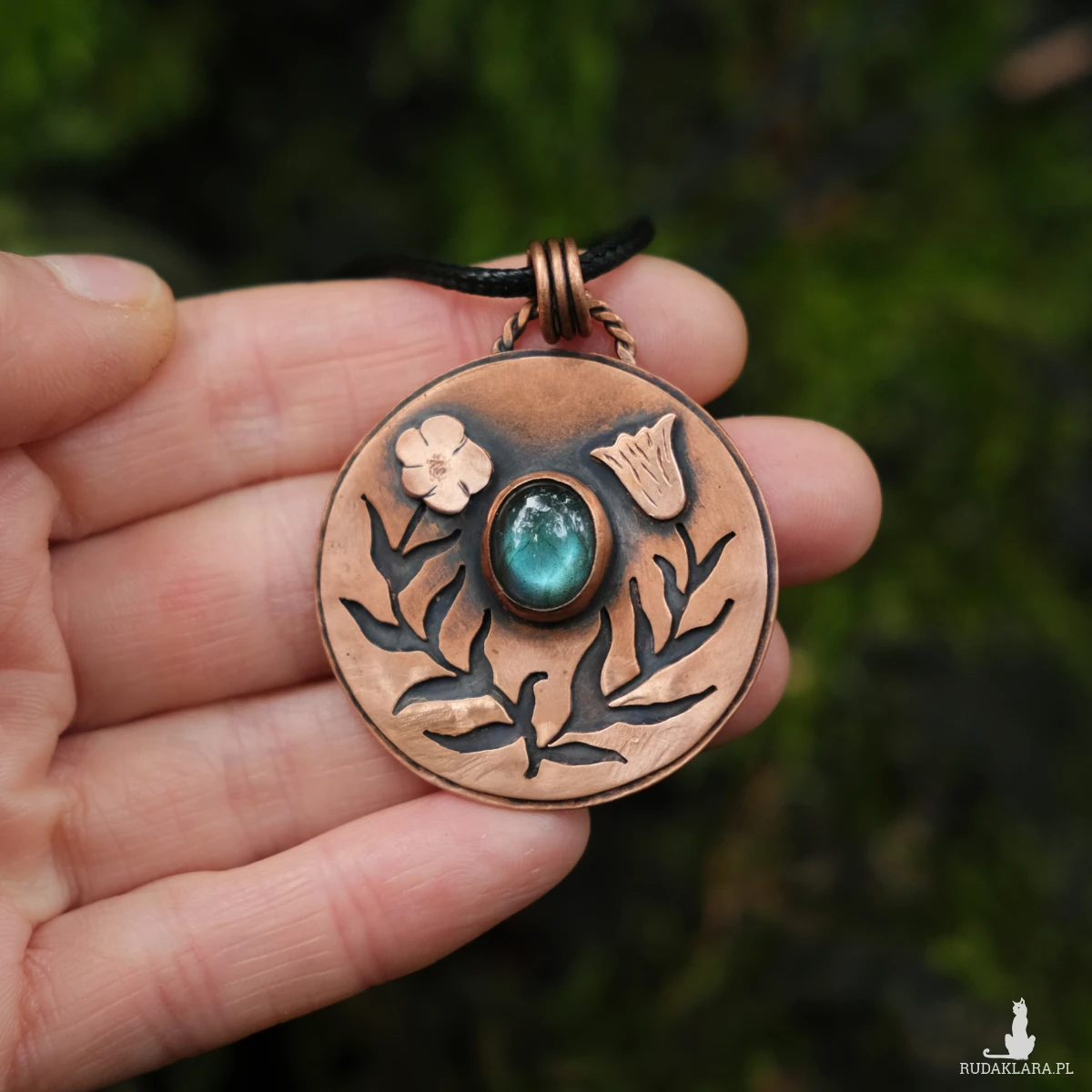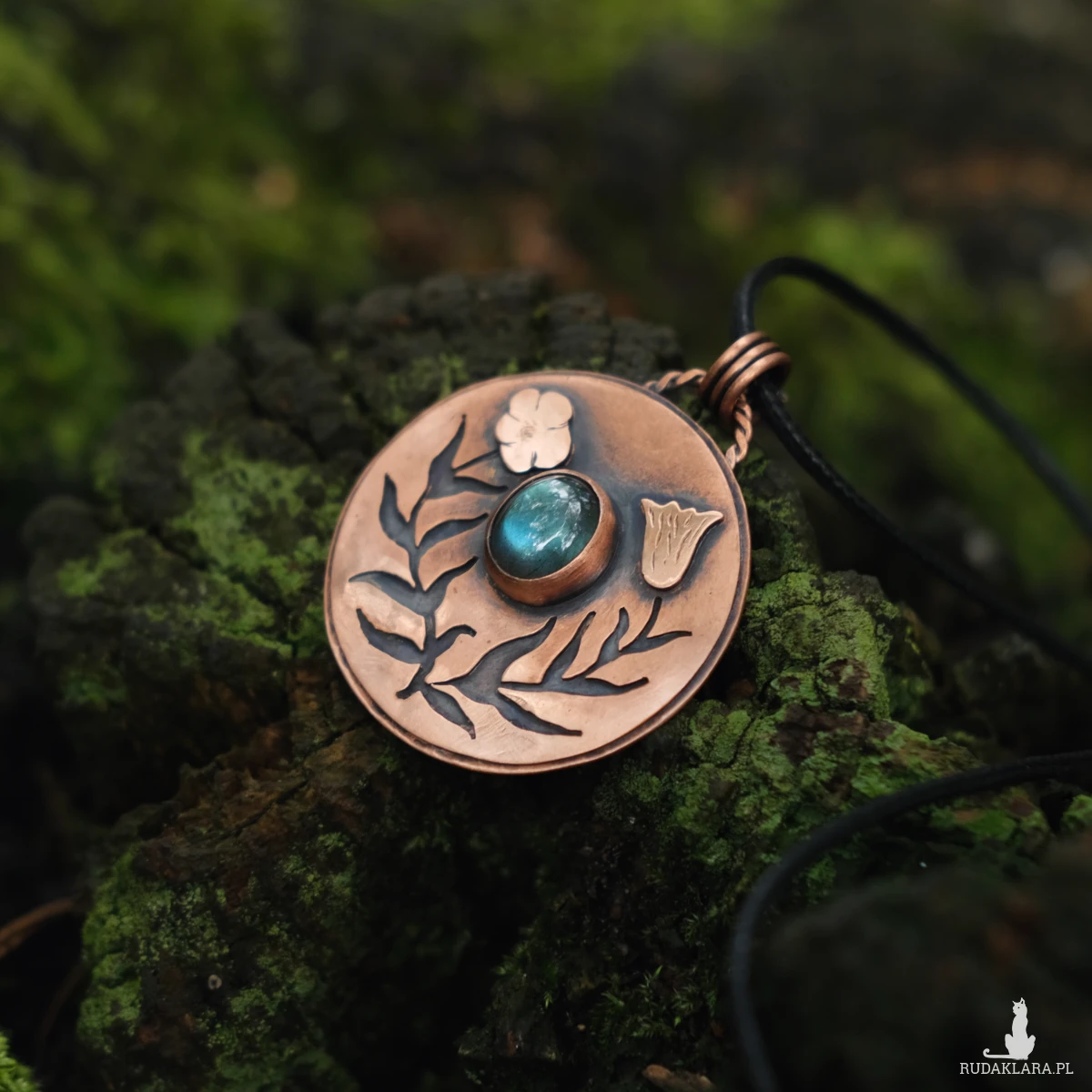 Unikatowy miedziany wisior z kwiatowym motywem mieści w sobie kamień labradorytu o pięknej błękitno-zielonkawej iryzacji. Wszystkie elementy zostały stworzone ręcznie na podstawie rysunku, co nadaje mu oryginalnego charakteru. Wisior został stworzony w jednym egzemplarzu, ma naniesioną patynę, miejscami posiada fakturę i przetarcia.