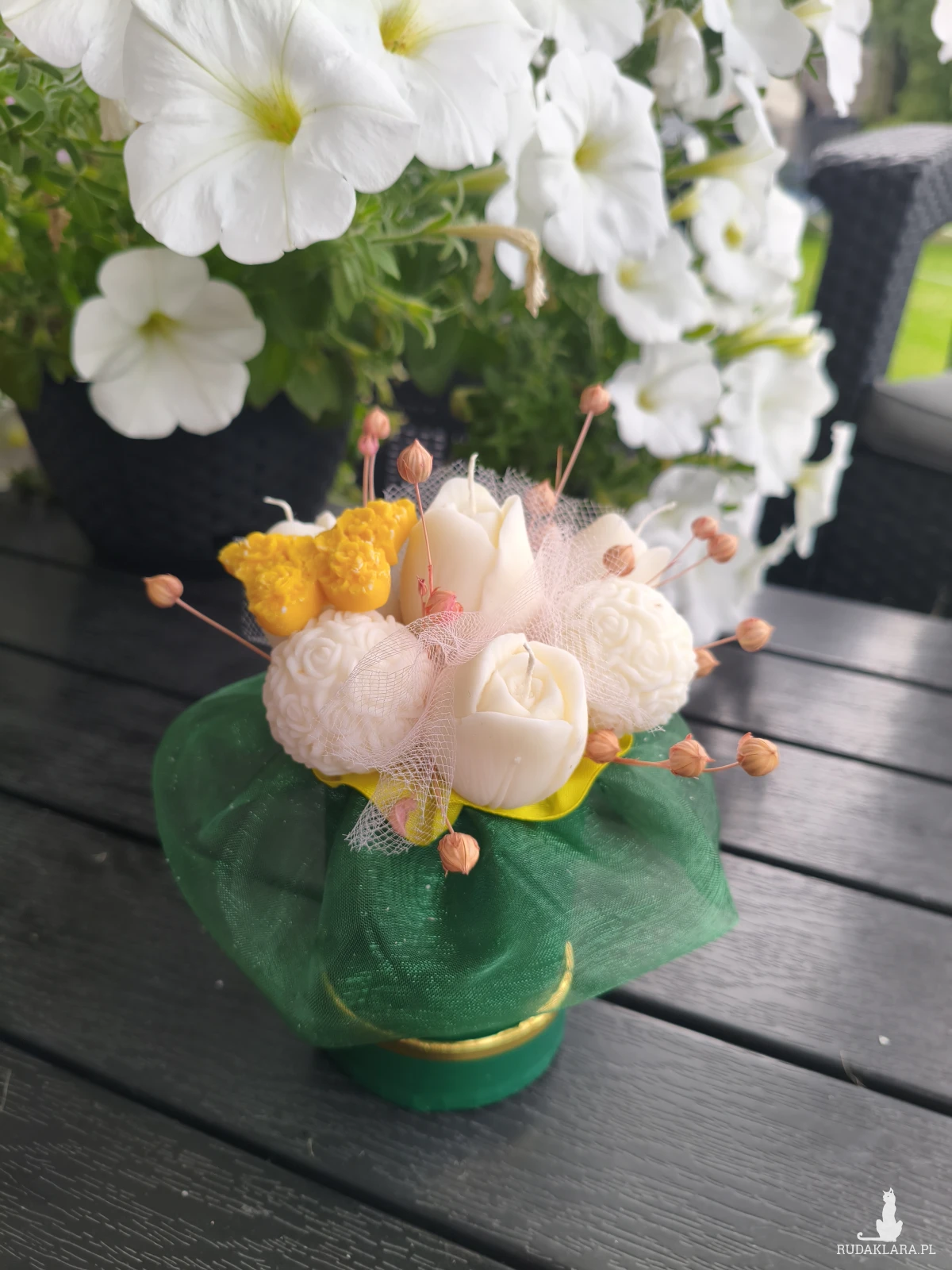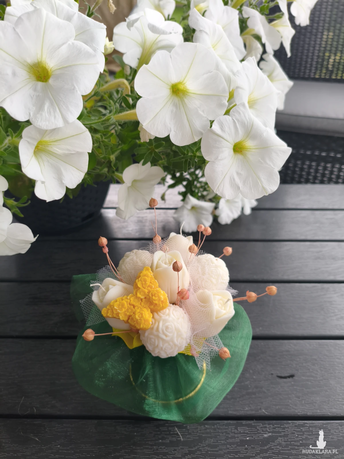 Świece wykonane są z naturalnego wosku sojowego oraz bawełnianego knota. Flower box zawiera główki kwiatów które po wyciągnięciu z bukietu można zapalić.
