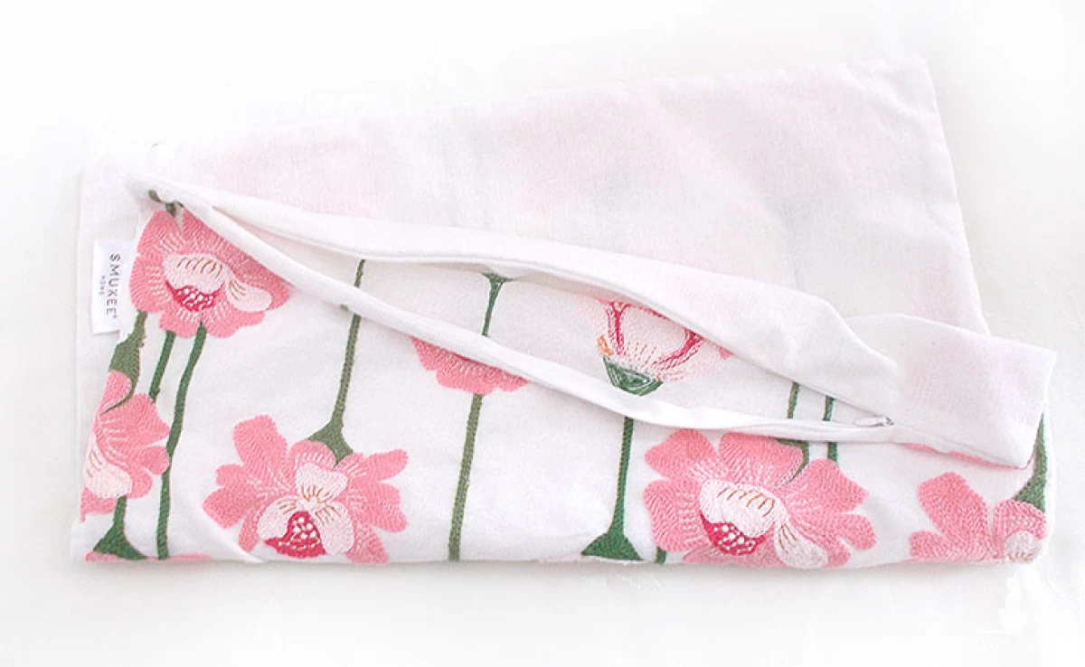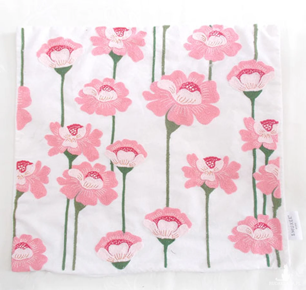 Nowa, ozdobna poszewka na poduszkę z haftem kwiatów z przodu, tył gładki, rozmiar 45 x 45 cm, zapinana na błyskawiczny zamek, certyfikat "OEKO-TEX Standard 100", Marka "Smukee". Poszewka sprawdzi się zwłaszcza we wnętrzach urządzonych stylu boho, rustykalnym, hygge, tradycyjnym i mieszanym.