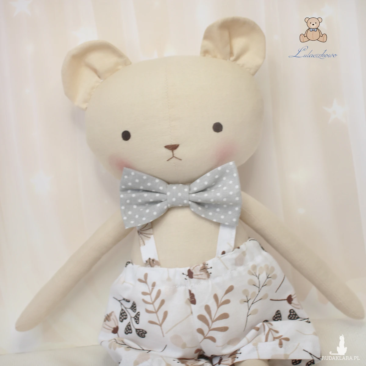 Przeurocza przytulanka, miś w kolorze beżowym, uszyty ręcznie z najwyższą starannością, ubrany w spodenki na szelkach w kolorze bieli w leśne wzorki i uroczą muszkę. Wykonany ze 100% bawełny, wypełniony antyalergiczną kulką silikonową. Oczka malowane wodoodpornym markerem, nosek i buźka wyszyte muliną. Górne i dolne łapki układają się luźno, misiulek siedzi z podparciem. Spodenki można swobodnie zdejmować, w pasie wszyta jest gumeczka, muszka również jest na gumeczce.