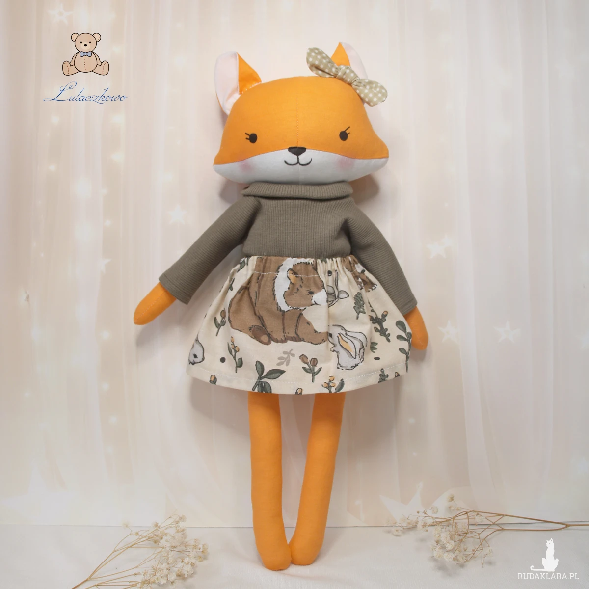 Przeurocza przytulanka, lisek a właściwie lisiczka w odcieniach pomarańczu i bieli, uszyta ręcznie z najwyższą starannością, ubrana w brązowy sweterek i beżową spódniczkę w leśne zwierzątka. Wykonana ze 100% bawełny, wypełniona antyalergiczną kulką silikonową. Oczka, nosek i uśmiech malowane wodoodpornym markerem, uszko ozdobione kokardką. Spódniczkę i sweterek można swobodnie zdejmować (sweterek zdejmujemy dołem, przez nóżki), spódniczka jest na gumeczce. Górne i dolne łapki układają się luźno, lisiczka siedzi z podparciem.