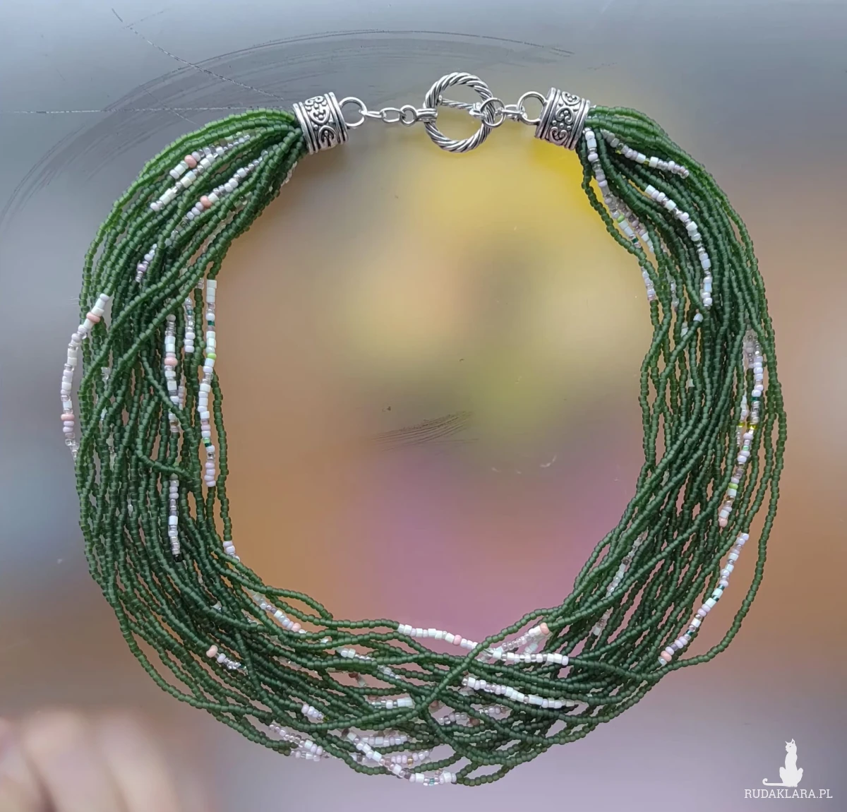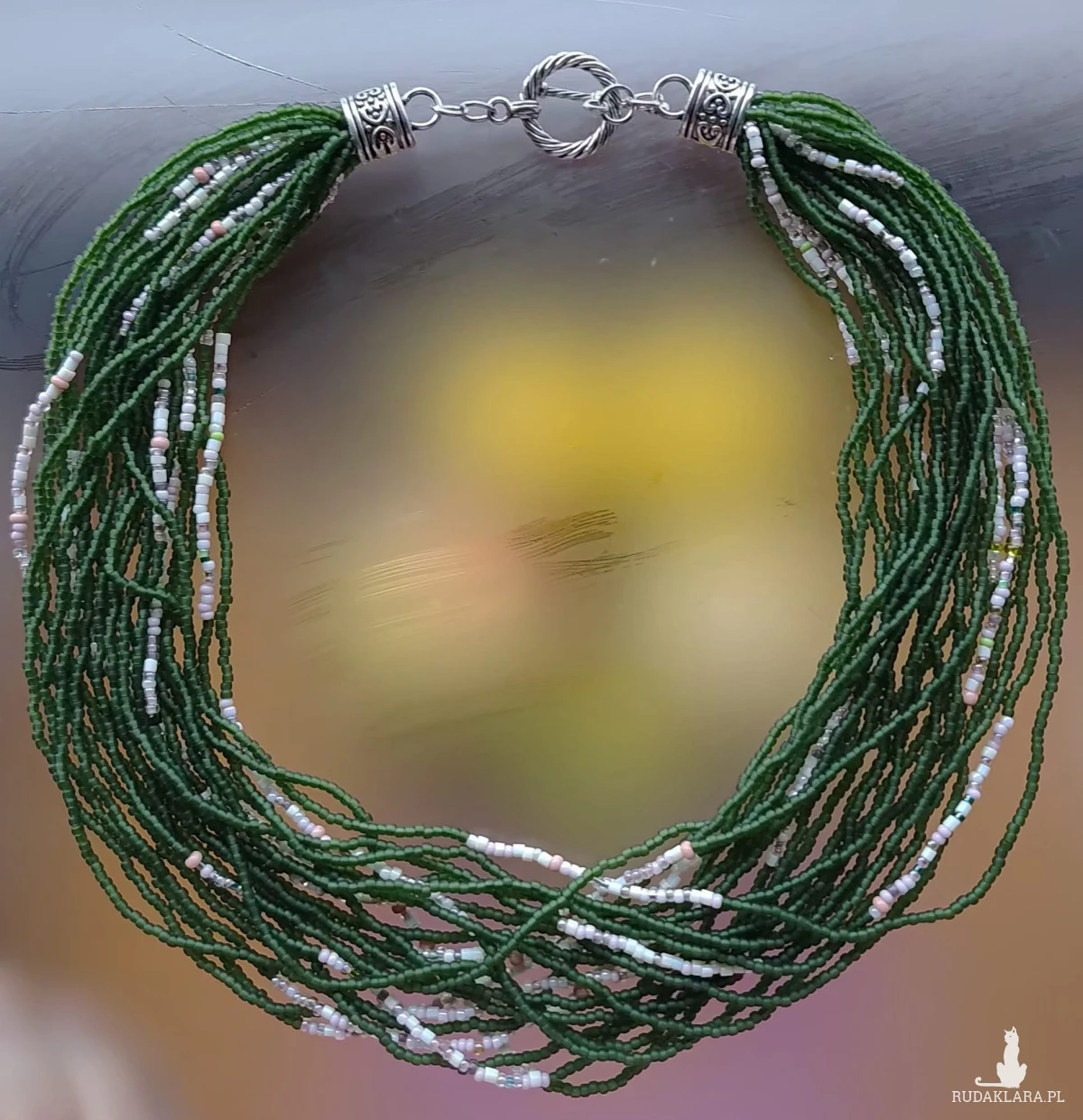 Naszyjnik z koralików w kolorze zieleni leśnej ciemnej, koraliki matowe malutkie 2 mm, przeplatane mixem koralików wielokolorowych, koraliki drobne, Objetość 49 cm, metal, szkło,