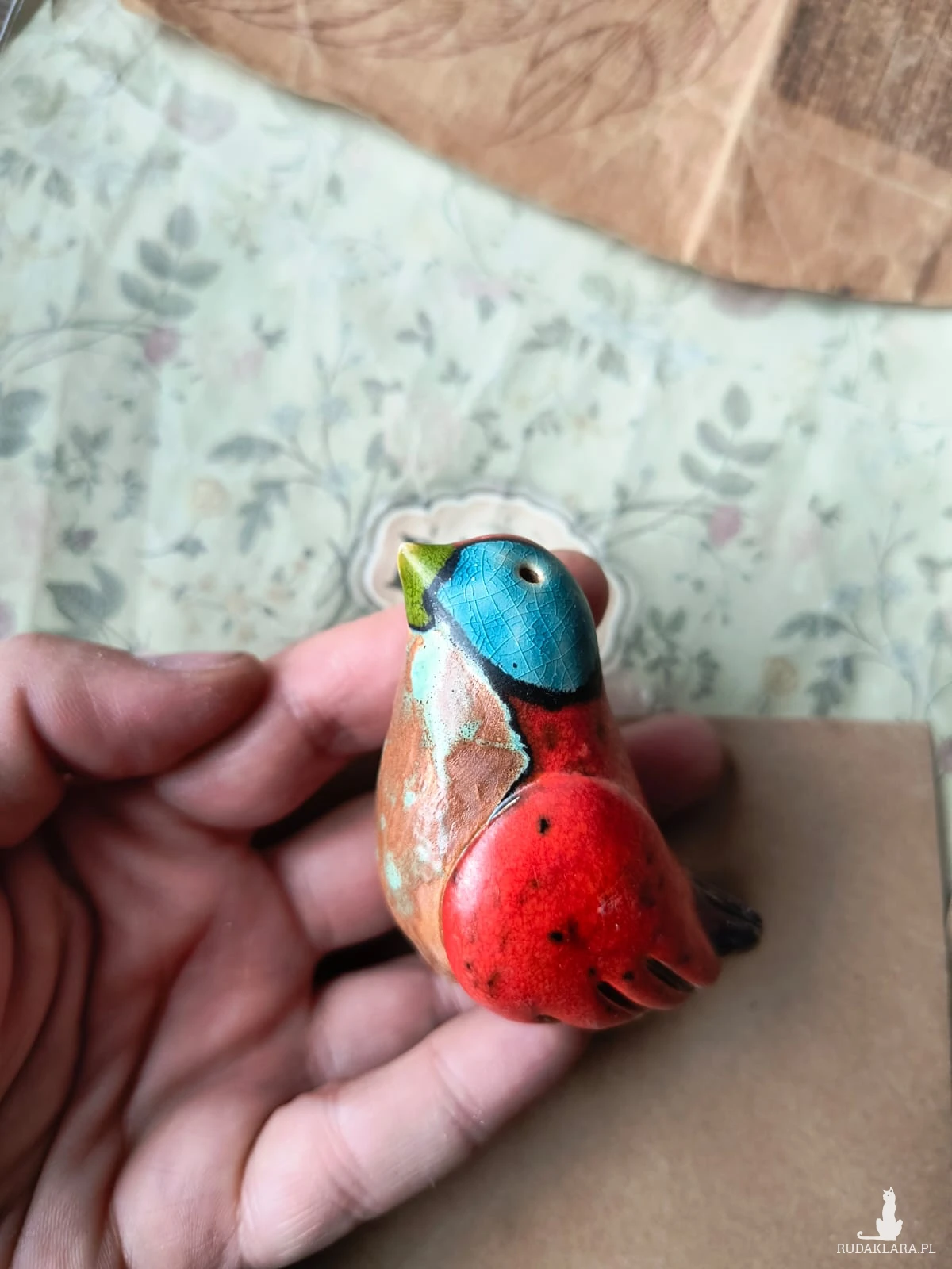 Ceramiczny ptaszek, wykonany z gliny szamotowe, wypalony na biskwit, a następnie szkliwiony w temp. ok 1260 stopni C. Wymiary 6 x 5 cm. Polecam serdecznie.
