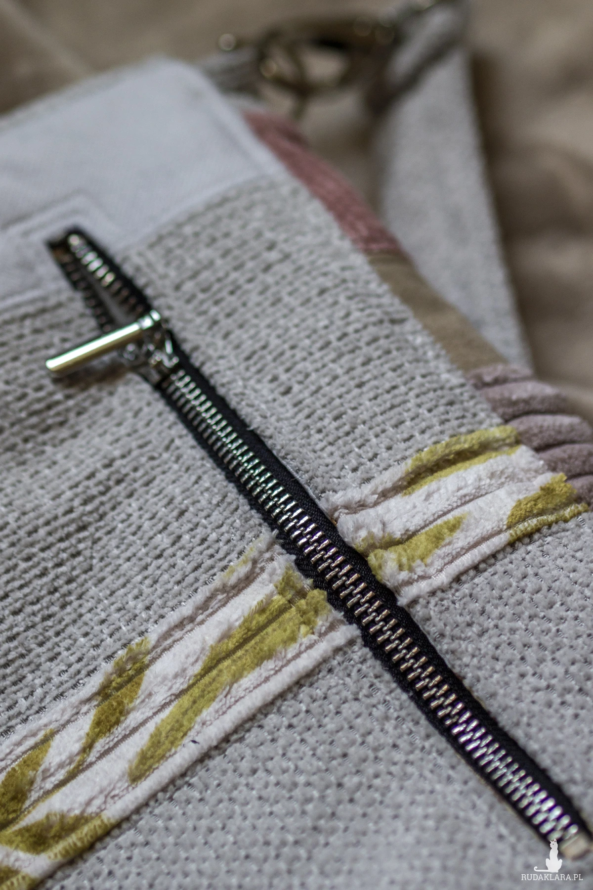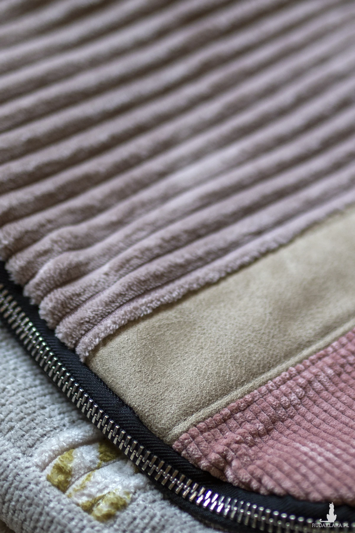 Średniej wielkości torebka listonoszka na ramię wykonana z kilku rodzajów tkanin w pudrowych barwach.