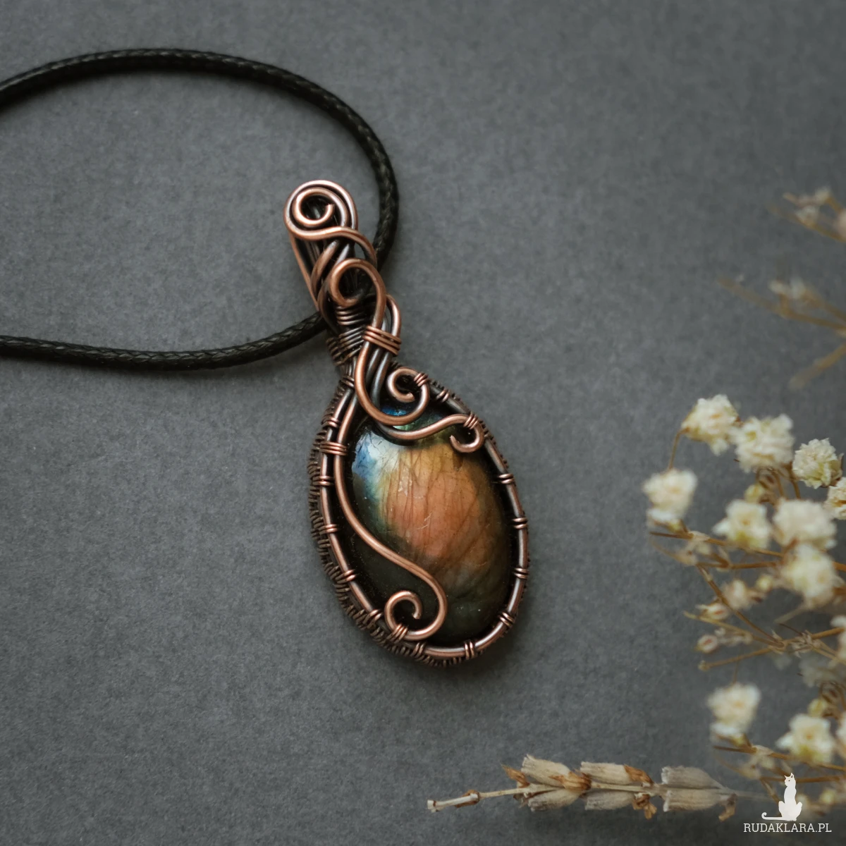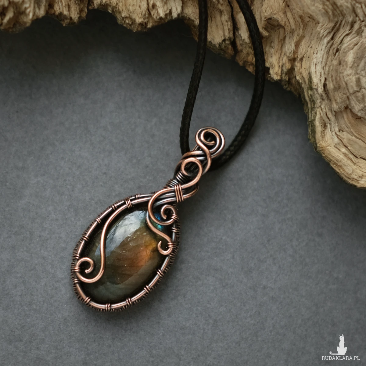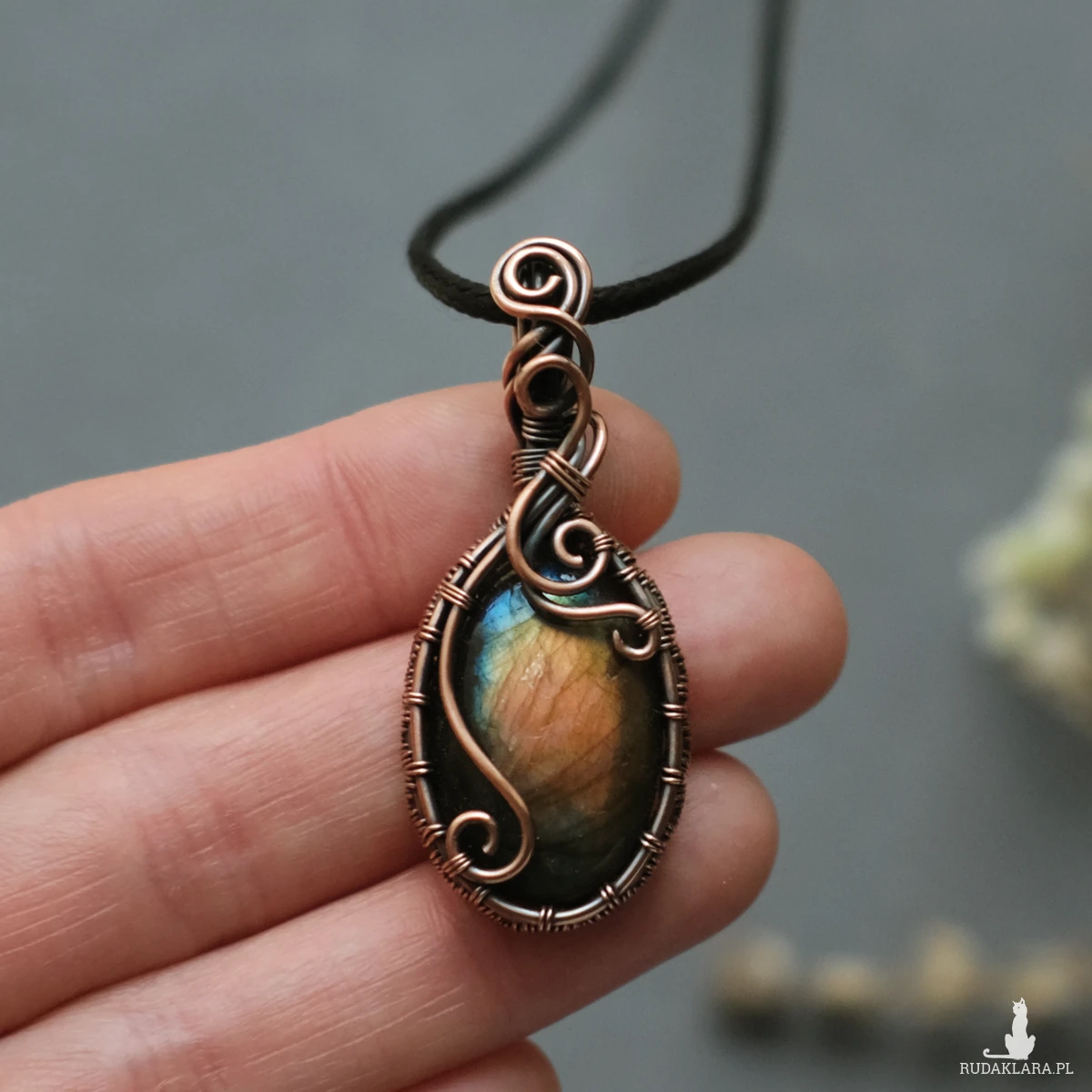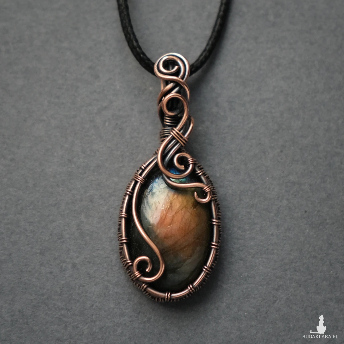 Miedziany wisiorek mieści w sobie kamień labradorytu o pięknej brzoskwiniowo-żółtej iryzacji, z domieszką błękitu. Posiada ozdobne boczki i fantazyjne sploty miedzianego drutu. Wisiorek jest unikatem, doda Twojej stylizacji oryginalności :-)