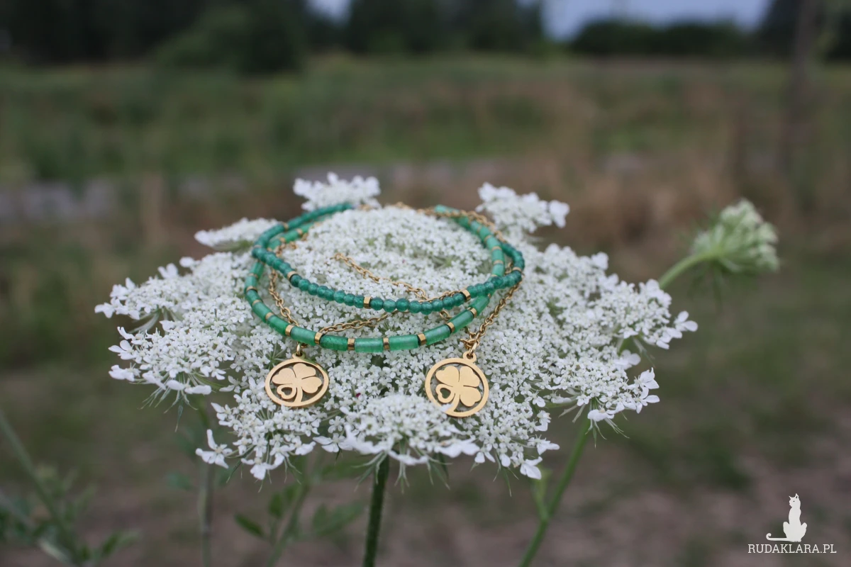 Bransoletka z dwóch sznurów zielonych naturalnych kamieni oraz dwóch łańcuszków ze stali szlachetnej, na których zawiesiłam symbole szczęścia- koniczynki. Doskonała na prezent. Zielone kamienie to chalcedon o kształcie walca oraz fasetowane kuli z jadeitu.