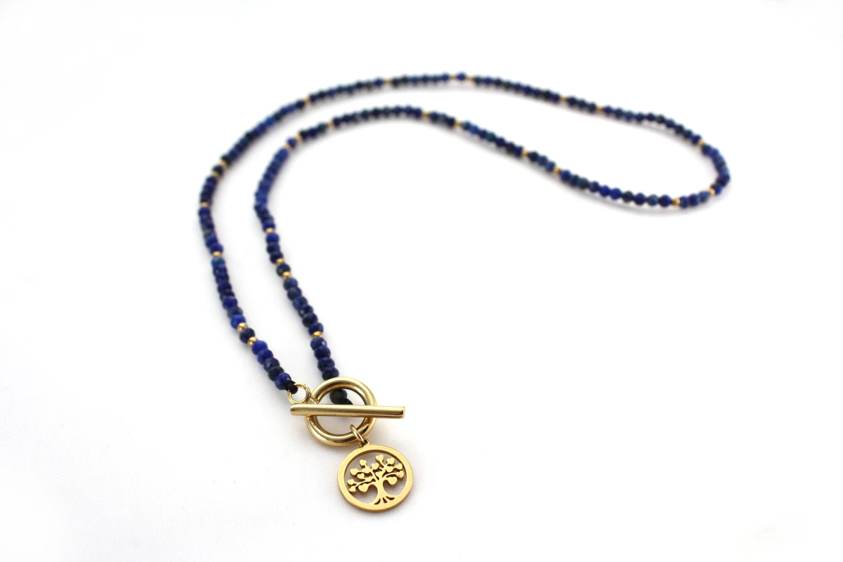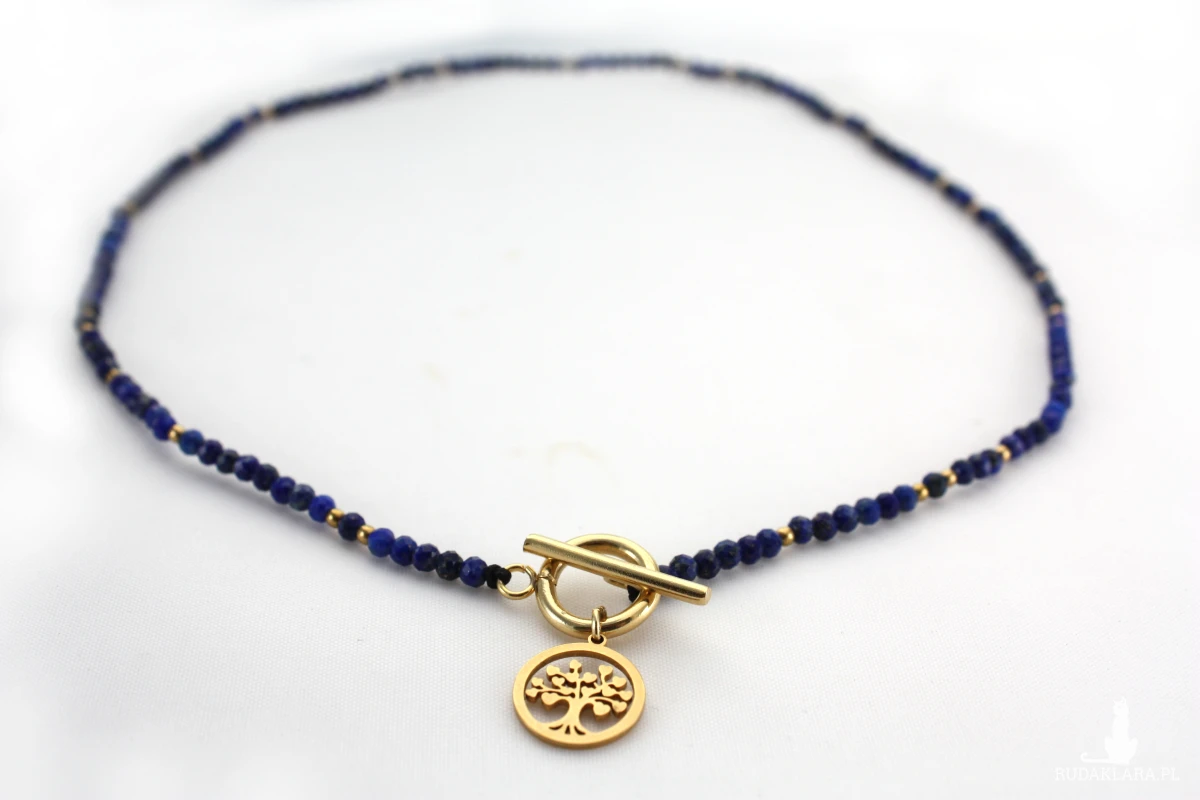 Naszyjnik z wygodnym zapięciem Toggle wykonany z fasetowanego kamienia lapis-lazuri w kolorze głęboko niebieskim z charakterystycznymi dla tego kamienia wtrąceniami z pirytu. Lapis jest symbolem: prawdy, mądrości, spokoju i odwagi. Jest doskonałym dodatkiem do letniej stylizacji.