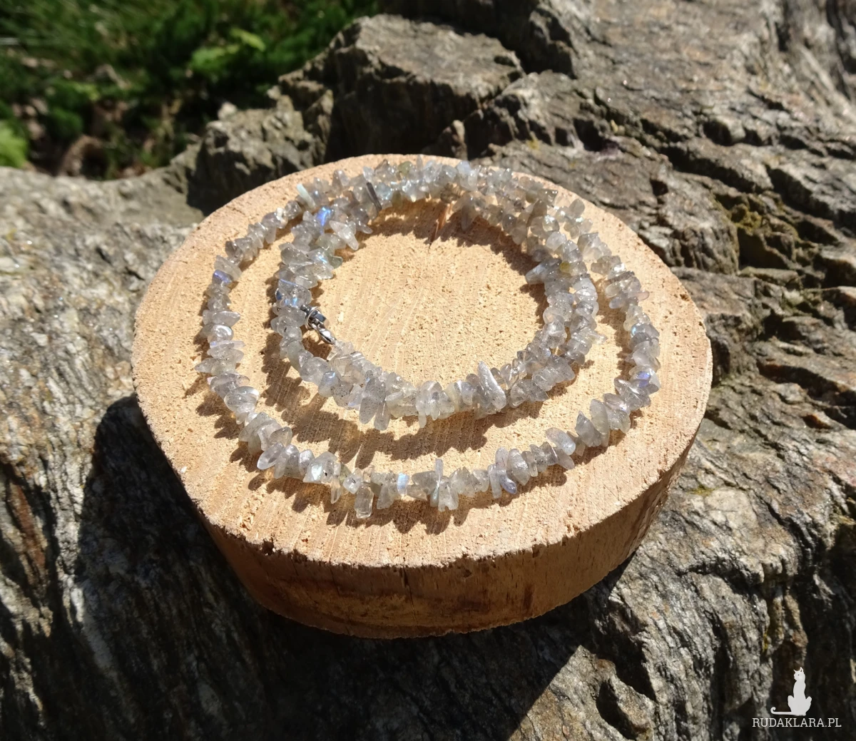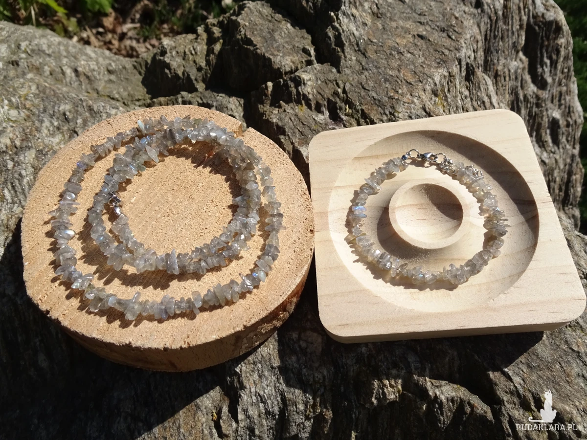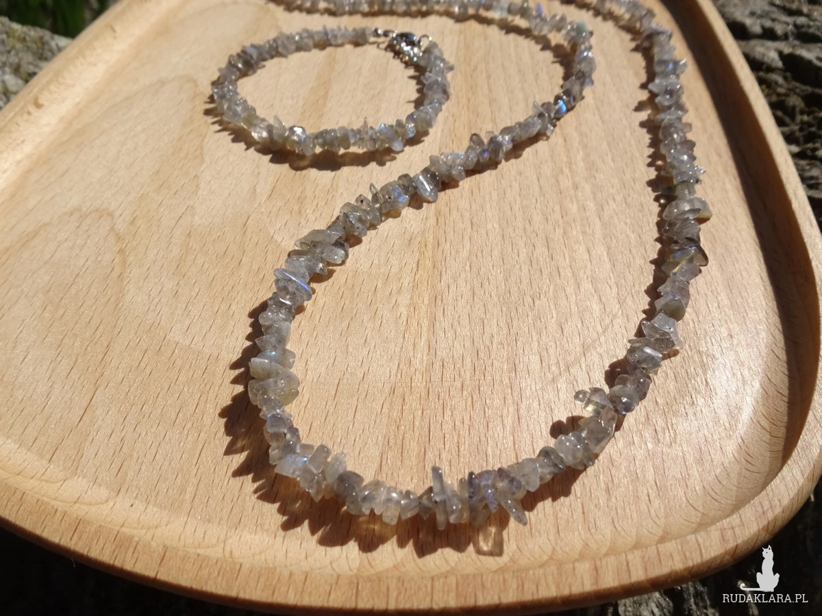 Komplet z sieczki labradorytu wielkości 3-5mm i elementów ze stali szlachetnej. W komplecie długi naszyjnik i bransoletka z zapięciem.Długość naszyjnika – 64cm, bransoletki – 17,5cm + przedłużka 3cm. Kamienie z bardzo wyraźnym efektem labradoryzacji – mienią się wszystkimi kolorami tęczy (m.in. niebieskim, zielonym i złotym).