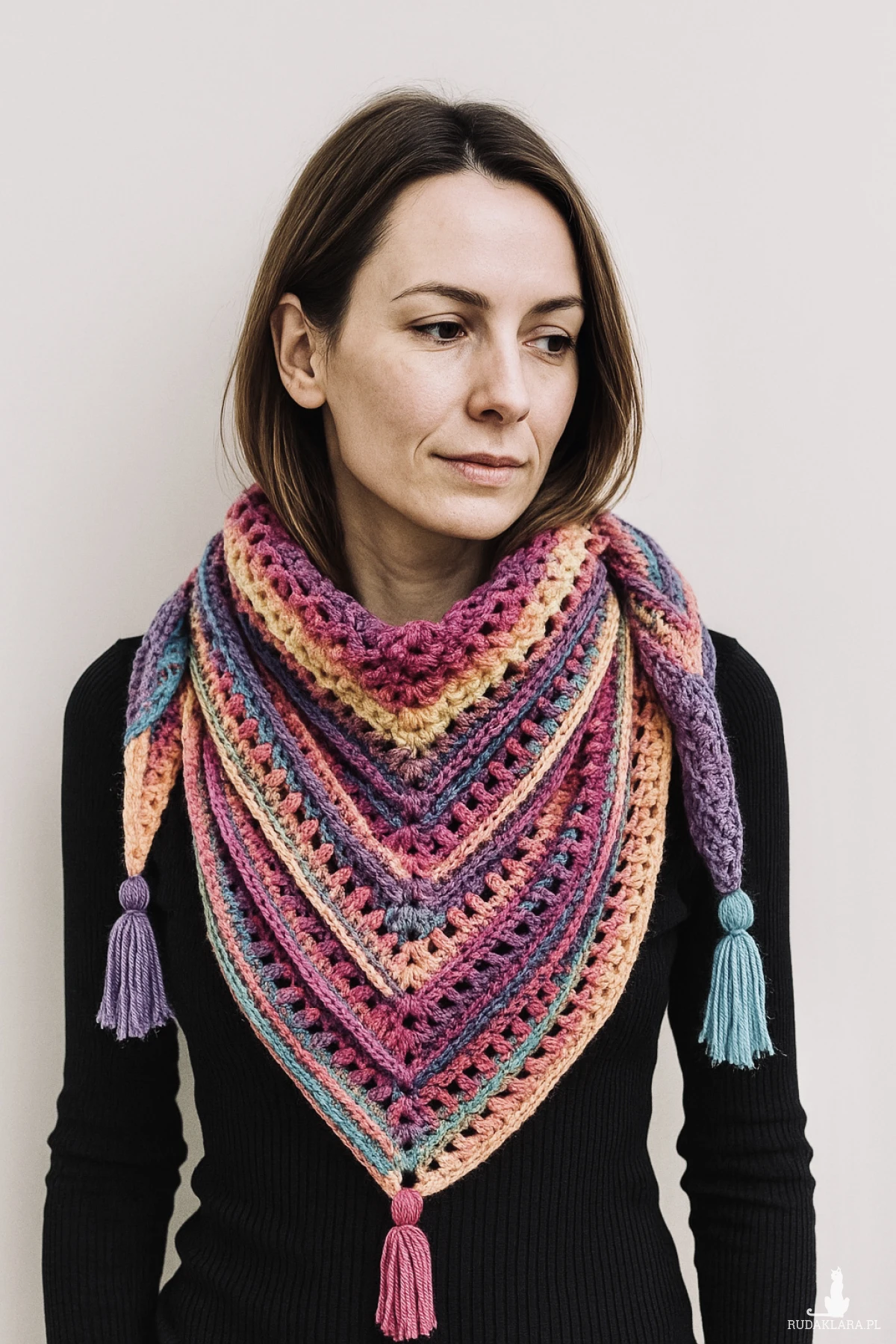 Chusta pasuje do różnorodnych stylizacji, można ją nonszalancko zarzucić na ramię lub swobodnie zamotać wokół szyi, co wprowadza luźniejszy, casualowy charakter oraz daje ciepło w chłodne dni.
