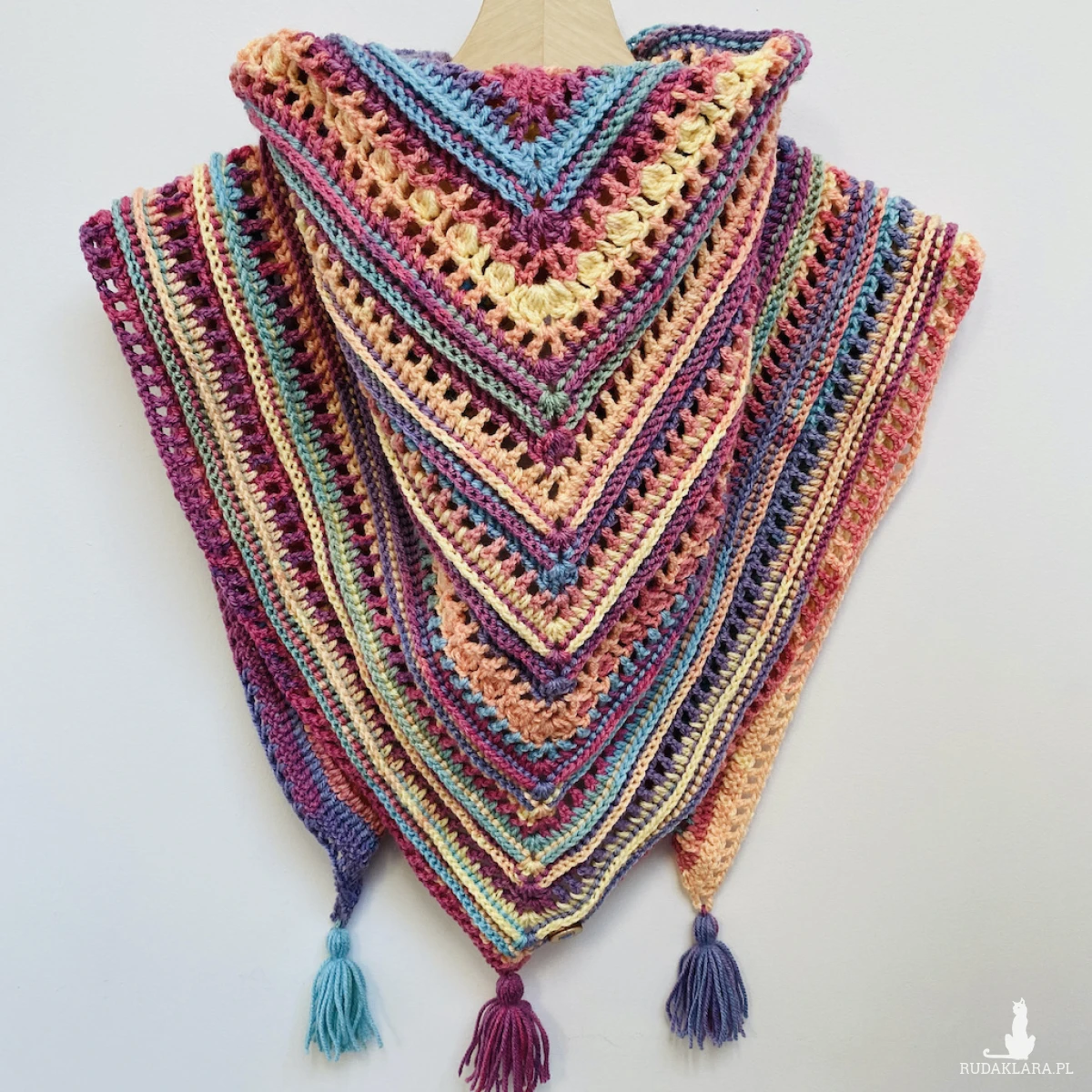 Chustę wykonałam na szydełku z miękkiej włóczki akrylowej, która zachwyca intensywnością koloru i delikatnością. Certyfikat OEKO-TEX® Standard 100 potwierdza, że jest bezpieczna dla a zdrowia materiały użyte do jej produkcji są wolne od szkodliwych substancji chemicznych.