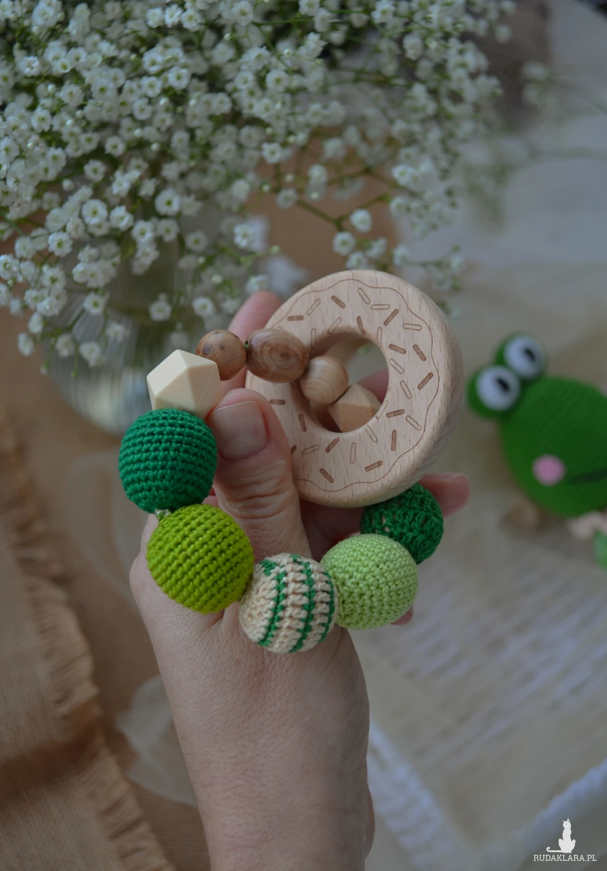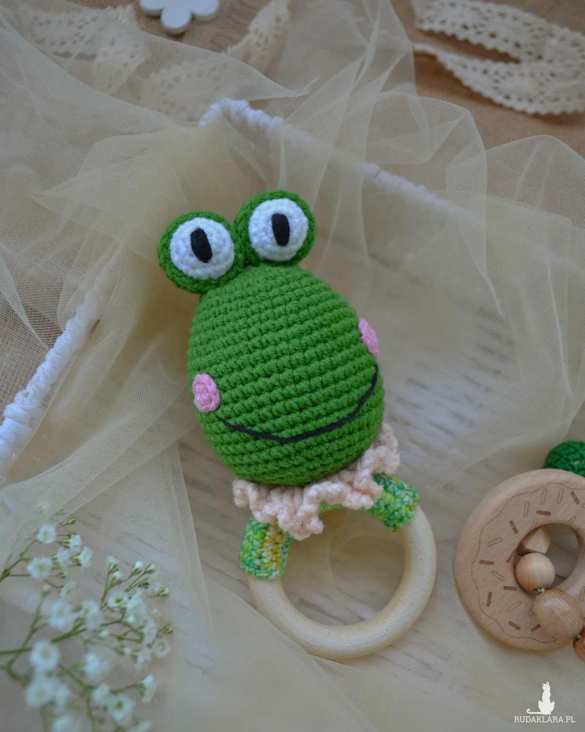 GRZECHOTKA żabka jest wyszydełkowana na drewnianym kółku bukowym z włóczki pół bawełnianej - miękkiej i przyjemnej w dotyku.