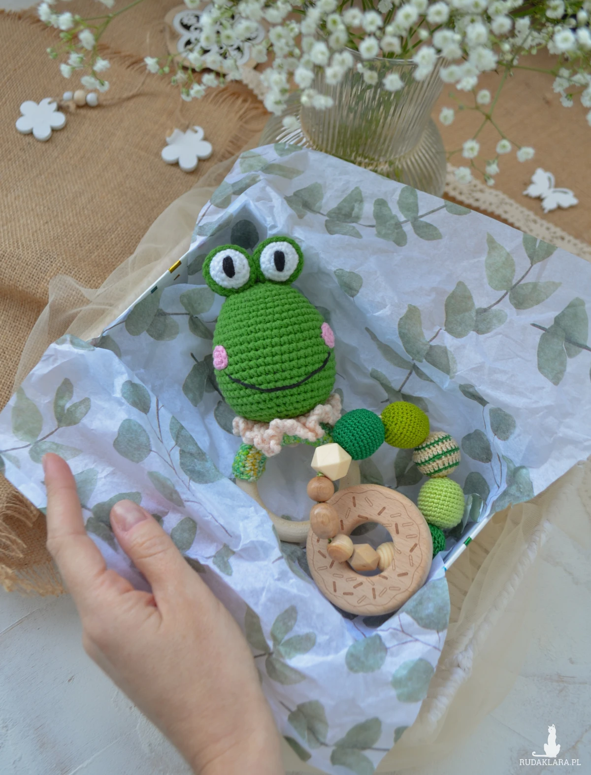 - grzechotki żabki na drewnianym kółku, gryzaka koralikowego (slingobranzoletka), pudełeczka prezentowego z wypełnieniem papierowym, dekorowane wstążką