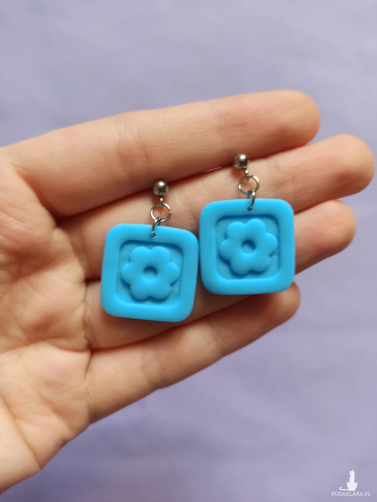 Kolczyki wiszące w kształcie kwadratów z kwiatkami w środku. W neonowym odcieniu niebieskiego.