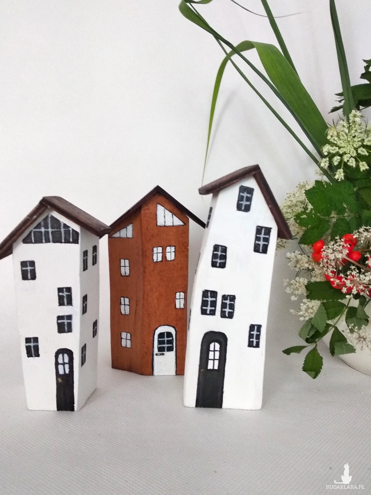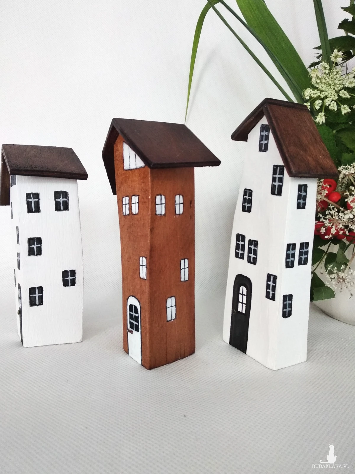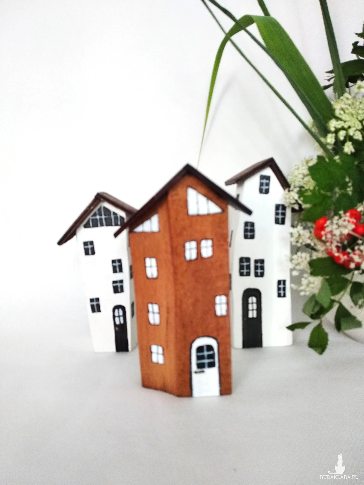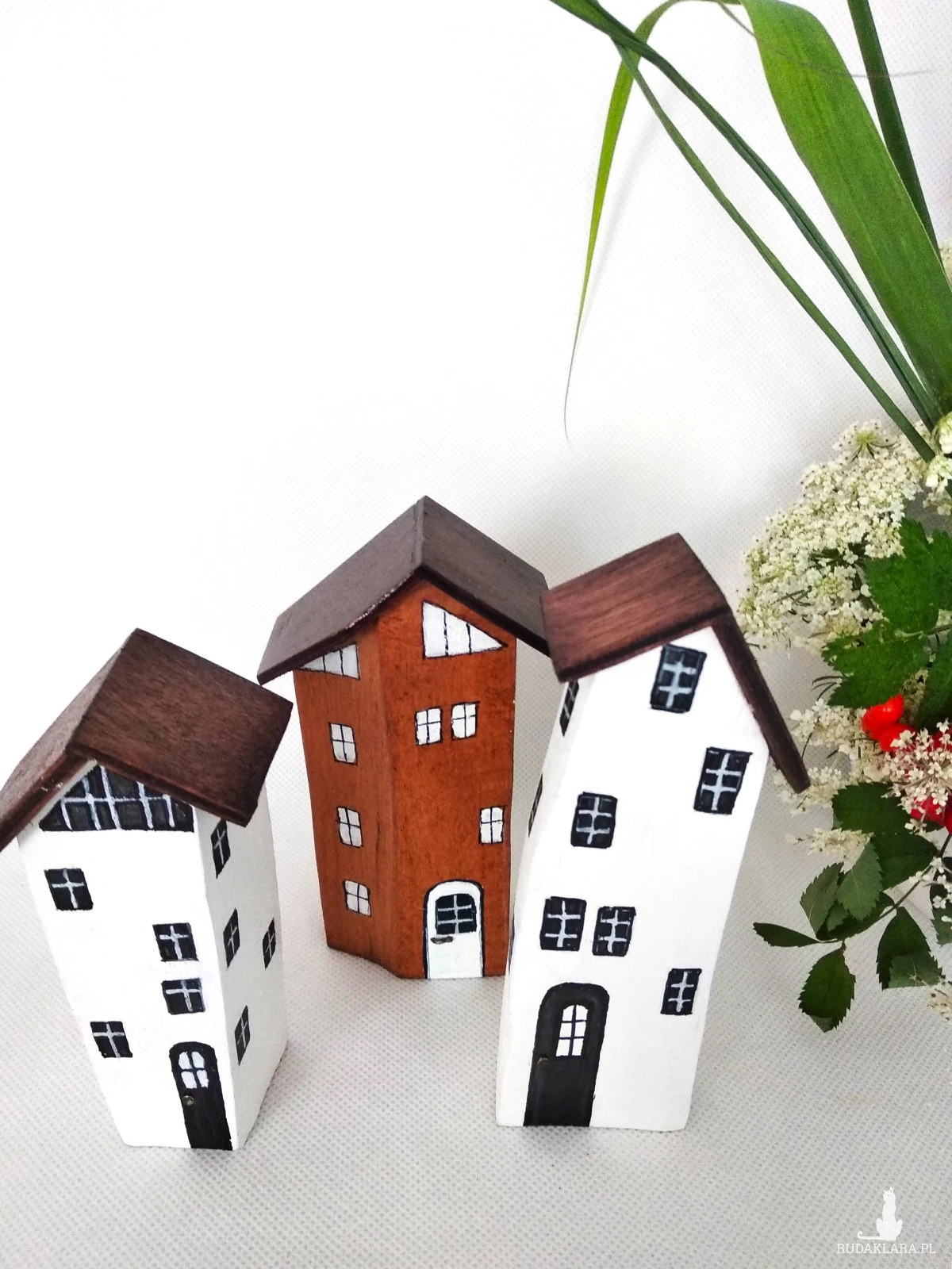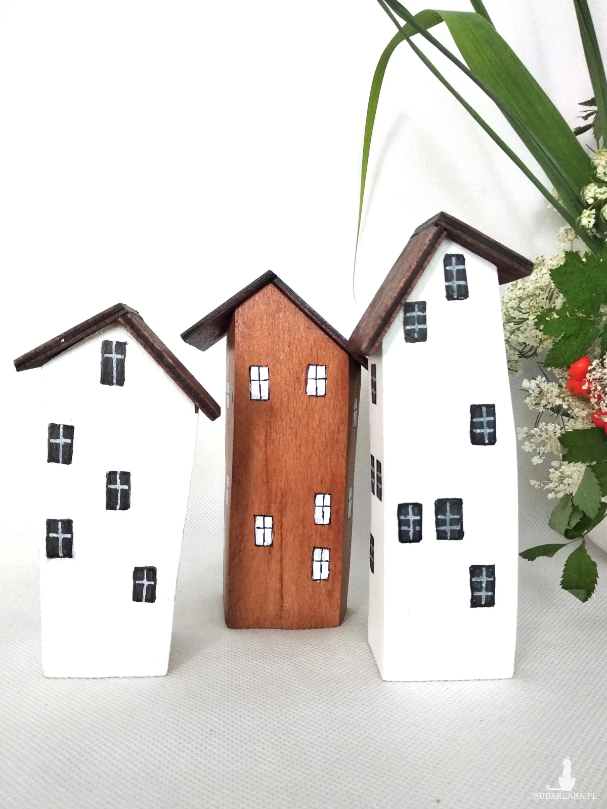 Trzy dekoracyjne domki wykonane z drewna bukowego. Dwa domki malowane są akrylową białą farbą a pozostały lekko zabarwione bejcą wodną i zabezpieczone akrylowym satynowym lakierem. Dachy domków barwione bejcą wodną i zabezpieczone lakierem. Domki posiadają okienka z każdej strony, dlatego można je ustawić w dowolnej konfiguracji. Nieregularny kształt domków wynikający z naturalnego ułożenia słojów, nadaje im ciekawego i niepowtarzalnego wyglądu. Domki są bardzo oryginalną ozdobą każdego wnętrza. Bardzo ładnie prezentują się na parapecie okna, komodzie, półce i w każdym innym miejscu.
