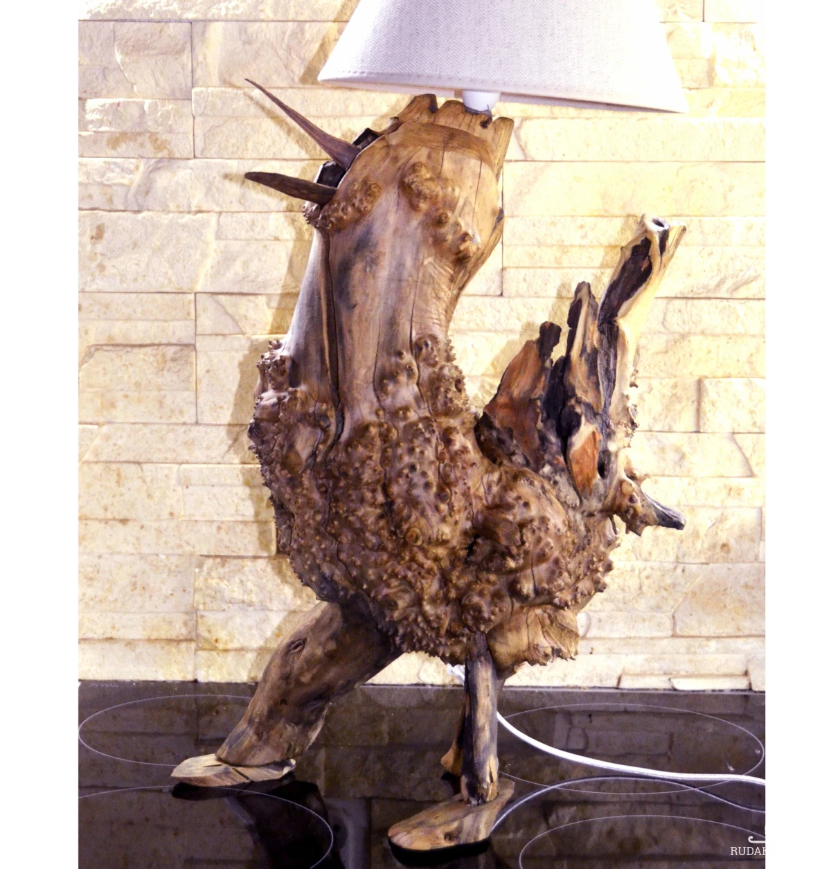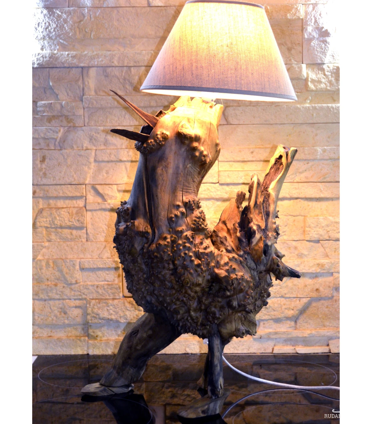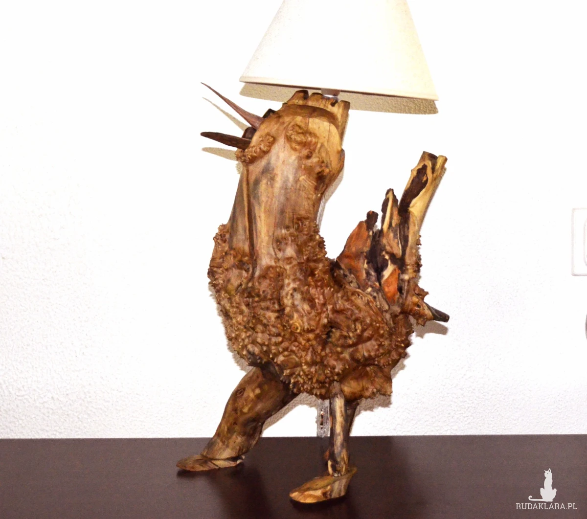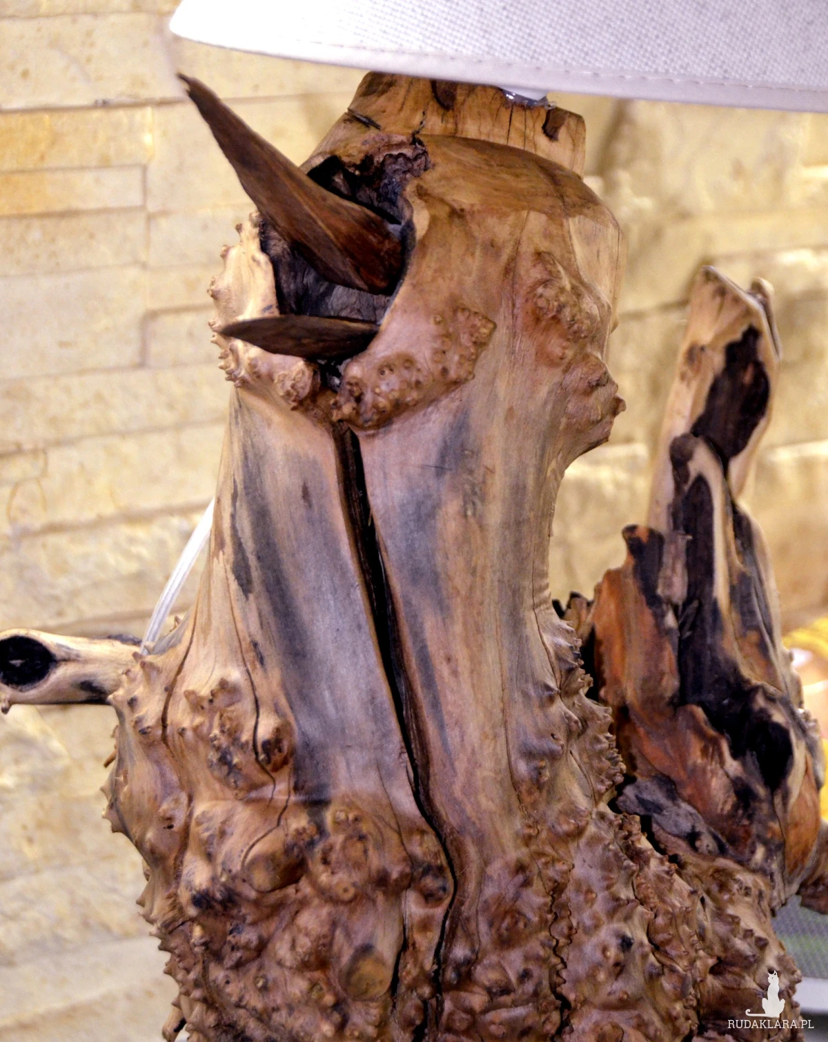 Lampa wykonana z jednego korzenia jabłoni.Wys.66 cm,szerokość 40 cm,zabezpieczona olejowoskiem.Abażur bawełniany,żarówka led.
