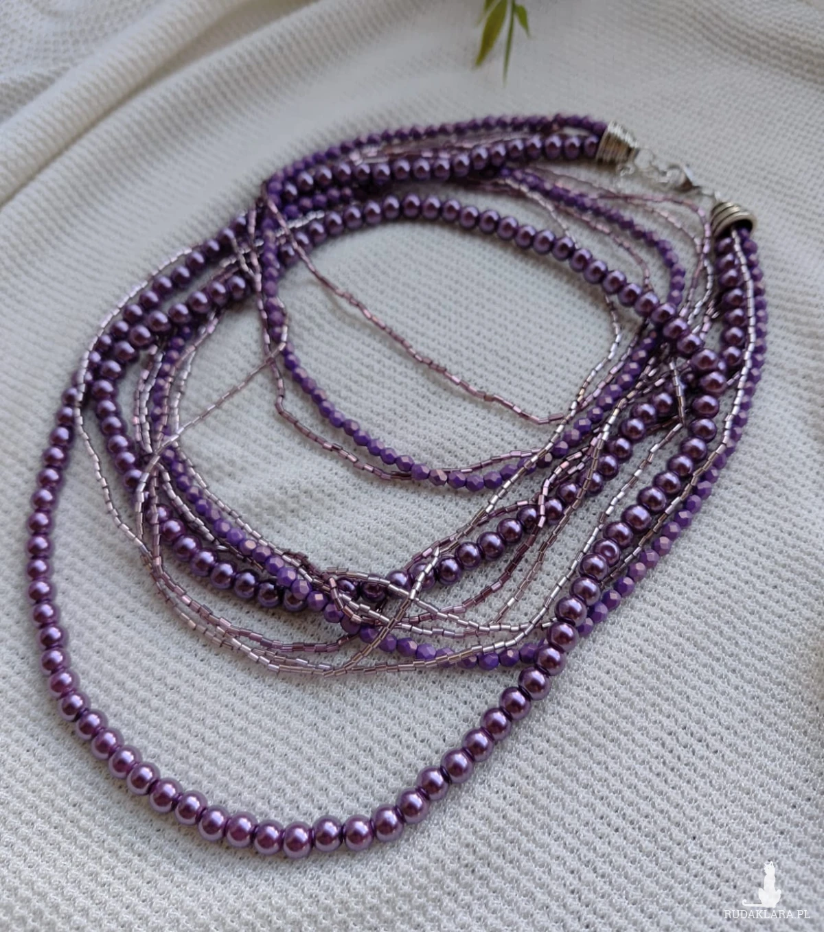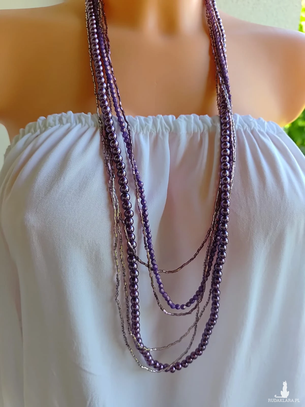 Naszyjnik długi z zapięciem, koraliki perłowe szklane w fioletowym kolorze i szklane 2 mm rurki w podobnym kolorze, czeskie koraliki fasetowane, całość lekka, długość najdłuzszego sznura 45 cm plus łańcuszek, końcówki metalowe, zapięcie ze stali nierdzewnej