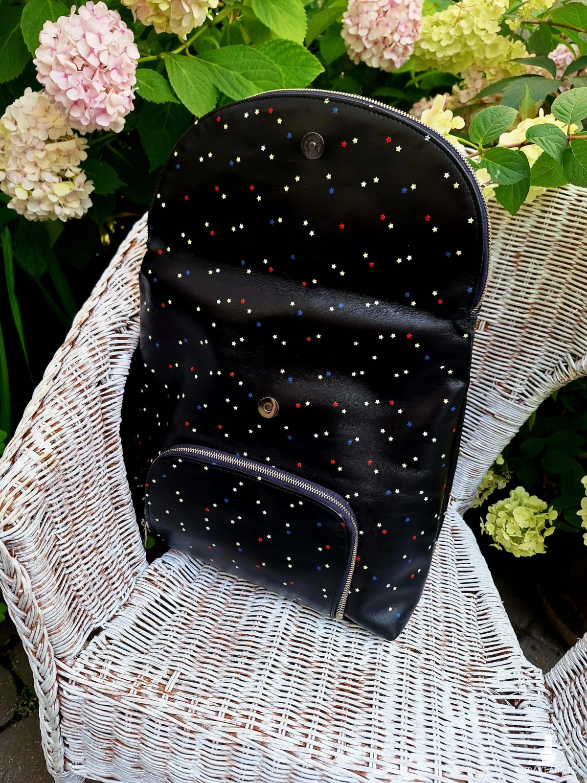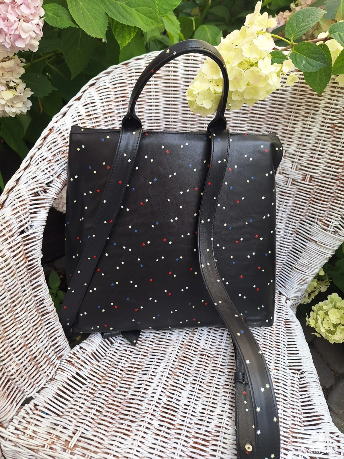 UNIKATOWY TORBO - PLECAK z czarnej skóry bydlęcej w malutkie czerwone, niebieskie i białe gwiazdeczki.