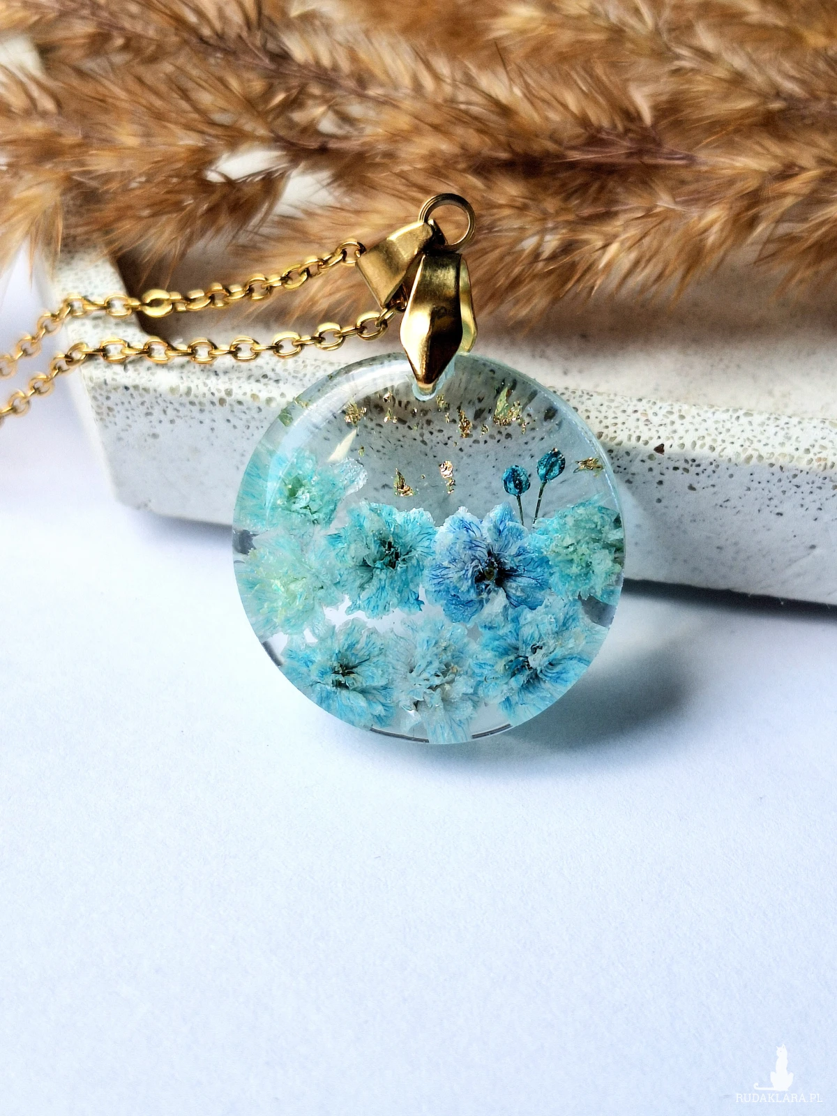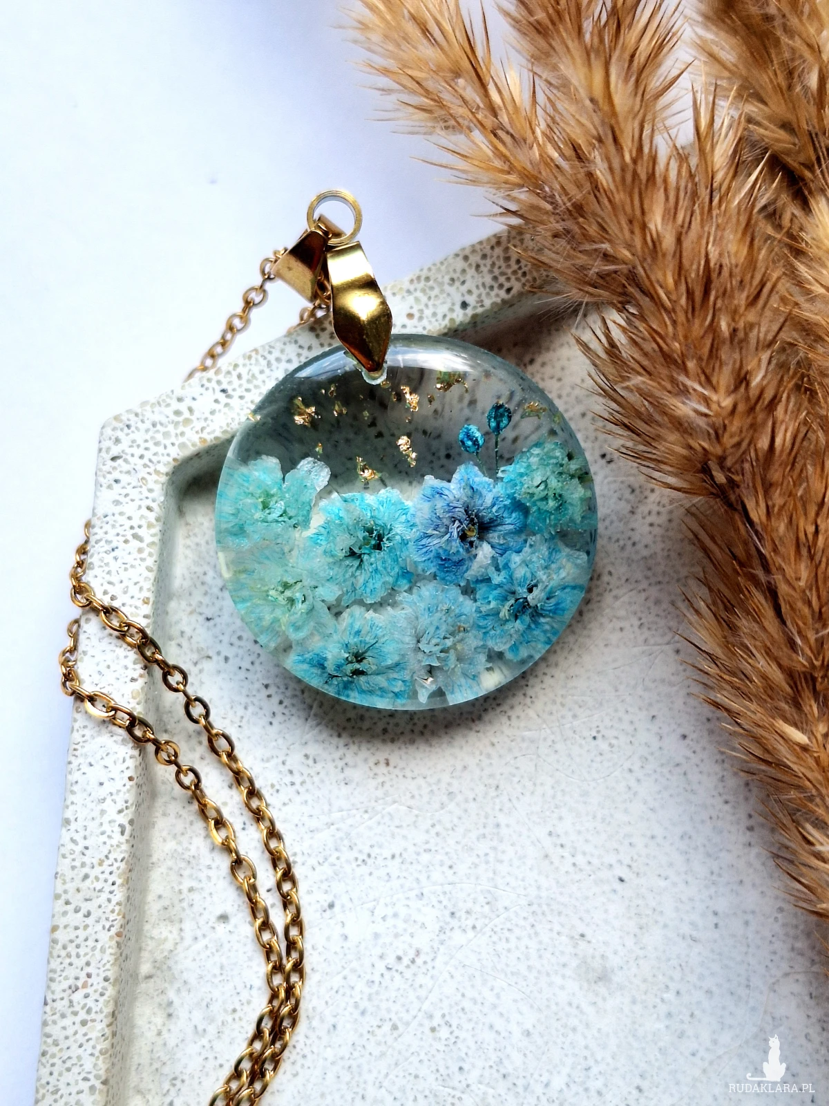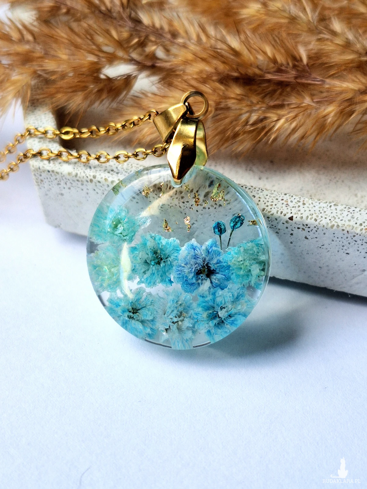 Uroczy wisiorek z zatopionymi kwiatami błękitnej gipsówki i płatkami złota. Wykonany z wysokiej klasy żywicy, która nie zmienia koloru pod wpływem promieniowania uv oraz wysokiej jakości stali chirurgicznej.