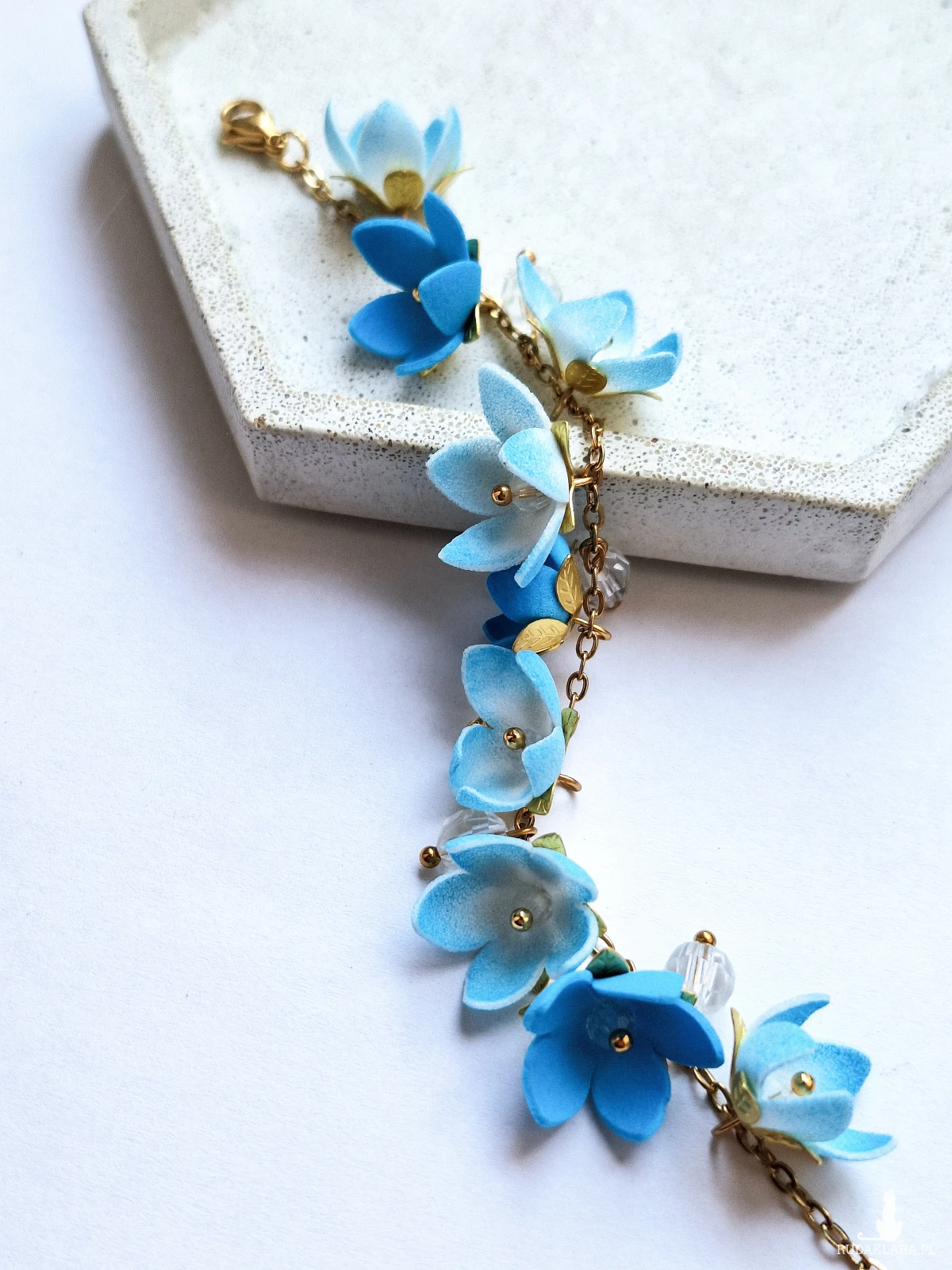 Zachwycająca bransoletka w formie kaskady kwiatów w odcieniach błękitu i błyszczących kryształków. Każdy element został starannie wykonany ręcznie.