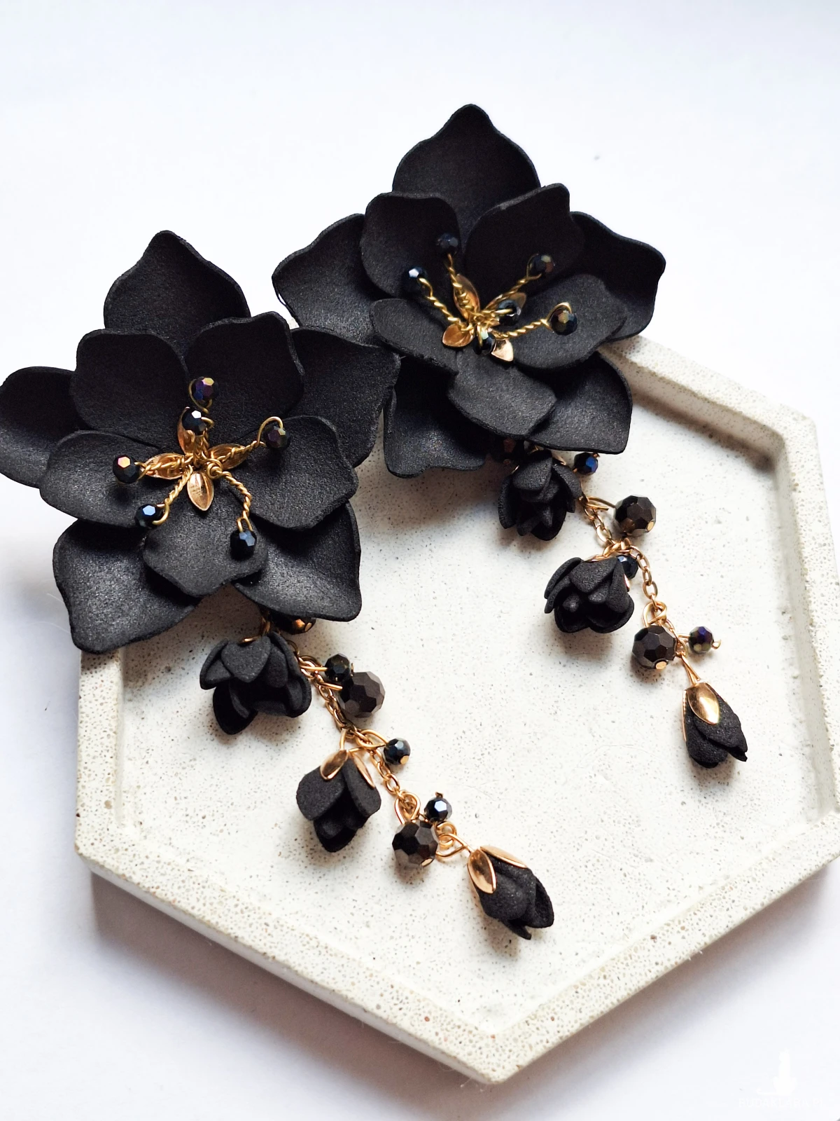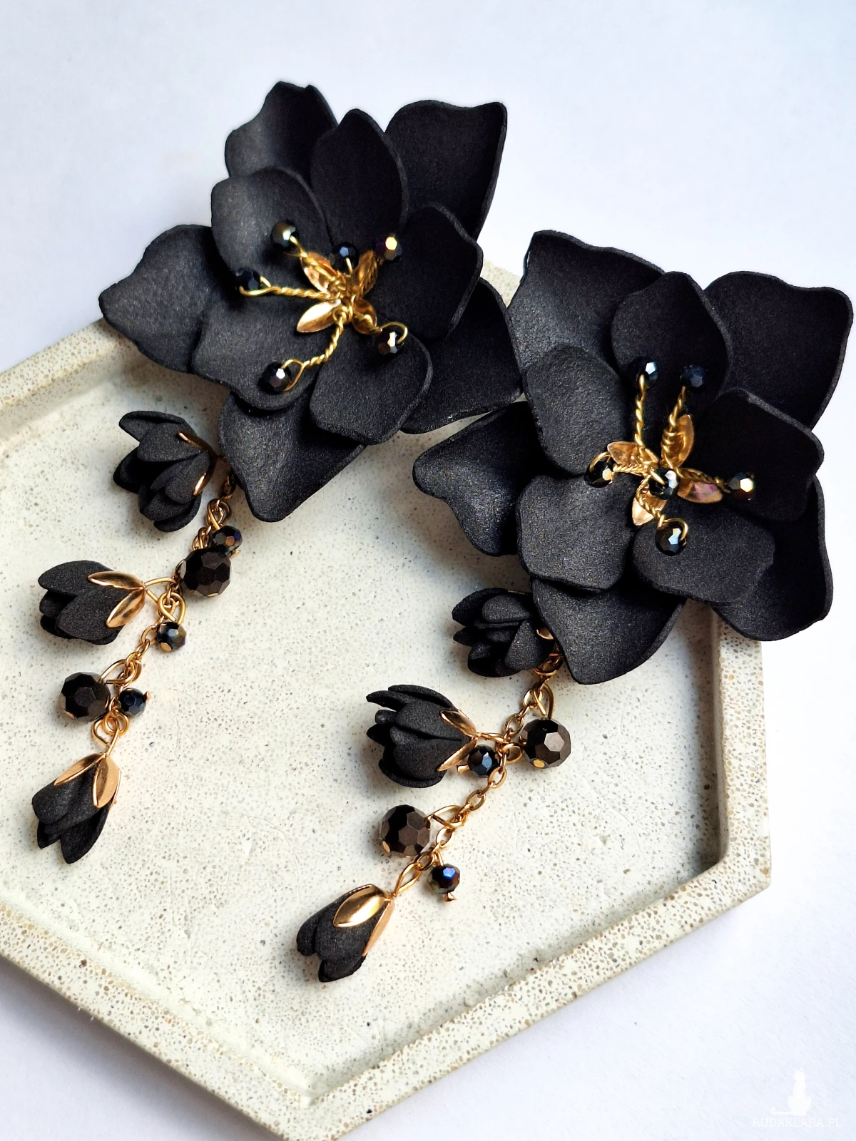 Trójwymiarowe kwiaty zostały stworzone z lekkiego, aksamitnego foamiranu – dzięki temu kolczyki są nie tylko spektakularne, ale też niezwykle komfortowe w noszeniu. Kaskadowe zawieszki z drobnych koralików i złotych elementów nadają im ruch i elegancką lekkość.