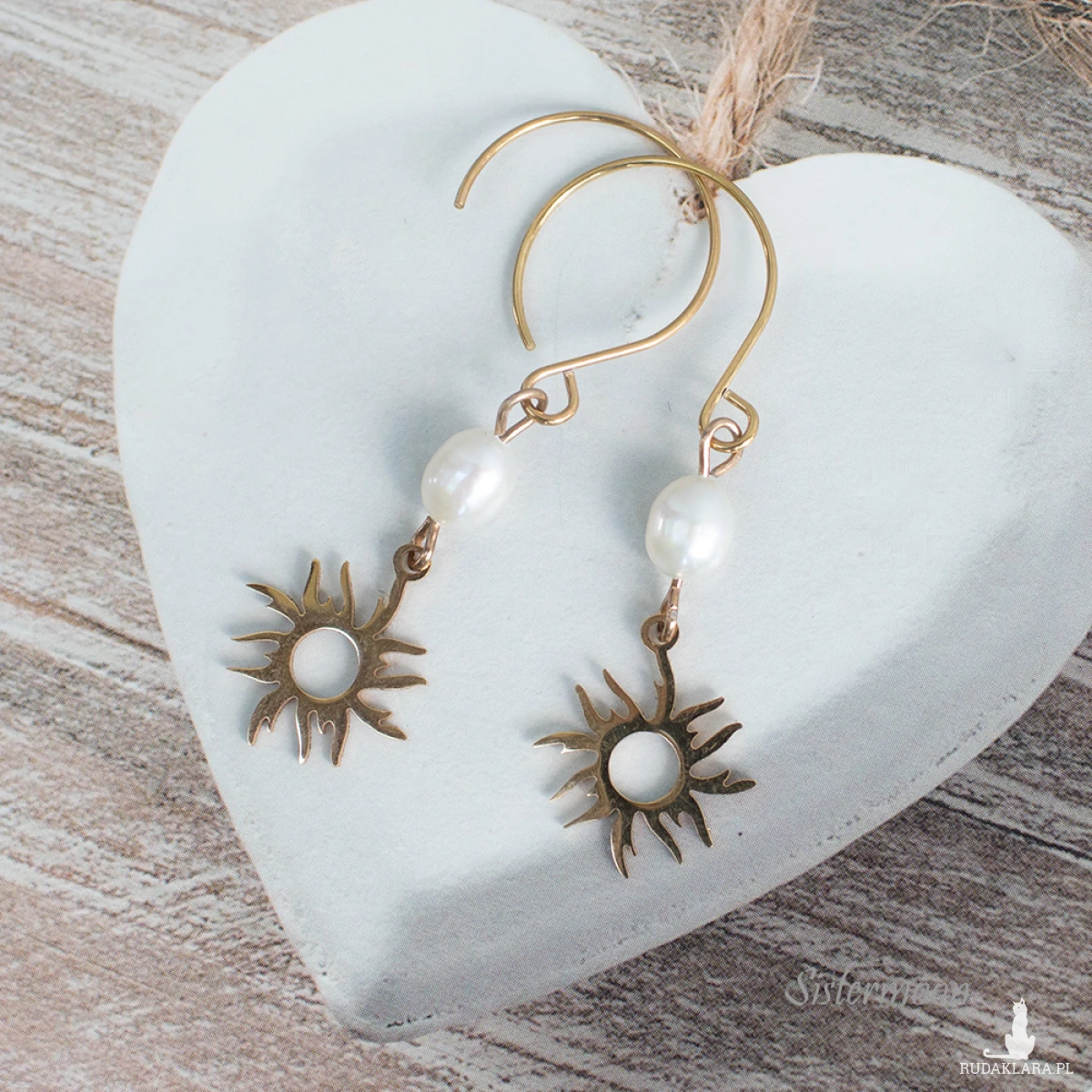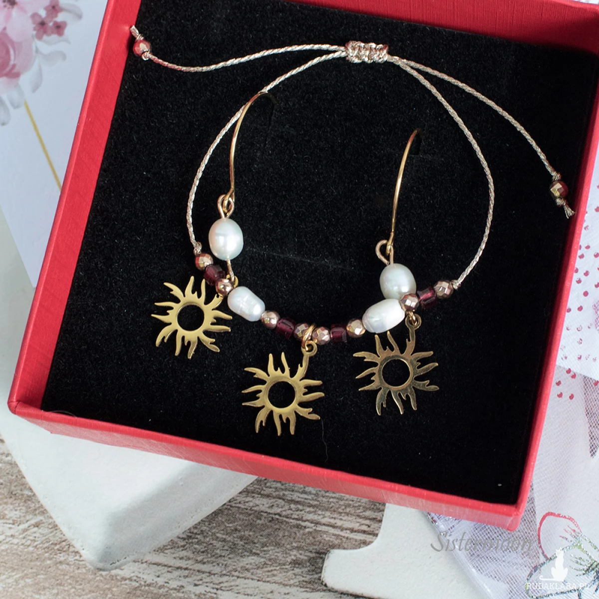 Komplet bransoletka i kolczyki Słońce, supermodny element roku 2025. Kolczyki lekkie i delikatne, z perełkami rzecznymi, hematytami i granatami, na bazie stali szlachetnej. Bransoletka na bazie złotego metalicznego sznureczka, z przesuwnymi zapięciami makramowymi (węzeł przesuwny):