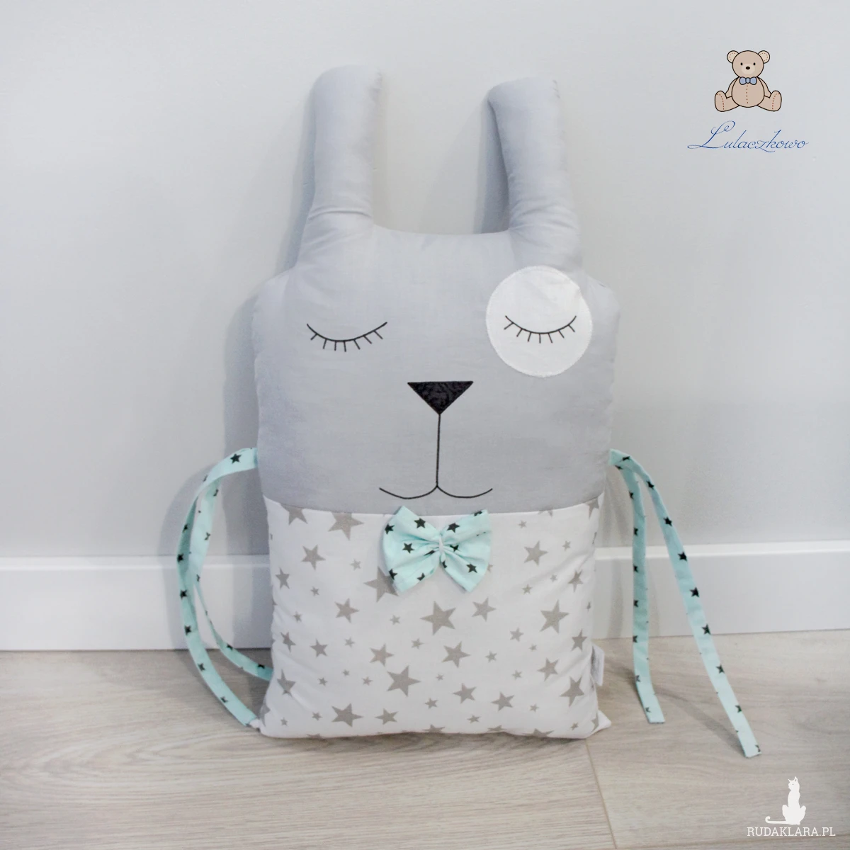 Poduszka ozdobna dziecięca w kształcie króliczka, moduł do ochraniacza modułowego do łóżeczka dziecięcego. Dostępna w wielu wariantach kolorystycznych. Oferta dotyczy pojedynczej sztuki z troczkami do wiązania bądź bez. Podusia uszyta jest z 100% bawełny i wypełniona antyalergiczną kulką silikonową. Oczka i nosek malowane wodoodpornym markerem do tkanin. Może być zarówno śliczną ozdobą dziecięcego pokoju, ochroną dla dziecka, jak również przytulanką.